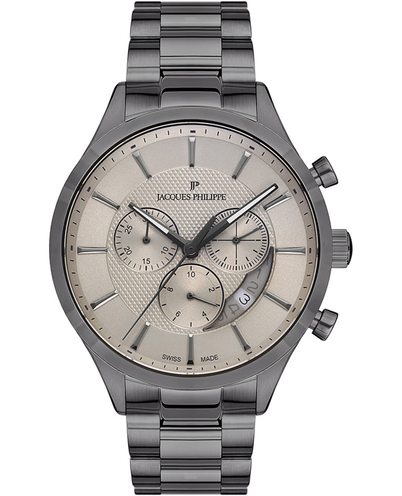 Часы Jacques Philippe JPQGC0383X7 из коллекции Gallant — элегантные мужские часы, сочетающие в себе швейцарское качество и современный дизайн. Корпус диаметром 43 мм выполнен из нержавеющей стали с серым PVD-покрытиемPVDУльтратонкое покрытие наносится в технике вакуумного напыления, сочетает в себе нитрид титана особой прочности со слоем золота или оксида хрома. Несёт в себе декоративную или защитную функцию., а серый циферблат защищён сапфировым стекломСапфировое стеклоПрочный и надёжный материал из кристалла сапфира синтетического происхождения, характеризующийся особой твёрдостью и устойчивостью к царапинам и повреждениям..