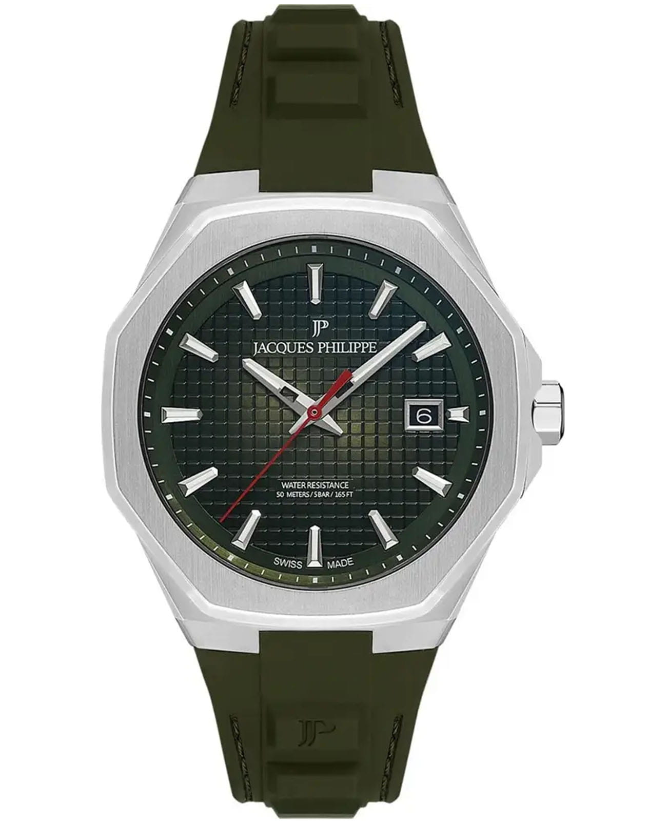 Швейцарские мужские часы Jacques Philippe Octagon JPQGS3814XX, кварцевый механизм с высокой точностью. Сапфировое стеклоСапфировое стеклоПрочный и надёжный материал из кристалла сапфира синтетического происхождения, характеризующийся особой твёрдостью и устойчивостью к царапинам и повреждениям. устойчивое к появлению царапин, обладающее высокой прозрачностью. Корпус часов изготовлен из нержавеющей стали 316L. Стрелки и метки с люминесцентным покрытиемЛюминесцентное покрытиеПозволяет считывать показания времени в темноте. Производители наносят на стрелки, часовые индексы, безель или поверхность циферблата светонакопительный состав, дающий холодное свечение.. Окошко даты находится в положении 3 часов. Класс водозащиты: 50 метров, позволит защитить корпус от случайных брызг или капель дождя. Силиконовый ремешок на стандартной застёжке.