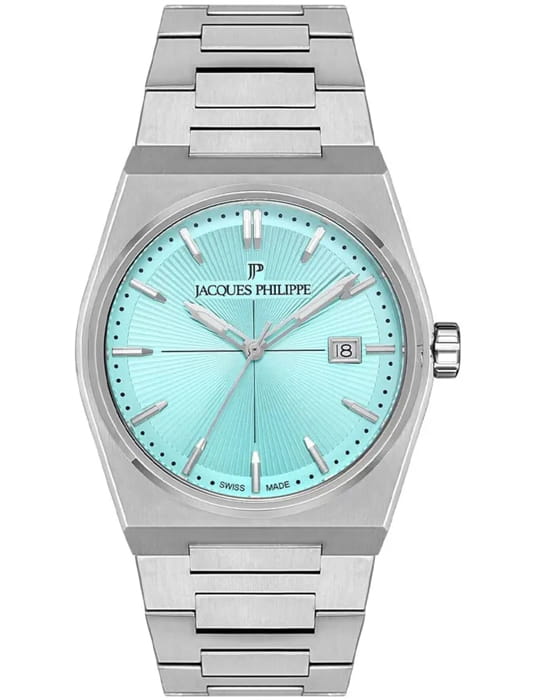 Швейцарские мужские часы Jacques Philippe Aurora JPQGS4213X6LG, кварцевый механизм с высокой точностью. Сапфировое стеклоСапфировое стеклоПрочный и надёжный материал из кристалла сапфира синтетического происхождения, характеризующийся особой твёрдостью и устойчивостью к царапинам и повреждениям. устойчивое к появлению царапин, обладающее высокой прозрачностью. Корпус часов изготовлен из нержавеющей стали 316L. Класс водозащиты: 50 метров, позволит защитить корпус от случайных брызг или капель дождя. Стальной браслет на застёжке-бабочке с кнопкамиЗастёжка "бабочка"Такой вид застёжки дополняется предохранителями, помогающими избежать случайного раскрытия браслета. Обладают изящным исполнением. . Окошко даты находится в положении 3 часа. Стрелки и метки с люминесцентным покрытиемЛюминесцентное покрытиеПозволяет считывать показания времени в темноте. Производители наносят на стрелки, часовые индексы, безель или поверхность циферблата светонакопительный состав, дающий холодное свечение..