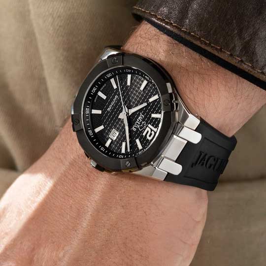 Мужские швейцарские часы Jaguar Diplomatic Quartz J1019/2. Кварцевый швейцарский калибр Ronda 705. Сапфировое стеклоСапфировое стеклоПрочный и надёжный материал из кристалла сапфира синтетического происхождения, характеризующийся особой твёрдостью и устойчивостью к царапинам и повреждениям. устойчивое к мелким механическим повреждениям. Корпус часов изготовлен из нержавеющей стали. Стрелки и метки с люминесцентным покрытиемЛюминесцентное покрытиеПозволяет считывать показания времени в темноте. Производители наносят на стрелки, часовые индексы, безель или поверхность циферблата светонакопительный состав, дающий холодное свечение.. Окошко даты находится в положении 3 часа. Класс водозащиты: 100 метров, позволит плавать, нырять и заниматься другими водными видами спорта. Силиконовый ремешок на стандартной застёжке. БезельБезельВнешний ободок, закрепляющий стекло. В спортивных часах так называется поворотное кольцо с делениями на циферблате, выполняет роль таймера – замеряет отрезки времени на шкале. Неподвижный безель – элемент декора. Однонаправленно вращающийся безель на дайверских часах позволяет фиксировать моменты погружения и выныривания на поверхность. с PVD-покрытиемPVDУльтратонкое покрытие наносится в технике вакуумного напыления, сочетает в себе нитрид титана особой прочности со слоем золота или оксида хрома. Несёт в себе декоративную или защитную функцию..
