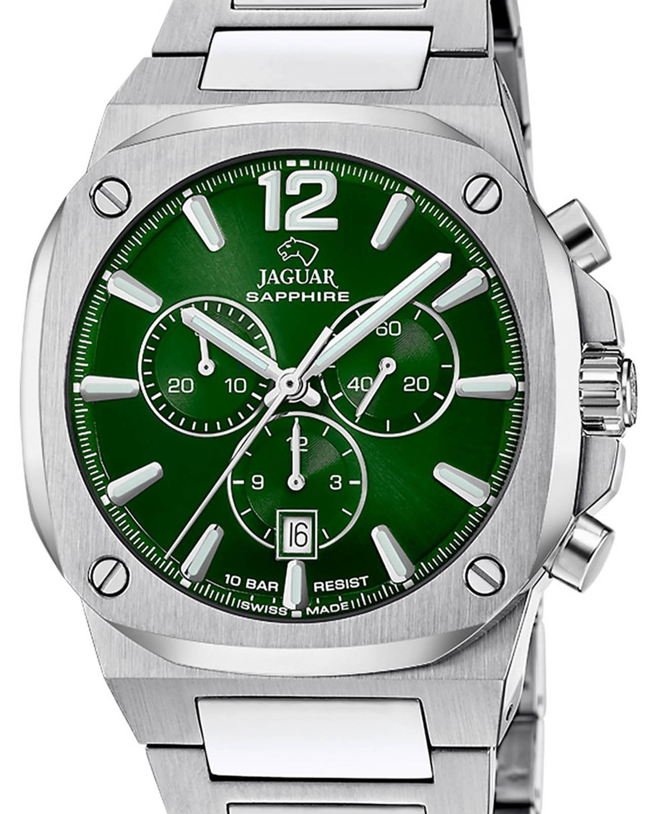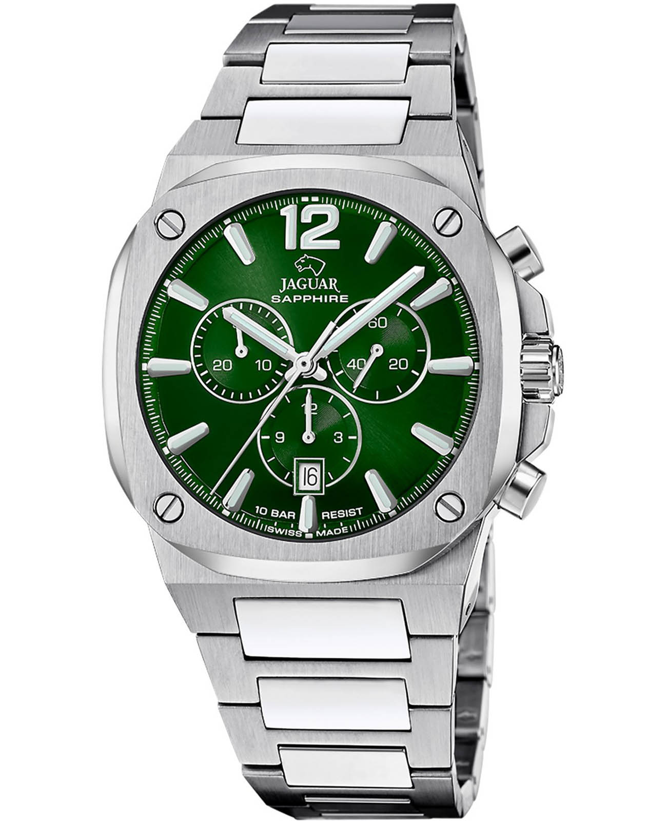 Мужские швейцарские часы-хронографХронографФункция позволяет измерять отрезки времени с особой точностью: часы, минуты, секунды. Верным признаком хронографа является наличие на циферблате 3 дополнительных окошек-счётчиков. Jaguar Rond Carre J1025/2. Кварцевый швейцарский калибр Ronda 5030d. Сапфировое стеклоСапфировое стеклоПрочный и надёжный материал из кристалла сапфира синтетического происхождения, характеризующийся особой твёрдостью и устойчивостью к царапинам и повреждениям. устойчивое к мелким механическим повреждениям. Корпус и браслет часов изготовлены из нержавеющей стали. Стрелки и метки с люминесцентным покрытиемЛюминесцентное покрытиеПозволяет считывать показания времени в темноте. Производители наносят на стрелки, часовые индексы, безель или поверхность циферблата светонакопительный состав, дающий холодное свечение.. Окошко даты находится в положении 6 часов. Класс водозащиты: 100 метров, позволит плавать, нырять и заниматься другими водными видами спорта. Стальной браслет на раскладной застёжкеРаскладная застёжкаТакой тип застёжки используется только на браслетах из металла. Она никогда не раскрывается полностью, происходит разделение на 2 и более частей. Раскладывающая застёжка снизит вероятность потери часов к минимуму..