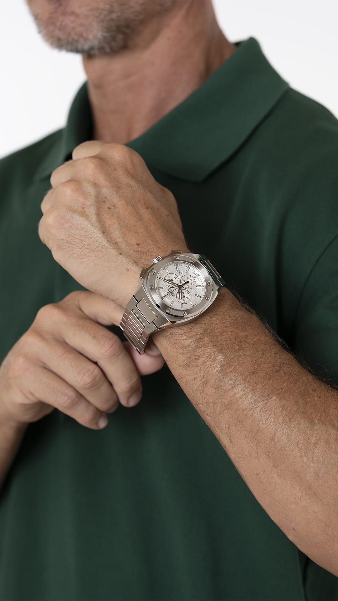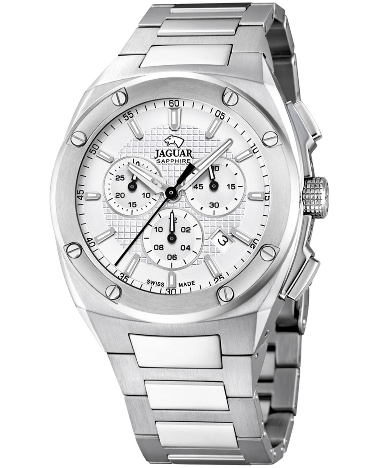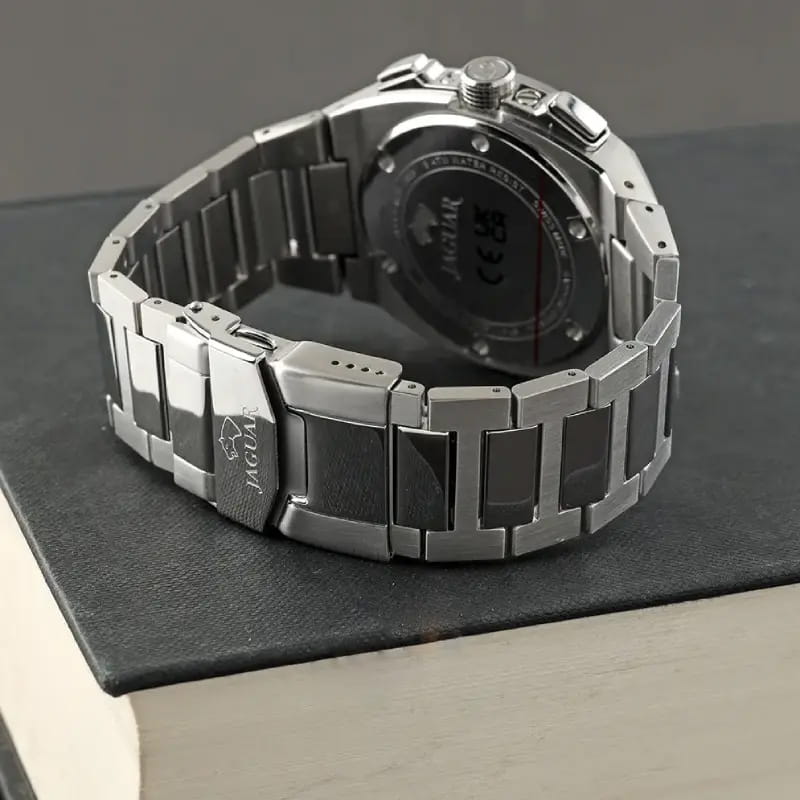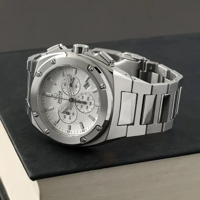 Мужские швейцарские часы-хронографХронографФункция позволяет измерять отрезки времени с особой точностью: часы, минуты, секунды. Верным признаком хронографа является наличие на циферблате 3 дополнительных окошек-счётчиков. Jaguar Executive Chrono J805/A. Кварцевый швейцарский калибр Ronda 5030d. Сапфировое стеклоСапфировое стеклоПрочный и надёжный материал из кристалла сапфира синтетического происхождения, характеризующийся особой твёрдостью и устойчивостью к царапинам и повреждениям. устойчивое к мелким механическим повреждениям. Корпус и браслет часов изготовлены из нержавеющей стали. Стрелки и метки с люминесцентным покрытиемЛюминесцентное покрытиеПозволяет считывать показания времени в темноте. Производители наносят на стрелки, часовые индексы, безель или поверхность циферблата светонакопительный состав, дающий холодное свечение.. Окошко даты находится в положении между «4» и «5 часами». Класс водозащиты: 50 метров, позволит защитить корпус от случайных брызг или капель дождя. Стальной браслет на раскладной застёжкеРаскладная застёжкаТакой тип застёжки используется только на браслетах из металла. Она никогда не раскрывается полностью, происходит разделение на 2 и более частей. Раскладывающая застёжка снизит вероятность потери часов к минимуму..