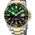 Мужские швейцарские часы Jaguar Executive Diver J863/4. Кварцевый швейцарский калибр Ronda 6003D. Сапфировое стеклоСапфировое стеклоПрочный и надёжный материал из кристалла сапфира синтетического происхождения, характеризующийся особой твёрдостью и устойчивостью к царапинам и повреждениям. устойчивое к мелким механическим повреждениям. Корпус и браслет часов изготовлены из нержавеющей стали. Стрелки и метки с люминесцентным покрытиемЛюминесцентное покрытиеПозволяет считывать показания времени в темноте. Производители наносят на стрелки, часовые индексы, безель или поверхность циферблата светонакопительный состав, дающий холодное свечение.. Окошко даты находится в положении 3 часа. Класс водозащиты: 200 метров, позволит плавать, нырять и заниматься другими водными видами спорта. Стальной браслет с частичным  PVD-покрытиемPVDУльтратонкое покрытие наносится в технике вакуумного напыления, сочетает в себе нитрид титана особой прочности со слоем золота или оксида хрома. Несёт в себе декоративную или защитную функцию. на раскладной застёжкеРаскладная застёжкаТакой тип застёжки используется только на браслетах из металла. Она никогда не раскрывается полностью, происходит разделение на 2 и более частей. Раскладывающая застёжка снизит вероятность потери часов к минимуму.. БезельБезельВнешний ободок, закрепляющий стекло. В спортивных часах так называется поворотное кольцо с делениями на циферблате, выполняет роль таймера – замеряет отрезки времени на шкале. Неподвижный безель – элемент декора. Однонаправленно вращающийся безель на дайверских часах позволяет фиксировать моменты погружения и выныривания на поверхность. с PVD-покрытиемPVDУльтратонкое покрытие наносится в технике вакуумного напыления, сочетает в себе нитрид титана особой прочности со слоем золота или оксида хрома. Несёт в себе декоративную или защитную функцию..