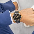 Корпус часов выполнен из нержавеющей стали с PVD-покрытиемPVDУльтратонкое покрытие наносится в технике вакуумного напыления, сочетает в себе нитрид титана особой прочности со слоем золота или оксида хрома. Несёт в себе декоративную или защитную функцию., что придаёт ему стильный и современный вид. Окно даты расположено в положении «3 часа».