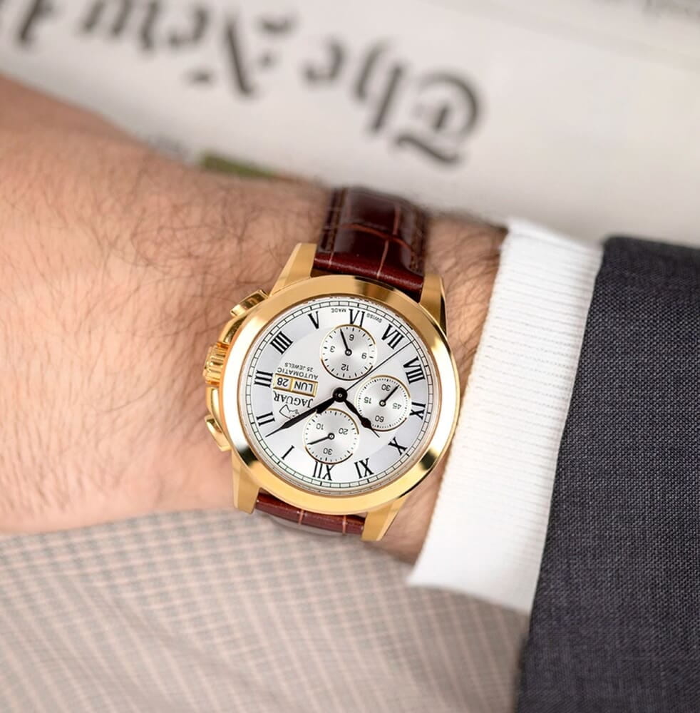 Jaguar Le Chronographe J976/1  — это мужские часы, сочетающие классический дизайн с современными функциями. Корпус диаметром 45 мм выполнен из нержавеющей стали с PVD-покрытиемPVDУльтратонкое покрытие наносится в технике вакуумного напыления, сочетает в себе нитрид титана особой прочности со слоем золота или оксида хрома. Несёт в себе декоративную или защитную функцию., что обеспечивает прочность и элегантный внешний вид. Сапфировое стеклоСапфировое стеклоПрочный и надёжный материал из кристалла сапфира синтетического происхождения, характеризующийся особой твёрдостью и устойчивостью к царапинам и повреждениям. защищает циферблат от царапин и повреждений. Изысканный циферблат со стильными индексами и стрелками подчёркивает утончённый стиль. Часы с хронографом. Часы оснащены стильным кожаным ремешком и классической застежкой, идеальной системой крепления для кожаного ремешка, которая гарантирует, что часы будут надежно оставаться на месте в любое время. Водозащита до 10 ATM (100 метров) делает часы подходящими для плавания и занятий водными видами спорта. Jaguar J976/1 — идеальный выбор для мужчин, которые ценят швейцарское качество и современные технологии.