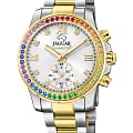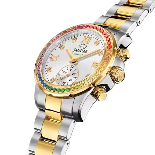 Женские швейцарские часы Jaguar Connected Lady J982/4. Сапфировое стеклоСапфировое стеклоПрочный и надёжный материал из кристалла сапфира синтетического происхождения, характеризующийся особой твёрдостью и устойчивостью к царапинам и повреждениям. устойчивое к мелким механическим повреждениям. Корпус часов изготовлен из нержавеющей стали. Стрелки с люминесцентным покрытиемЛюминесцентное покрытиеПозволяет считывать показания времени в темноте. Производители наносят на стрелки, часовые индексы, безель или поверхность циферблата светонакопительный состав, дающий холодное свечение.. Класс водозащиты: 50 метров, позволит защитить корпус от случайных брызг или капель дождя. БезельБезельВнешний ободок, закрепляющий стекло. В спортивных часах так называется поворотное кольцо с делениями на циферблате, выполняет роль таймера – замеряет отрезки времени на шкале. Неподвижный безель – элемент декора. Однонаправленно вращающийся безель на дайверских часах позволяет фиксировать моменты погружения и выныривания на поверхность. с PVD-покрытиемPVDУльтратонкое покрытие наносится в технике вакуумного напыления, сочетает в себе нитрид титана особой прочности со слоем золота или оксида хрома. Несёт в себе декоративную или защитную функцию. и циферблат инкрустированы цирконием. Стальной браслет с частичным PVD-покрытиемPVDУльтратонкое покрытие наносится в технике вакуумного напыления, сочетает в себе нитрид титана особой прочности со слоем золота или оксида хрома. Несёт в себе декоративную или защитную функцию. на раскладной застёжкеРаскладная застёжкаТакой тип застёжки используется только на браслетах из металла. Она никогда не раскрывается полностью, происходит разделение на 2 и более частей. Раскладывающая застёжка снизит вероятность потери часов к минимуму.. За точный ход работы часов, из коллекции Connected, отвечает кварцевый гибридный механизм швейцарского производства со Смарт-Модулем. Данный тип механизма обеспечивает возможность подключить часы к телефону через Bluetooth и управлять большим рядом дополнительных функций на выбор с помошью приложения Jaguar. Дополнительные функции: отображение даты и дня недели, секундомер, таймер, GMT, шагомер, поиск телефона, включение/выключение звука телефона при входящих вызовах, переключение музыки, вибро-уведомления.