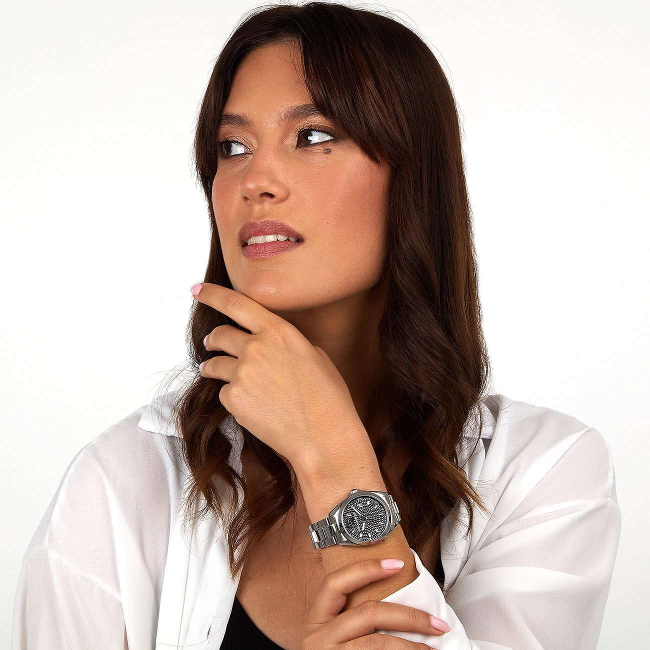 Женские элегантные часы Karl Lagerfeld Round Essentials R0553101515, кварцевый механизм с высокой точностью. Минеральное стеклоМинеральное стеклоМинеральное стекло представляет собой искусственно выращенный минерал кварца. Такое стекло отличается особой устойчивостью к повреждениям и царапинам. Уступает по некоторым качествам сапфировому стеклу. устойчивое к появлению царапин, обладающее высокой прозрачностью. Изысканный корпус изготовлен из нержавеющей стали. Лаконичные центральные часовая, минутная и секундная стрелки. Водонепроницаемость 5 АТМ позволяет использовать часы в повседневных условиях — при мытье рук или под лёгким дождём. Стальной браслет c раскладной застёжкойРаскладная застёжкаТакой тип застёжки используется только на браслетах из металла. Она никогда не раскрывается полностью, происходит разделение на 2 и более частей. Раскладывающая застёжка снизит вероятность потери часов к минимуму., обеспечивающей комфорт и уверенную фиксацию на запястье, а также добавляя завершающий штрих к этому стильному аксессуару. Стрелки и метки оснащены люминесцентным покрытиемЛюминесцентное покрытиеПозволяет считывать показания времени в темноте. Производители наносят на стрелки, часовые индексы, безель или поверхность циферблата светонакопительный состав, дающий холодное свечение., обеспечивающим хорошую читаемость в темноте. Циферблат с кристаллами подчёркивает изысканный характер часов, создавая универсальный образ, подходящий как для повседневных ситуаций, так и для особых случаев. Аккуратное окошко даты на отметке «3 часов».