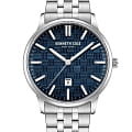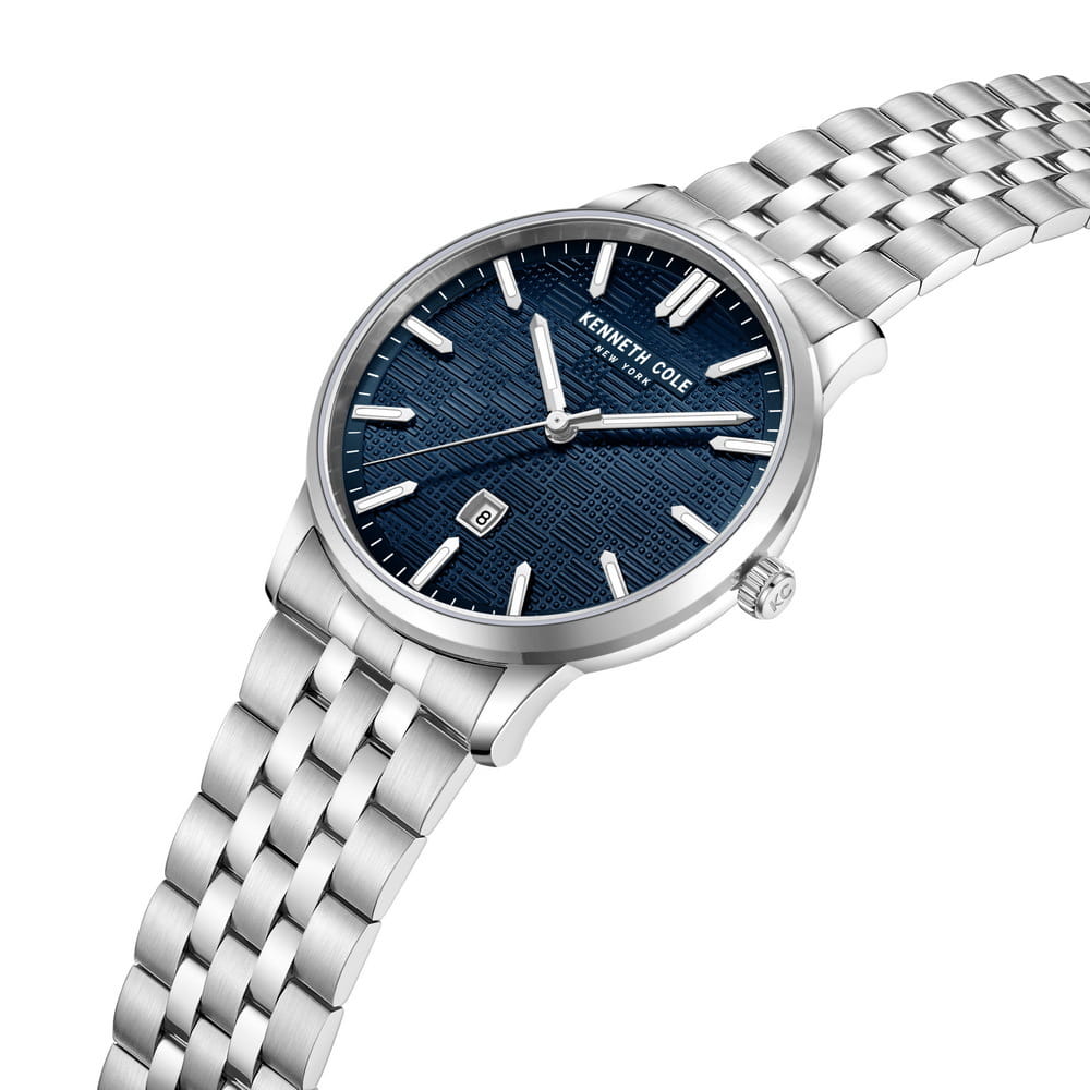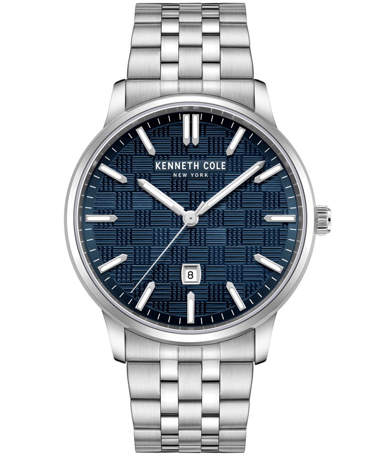 Kenneth Cole KCWGH0046904 — стильные мужские часы, сочетающие современный дизайн и функциональность. Корпус диаметром 42 мм выполнен из нержавеющей стали, что обеспечивает долговечность и элегантный внешний вид. Минеральное стеклоМинеральное стеклоМинеральное стекло представляет собой искусственно выращенный минерал кварца. Такое стекло отличается особой устойчивостью к повреждениям и царапинам. Уступает по некоторым качествам сапфировому стеклу. защищает циферблат от царапин. Синий текстурированный циферблат с аналоговой индикацией дополнен окошком даты на отметке «3 часа», подчёркивая функциональность модели. Часы оснащены кварцевым механизмом, обеспечивающим точность хода. Водозащита до 3 ATM (30 метров) делает их подходящими для повседневного использования, но не для плавания или погружения в воду. Браслет из нержавеющей стали с раскладной застёжкойРаскладная застёжкаТакой тип застёжки используется только на браслетах из металла. Она никогда не раскрывается полностью, происходит разделение на 2 и более частей. Раскладывающая застёжка снизит вероятность потери часов к минимуму. гарантирует комфортное ношение и надёжную фиксацию. Kenneth Cole KCWGH0046904 — это идеальный выбор для мужчин, ценящих стиль и надёжность.