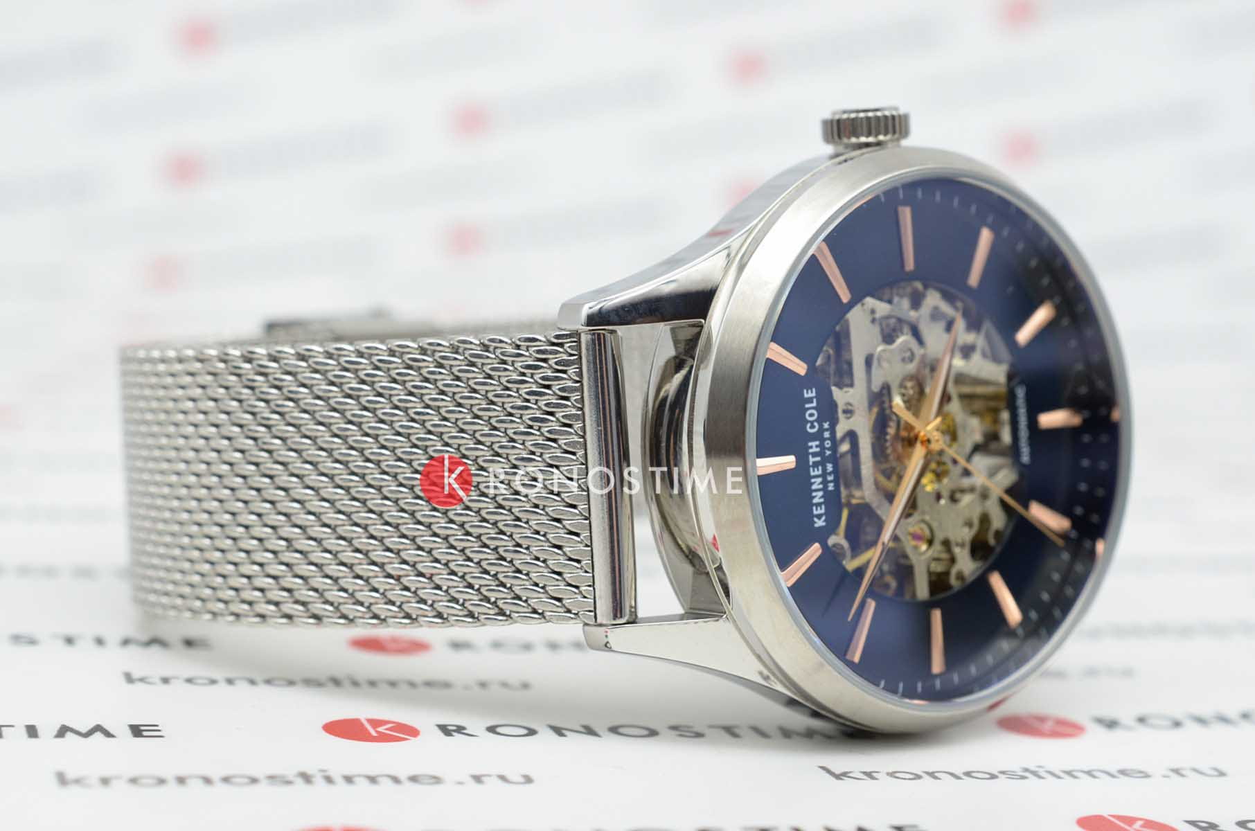 Мужские механические часы-скелетоны с минеральным стекломМинеральное стеклоМинеральное стекло представляет собой искусственно выращенный минерал кварца. Такое стекло отличается особой устойчивостью к повреждениям и царапинам. Уступает по некоторым качествам сапфировому стеклу. Kenneth Cole Automatic KCWGL2216905, механический механизм (автоматический калибр) с высокой точностью. Корпус часов изготовлен из стали. Стрелки с люминесцентным покрытиемЛюминесцентное покрытиеПозволяет считывать показания времени в темноте. Производители наносят на стрелки, часовые индексы, безель или поверхность циферблата светонакопительный состав, дающий холодное свечение.. Класс водозащиты: 30 метров, позволит защитить корпус от случайных брызг или капель дождя. Стальной браслет миланского плетения на раскладном замкеРаскладной замокДанный вариант застежки используется только на часах с металлическим браслетом. Отличительная особенность такого крепления в том, что длина браслета становится универсальной и вы можете самостоятельно отрегулировать нужный вам размер – застежка просто двигается по браслету часов..