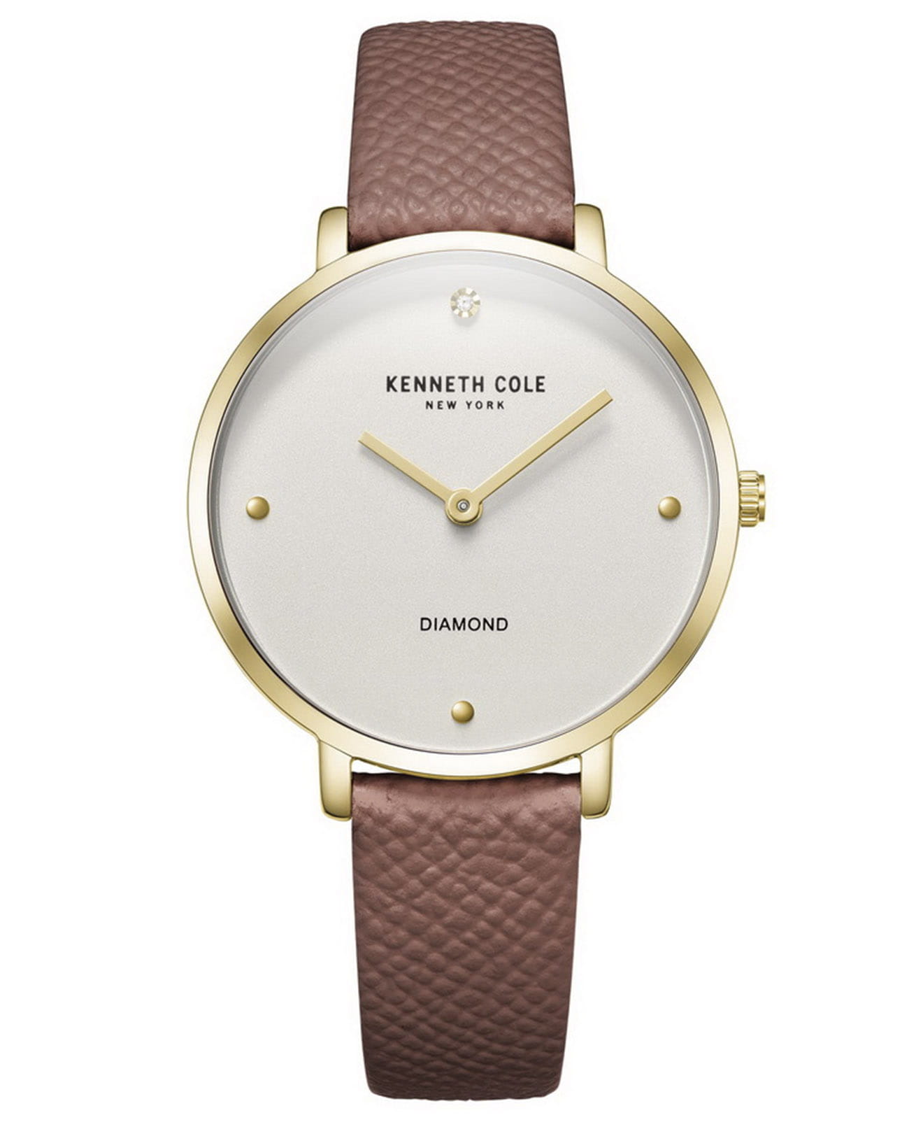 Женские кварцевые часы с минеральным стекломМинеральное стеклоМинеральное стекло представляет собой искусственно выращенный минерал кварца. Такое стекло отличается особой устойчивостью к повреждениям и царапинам. Уступает по некоторым качествам сапфировому стеклу. Kenneth Cole Classic KCWLA2220001, кварцевый механизм с высокой точностью. Класс водозащиты: 30 метров, позволит защитить корпус от случайных брызг или капель дождя. Корпус изготовлен из нержавеющей стали с PVD-покрытиемPVDУльтратонкое покрытие наносится в технике вакуумного напыления, сочетает в себе нитрид титана особой прочности со слоем золота или оксида хрома. Несёт в себе декоративную или защитную функцию.. Серебристый циферблат украшен бриллиантом. Кожаный ремешок на стандартной застёжке.