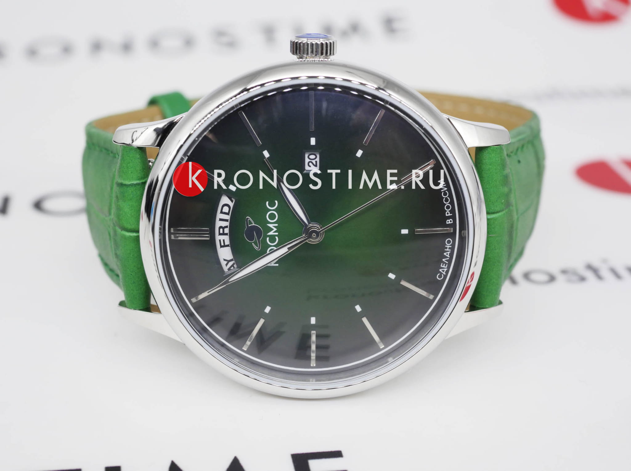Мужские наручные часы Космос Орион K 011.17.38 — это сочетание традиций часового искусства 60-70-х годов и футуристического дизайна, вдохновленного космическими исследованиями. Они не только служат напоминанием о прошлом, но и побуждают задуматься о будущем, позволяя наслаждаться качеством и смыслом, вложенными в каждую деталь. Полированный корпус часов выполнен в виде силуэта летающей тарелки благодаря выпуклым формам стекла и нижней части корпуса. Стальные ушки, которые напоминают опоры летающей тарелки, завершает общий образ. На задней крышке часов выгравирован фантазийный сюжет – космическая станция будущего. Зеленый циферблат, выполненный в ретро-стиле, имеет выгнутые края, что требует использования сложной технологии производства. Такой дизайн был характерен для часов прошлых эпох. Секундная стрелка, имеющая изогнутую форму, идеально соответствует контуру циферблата. Выпуклый градиентный циферблат с шлифовкой, напоминающей солнечные лучи, украшен вручную изготовленными индексами, которые надежно крепятся на двух штифтах. Часовая и минутная стрелки, а также линия по краю циферблата, напоминающая ореол Земли, имеют люминесцентное покрытиеЛюминесцентное покрытиеПозволяет считывать показания времени в темноте. Производители наносят на стрелки, часовые индексы, безель или поверхность циферблата светонакопительный состав, дающий холодное свечение., которое светится в темноте, создавая впечатляющий визуальный эффект. В верхней части циферблата расположено окошко для отображения дня недели на английском языке, а индикаторы даты и дня недели дополнительно украшены фасочками, что придает им элегантный вид. Форма минерального стеклаМинеральное стеклоМинеральное стекло представляет собой искусственно выращенный минерал кварца. Такое стекло отличается особой устойчивостью к повреждениям и царапинам. Уступает по некоторым качествам сапфировому стеклу. также тщательно продумана, оно изогнуто как снаружи, так и изнутри. Это позволяет избежать искажений изображения на циферблате, в отличие от традиционного стекла с прямой внутренней частью, создающего эффект линзы. Ремешок из натуральной кожи зеленого цвета прекрасно дополняет часы. Также имеется возможность приобрести дополнительные ремни и браслеты миланского плетения, которые можно легко менять благодаря специальным крепежам. Заводная головка, застежка и ремешок украшены фирменным логотипом, подчеркивающим индивидуальность и стиль модели.