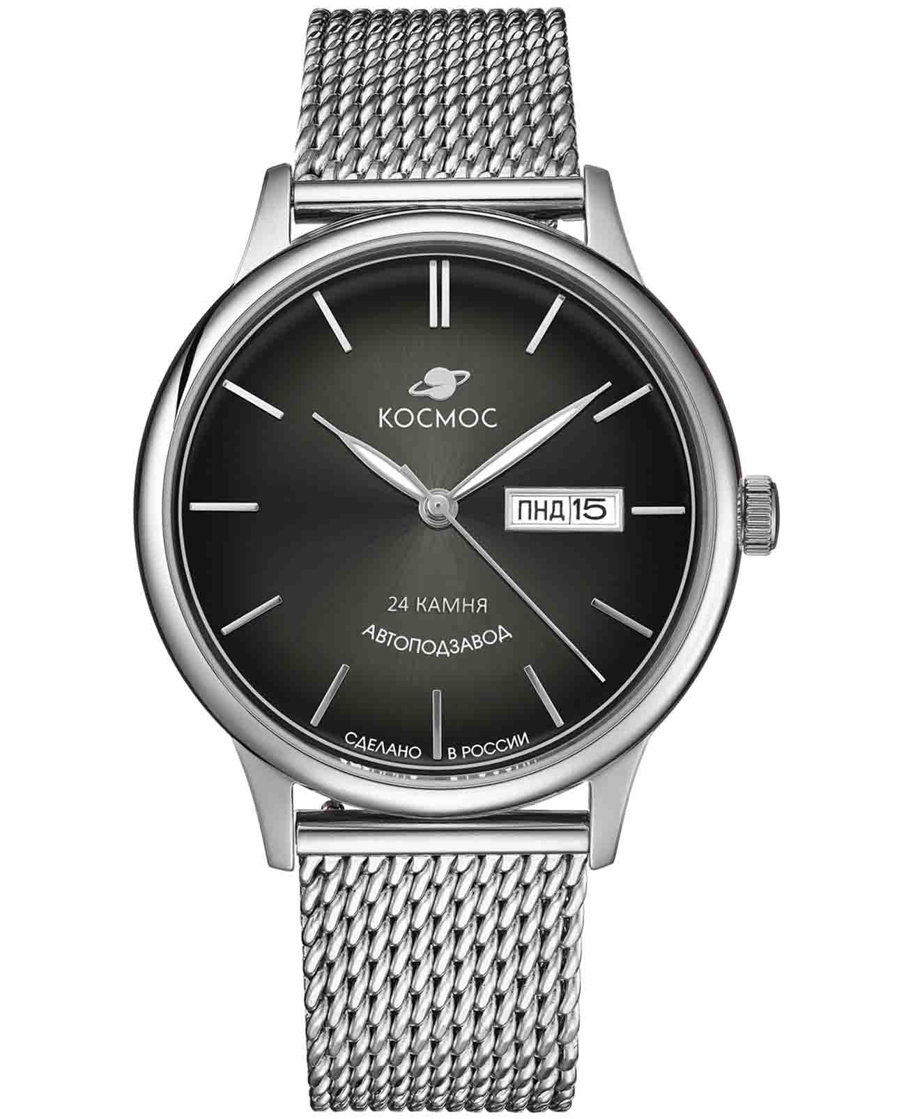 Российские мужские механические часы Космос K 043.10.31 с автоподзаводом оснащены корпусом из нержавеющей стали 316L диаметром 41 мм и защищены минеральным стекломМинеральное стеклоМинеральное стекло представляет собой искусственно выращенный минерал кварца. Такое стекло отличается особой устойчивостью к повреждениям и царапинам. Уступает по некоторым качествам сапфировому стеклу.. Дополнен функциями отображения даты и дня недели. Заводная головка декорирована логотипом бренда в виде стилизованного изображения планеты. Часы имеют водонепроницаемость 50 метров, позволит защитить корпус от случайных брызг или капель дождя. Модель комплектуется браслетом из нержавеющей стали 316L с миланским плетением на раскладном замкеРаскладной замокДанный вариант застежки используется только на часах с металлическим браслетом. Отличительная особенность такого крепления в том, что длина браслета становится универсальной и вы можете самостоятельно отрегулировать нужный вам размер – застежка просто двигается по браслету часов.. Специальные крепежи позволяют легко заменить браслет на часах самостоятельно. Прочный корпус и надежный механизм делают эти часы универсальным аксессуаром для повседневного использования. Уникальный дизайн и высокое качество материалов подчеркивают индивидуальность владельца.