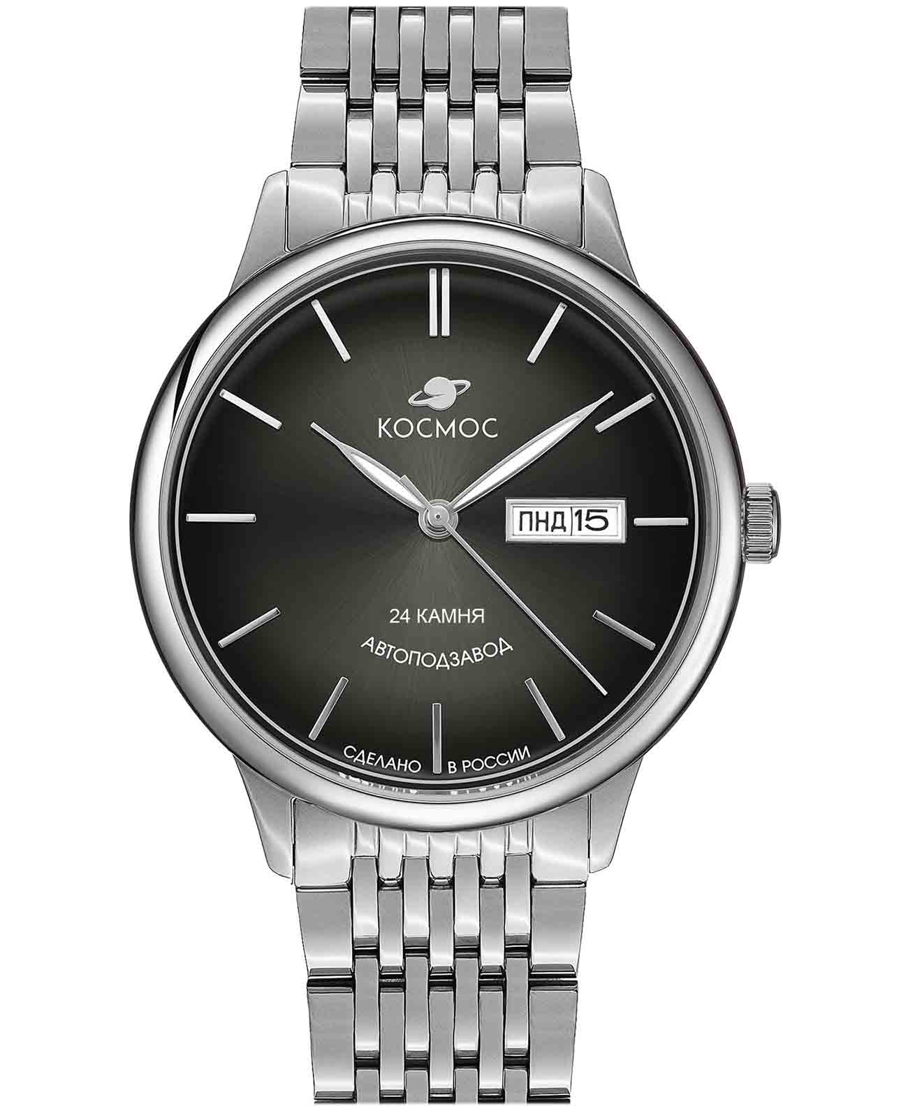 Российские мужские механические часы Космос K 043.19.31 из коллекции Юпитер оснащены механизмом TMI с автоподзаводом. Круглый корпус из нержавеющей стали диаметром 41 мм защищен минеральным стекломМинеральное стеклоМинеральное стекло представляет собой искусственно выращенный минерал кварца. Такое стекло отличается особой устойчивостью к повреждениям и царапинам. Уступает по некоторым качествам сапфировому стеклу.. Черный циферблат с элементами стального цвета дополнен функциями отображения даты и дня недели. Часы имеют водонепроницаемость 50 метров, позволит защитить корпус от случайных брызг или капель дождя. Модель комплектуется стальным браслетом на застёжке-бабочке с кнопкамиЗастёжка "бабочка"Такой вид застёжки дополняется предохранителями, помогающими избежать случайного раскрытия браслета. Обладают изящным исполнением. . Прочный корпус и надежный механизм делают эти часы универсальным аксессуаром для повседневного использования. Уникальный дизайн и высокое качество материалов подчеркивают индивидуальность владельца.