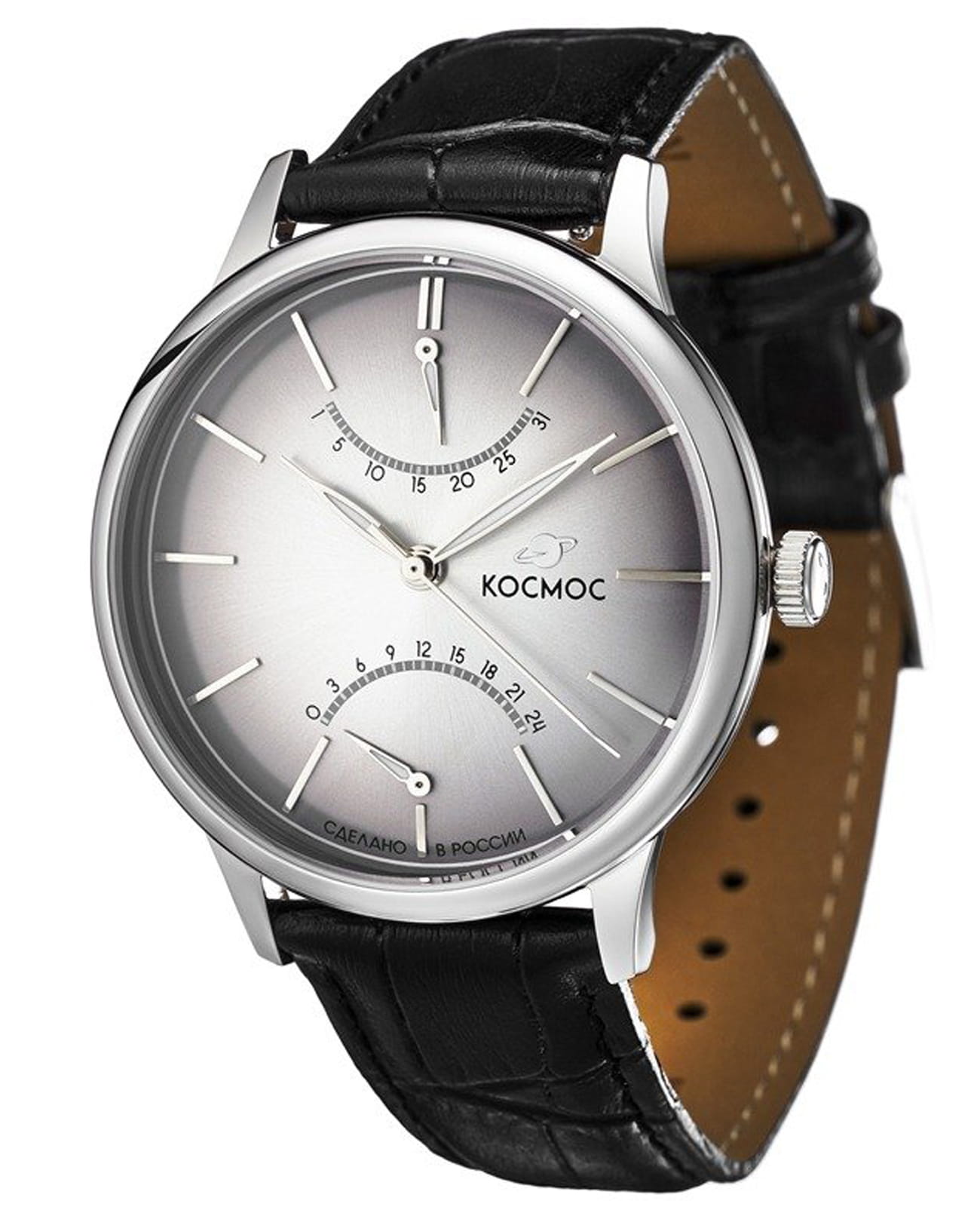 Мужские наручные часы Космос Космопорт K 058.11.33 — это сочетание традиций часового искусства 60-70-х годов и футуристического дизайна, вдохновленного космическими исследованиями. Они не только служат напоминанием о прошлом, но и побуждают задуматься о будущем, позволяя наслаждаться качеством и смыслом, вложенными в каждую деталь. Полированный корпус часов выполнен в виде силуэта летающей тарелки благодаря выпуклым формам стекла и нижней части корпуса. Стальные ушки, которые напоминают опоры летающей тарелки, завершает общий образ. На задней крышке часов выгравирован фантазийный сюжет – космическая станция будущего. Циферблат светло-серого цвета выполнен в ретро стиле с закруглёнными краями, что требует применения сложной технологии производства, характерной для часов прошлых лет. Кончик секундной стрелки повторяет эту форму, а на выпуклом градиентном циферблате выполнена шлифовка, напоминающая солнечные лучи. Индексы, изготовленные вручную и закрепленные на двух штифтах, добавляют изысканности. Также присутствуют ретроградные индикаторы даты и второго времени (24 часа), которые возвращаются в исходное положение одним движением. Люминесцентное покрытиеЛюминесцентное покрытиеПозволяет считывать показания времени в темноте. Производители наносят на стрелки, часовые индексы, безель или поверхность циферблата светонакопительный состав, дающий холодное свечение. на часовой и минутной стрелках, а также на стрелках ретроградных индикаторов и окантовке циферблата создает эффект светящегося ореола в темноте. Форма минерального стеклаМинеральное стеклоМинеральное стекло представляет собой искусственно выращенный минерал кварца. Такое стекло отличается особой устойчивостью к повреждениям и царапинам. Уступает по некоторым качествам сапфировому стеклу., представляющего собой двояковыпуклую конструкцию, тщательно проработана. Такое стекло не искажает изображение на циферблате, потому что внутренняя поверхность остаётся плоской, создавая эффект линзы. Производственный процесс для достижения двух параллельно изогнутых поверхностей очень сложен, и требуется высокая точность, чтобы избежать повреждения стекла. Ремешок из черной натуральной кожи оснащён креплениями, которые позволяют легко снимать и надевать его без использования дополнительных инструментов. Заводная головка, застежка и ремешок украшены фирменным логотипом, что подчеркивает индивидуальность и стиль этих часов.