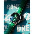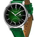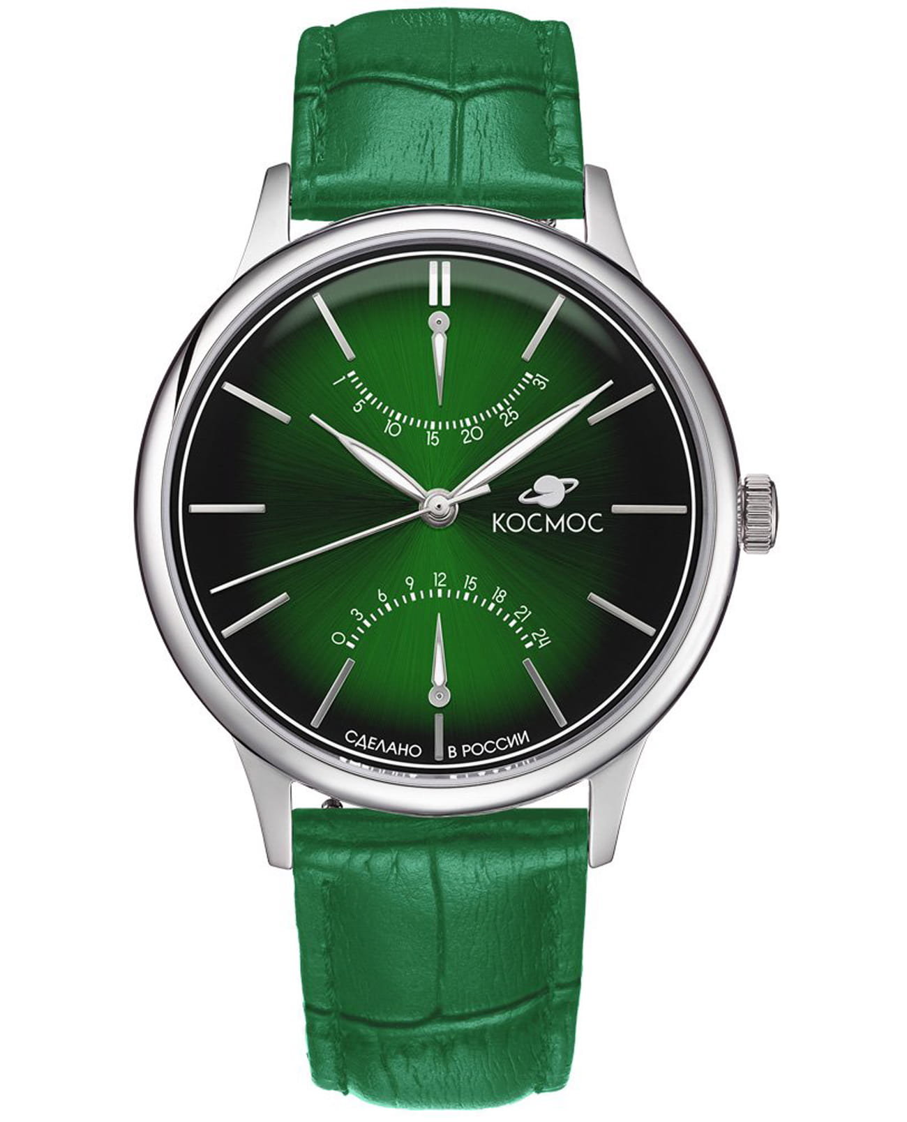 Мужские наручные часы Космос Космопорт K 058.17.38 — это сочетание традиций часового искусства 60-70-х годов и футуристического дизайна, вдохновленного космическими исследованиями. Они не только служат напоминанием о прошлом, но и побуждают задуматься о будущем, позволяя наслаждаться качеством и смыслом, вложенными в каждую деталь. Полированный корпус часов выполнен в виде силуэта летающей тарелки благодаря выпуклым формам стекла и нижней части корпуса. Стальные ушки, которые напоминают опоры летающей тарелки, завершает общий образ. На задней крышке часов выгравирован фантазийный сюжет – космическая станция будущего. Циферблат зеленого цвета выполнен в ретро стиле с закруглёнными краями, что требует применения сложной технологии производства, характерной для часов прошлых лет. Кончик секундной стрелки повторяет эту форму, а на выпуклом градиентном циферблате выполнена шлифовка, напоминающая солнечные лучи. Индексы, изготовленные вручную и закрепленные на двух штифтах, добавляют изысканности. Также присутствуют ретроградные индикаторы даты и второго времени (24 часа), которые возвращаются в исходное положение одним движением. Люминесцентное покрытиеЛюминесцентное покрытиеПозволяет считывать показания времени в темноте. Производители наносят на стрелки, часовые индексы, безель или поверхность циферблата светонакопительный состав, дающий холодное свечение. на часовой и минутной стрелках, а также на стрелках ретроградных индикаторов и окантовке циферблата создает эффект светящегося ореола в темноте. Форма минерального стеклаМинеральное стеклоМинеральное стекло представляет собой искусственно выращенный минерал кварца. Такое стекло отличается особой устойчивостью к повреждениям и царапинам. Уступает по некоторым качествам сапфировому стеклу., представляющего собой двояковыпуклую конструкцию, тщательно проработана. Такое стекло не искажает изображение на циферблате, потому что внутренняя поверхность остаётся плоской, создавая эффект линзы. Производственный процесс для достижения двух параллельно изогнутых поверхностей очень сложен, и требуется высокая точность, чтобы избежать повреждения стекла. Ремешок из зеленой натуральной кожи оснащён креплениями, которые позволяют легко снимать и надевать его без использования дополнительных инструментов. Заводная головка, застежка и ремешок украшены фирменным логотипом, что подчеркивает индивидуальность и стиль этих часов.