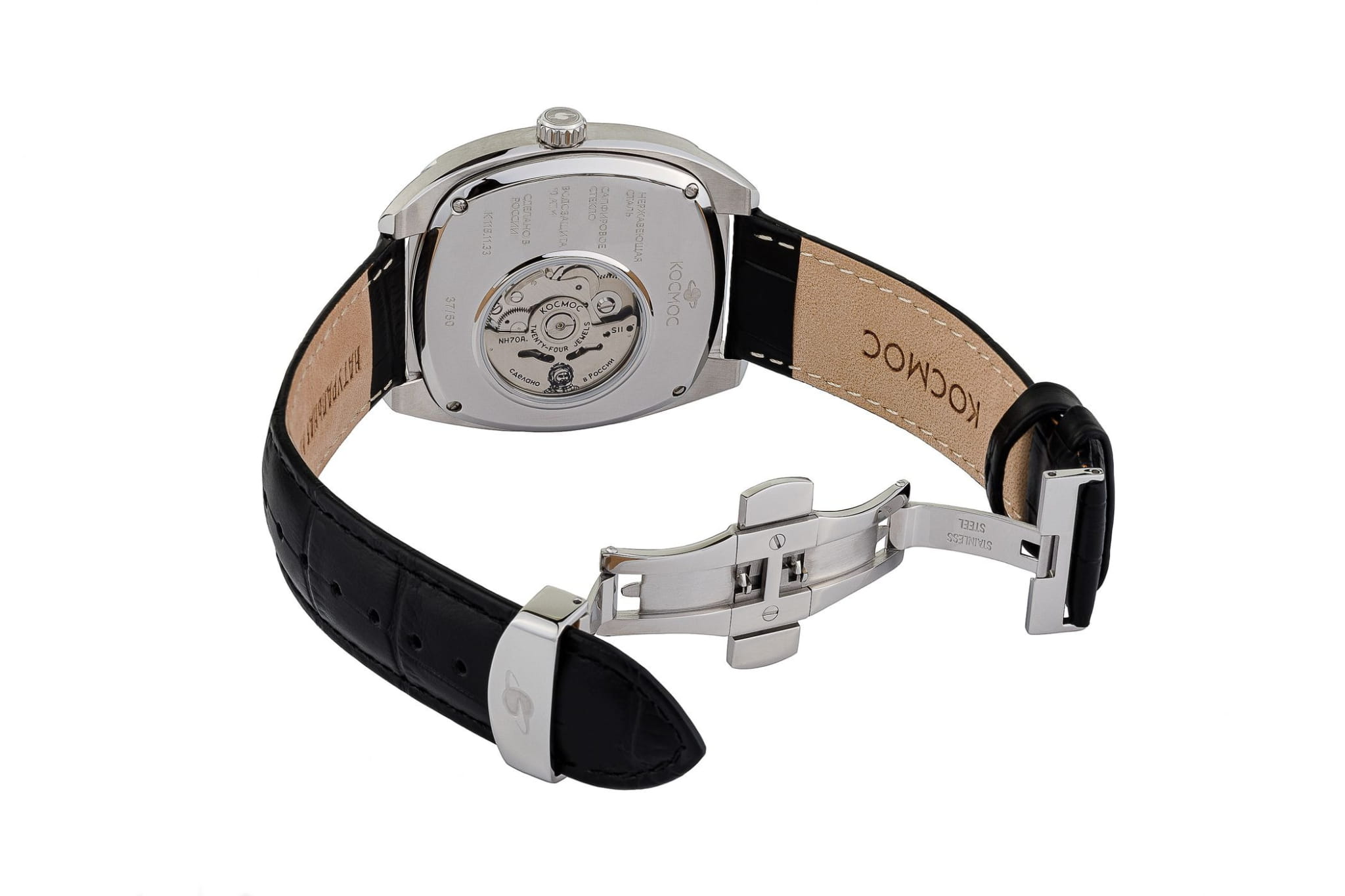 Мужские наручные часы Космос Спутник K 115.11.31 — это уникальная лимитированная серия, созданная в честь исторического запуска первого искусственного спутника Земли. В корпусе необычной круглой формы, выполненном из гипоаллергенной нержавеющей стали, работает надежный механический механизм с автоподзаводом от японской компании Seiko. Прозрачная задняя крышка, закрепленная на четырех винтах, открывает вид на сложный механизм, а на самой крышке указан индивидуальный номер модели в формате хх/50. Скелетонизированный черный циферблат защищен сапфировым стекломСапфировое стеклоПрочный и надёжный материал из кристалла сапфира синтетического происхождения, характеризующийся особой твёрдостью и устойчивостью к царапинам и повреждениям. с антибликовым покрытиемАнтибликовое покрытиеСлой оксида металла в 0,13-0,3 микрон, благодаря которому стекло часов не бликует и не отражает свет. Антибликовое покрытие уменьшает отражение света в 10 раз, обеспечивая отличную читаемость показателей циферблата., которое обеспечивает максимальную устойчивость к царапинам и идеальную видимость в любых условиях. Украшением циферблата служат крупные стрелки с люминесцентным покрытиемЛюминесцентное покрытиеПозволяет считывать показания времени в темноте. Производители наносят на стрелки, часовые индексы, безель или поверхность циферблата светонакопительный состав, дающий холодное свечение., а также специальная апертура, окаймленная элементами, напоминающими антенны Спутника. Часовая и минутная стрелки отлично читаются благодаря своему размеру и светящемуся покрытию. Браслет из натуральной кожи черного цвета дополнен удобной застежкой-бабочкой с двумя боковыми кнопкамиЗастёжка "бабочка"Такой вид застёжки дополняется предохранителями, помогающими избежать случайного раскрытия браслета. Обладают изящным исполнением. , что гарантирует надежную фиксацию на руке. Водозащита до 10 атм (WR100) позволяет использовать часы при плавании и других водных видах спорта без акваланга. Коллекция Спутник — это выбор для ценителей истории космических достижений и современных технологий.