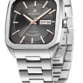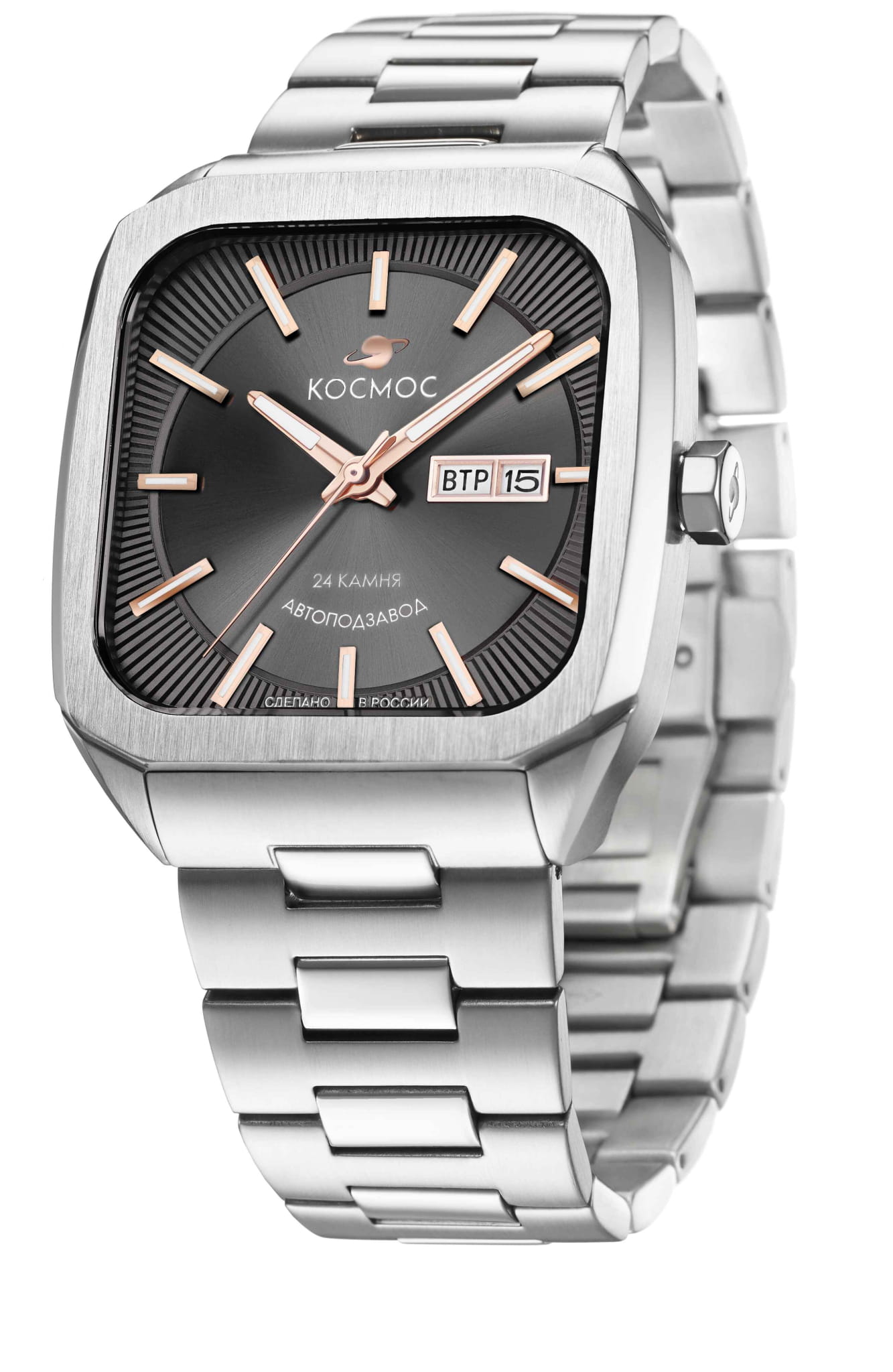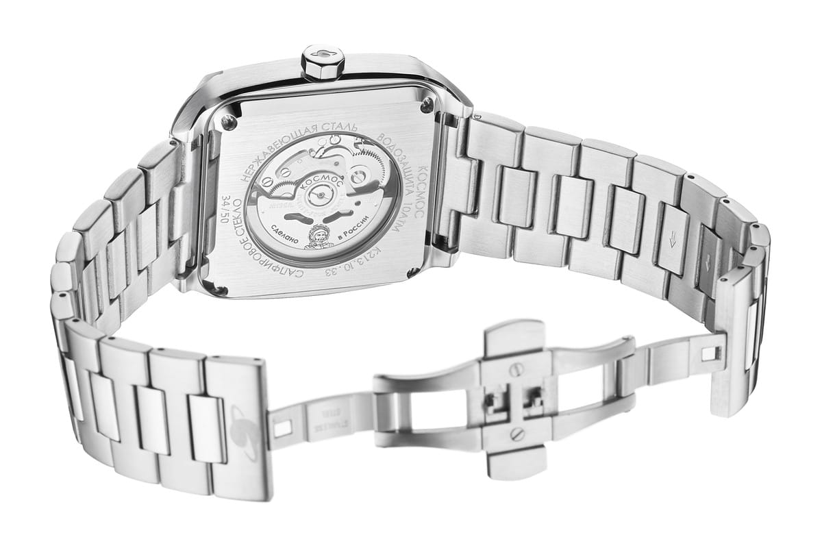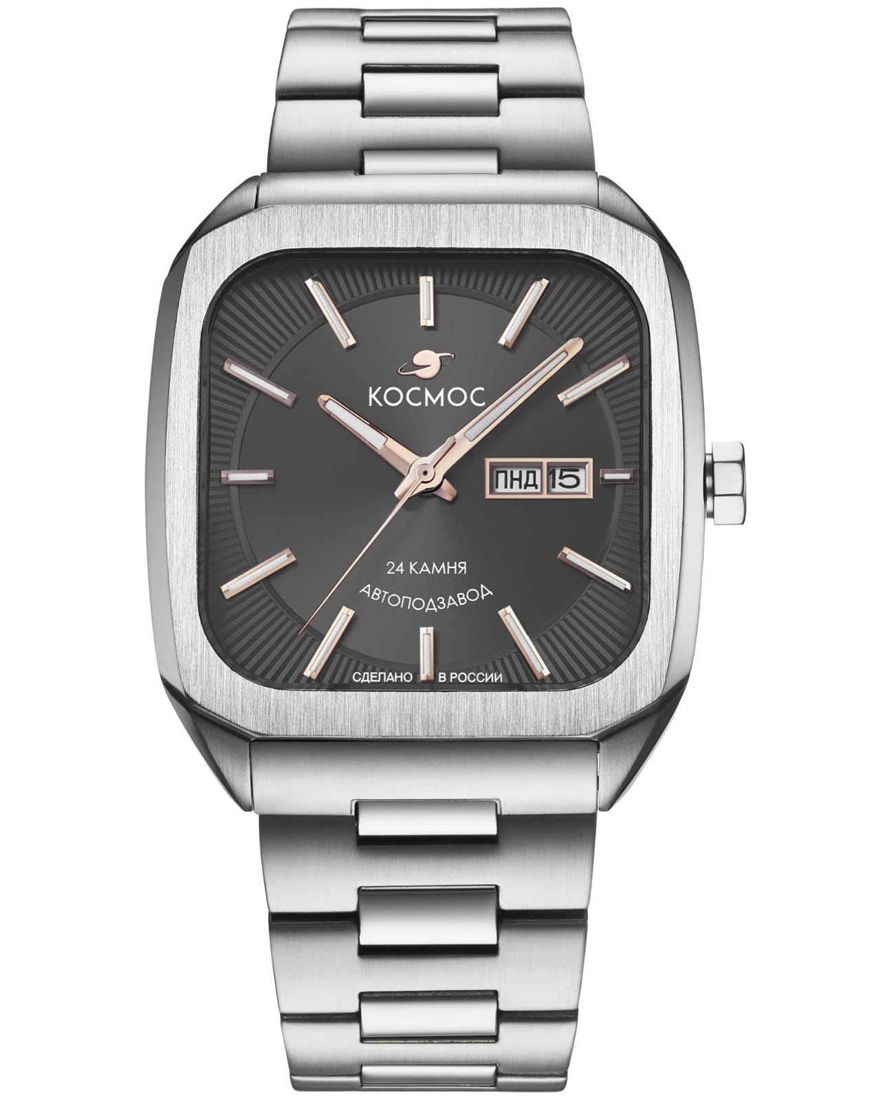 Мужские наручные часы Космос Марсоход K 213.10.34 — это уникальная лимитированная серия, посвященная аппарату, способному передвигаться по поверхности Красной планеты. Марсоход ассоциируется с брутальностью, мастерством и технической сложностью. Наша страна дважды запускала подобные аппараты еще в 70-х годах прошлого века. Дизайн часов серии Марсоход вдохновлен лучшими работами советских мастеров, сочетая современные технологии часового искусства с обаянием стиля ретро. Корпус в форме квадрата с закругленными углами выполнен из нержавеющей стали марки 316L, украшенной зеркальной полировкой и сатинированием. Удобная заводная головка имеет форму гайки, что добавляет модели индустриальный шарм. Задняя крышка прозрачная, закрепленная на четырех винтах, и позволяет увидеть работу механизма TMI с подвижным ротором, на котором гравируется надпись «Сделано в России». Также здесь представлена гравировка с изображением космонавта, придающая часам особую значимость. Водостойкость достигает 10 атм (WR100), что позволяет использовать часы при плавании и других водных видах спорта. На задней крышке указан индивидуальный номер модели в формате от 01/50 до 50/50 (первый выпуск) или от 051/200 до 200/200 (второй выпуск). Объемный циферблат состоит из двух уровней. В центре движутся три стрелки, часовая и минутная из которых имеют люминесцентное покрытиеЛюминесцентное покрытиеПозволяет считывать показания времени в темноте. Производители наносят на стрелки, часовые индексы, безель или поверхность циферблата светонакопительный состав, дающий холодное свечение., позволяющее определять время даже в темноте. Индексы накладные, как и стальная рамка, выделяющая сдвоенное окошко даты и дня недели, где день недели отображается на двух языках — русском и английском. Циферблат защищен прочным сапфировым стеклом с антибликовым покрытиемСапфировое стеклоПрочный и надёжный материал из кристалла сапфира синтетического происхождения, характеризующийся особой твёрдостью и устойчивостью к царапинам и повреждениям., обеспечивающим отличную читаемость показаний в любых условиях. Браслет изготовлен из литых стальных звеньев нержавеющей стали 316L и оснащен удобной застёжкой «бабочка» с кнопкамиЗастёжка "бабочка"Такой вид застёжки дополняется предохранителями, помогающими избежать случайного раскрытия браслета. Обладают изящным исполнением. , которая сводит к минимуму вероятность потери. Заводная головка, застежка и браслет украшены фирменным логотипом бренда. Коллекция Марсоход — идеальный выбор для ценителей истории космических достижений и современных технологий.