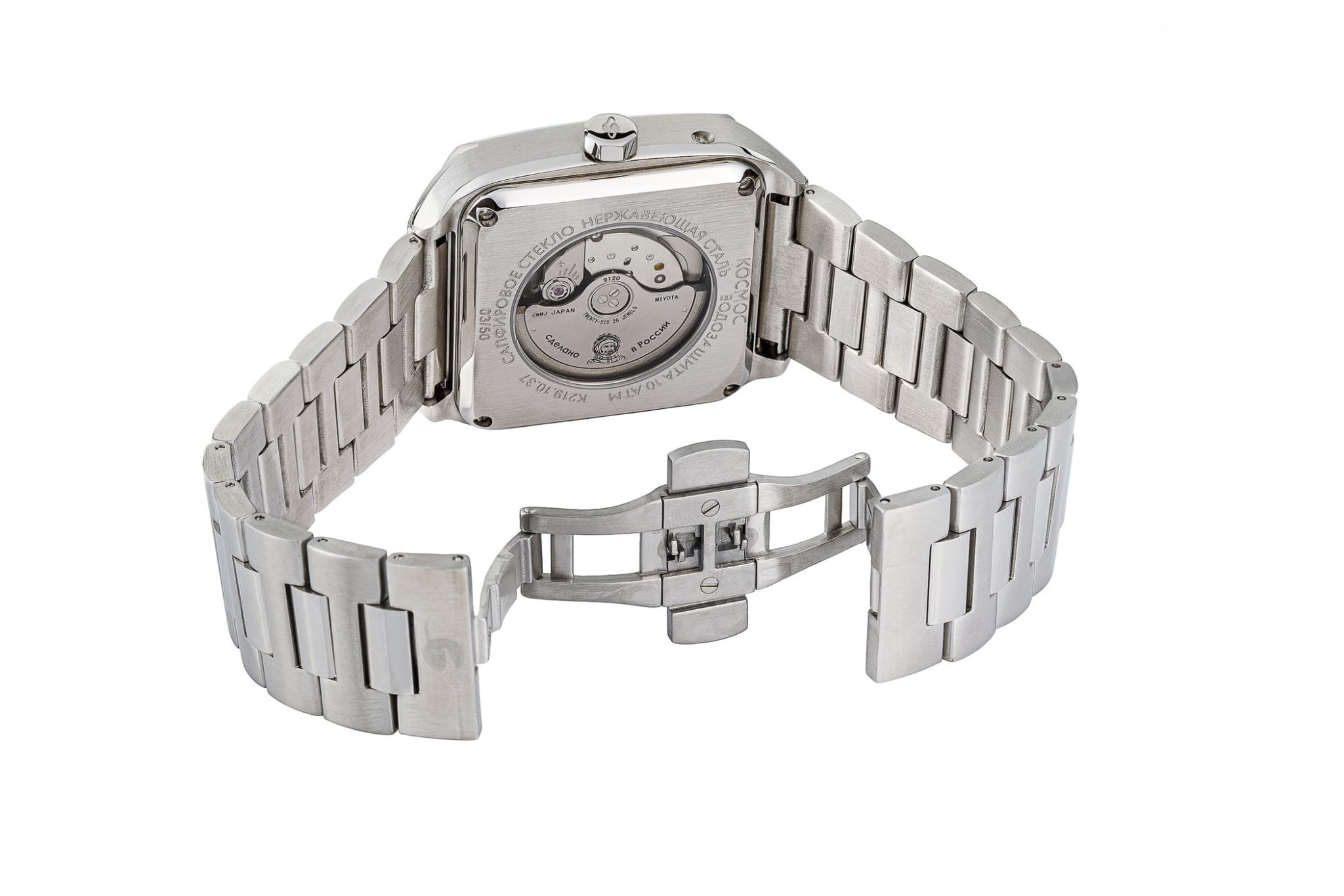 Мужские наручные часы Космос Марсоход II K 219.10.34 — это уникальная лимитированная серия, посвященная аппарату, способному передвигаться по поверхности Красной планеты. Марсоход ассоциируется с брутальностью, мастерством и технической сложностью. Наша страна дважды запускала подобные аппараты еще в 70-х годах прошлого века. Дизайн часов серии Марсоход вдохновлен лучшими работами советских мастеров, сочетая современные технологии часового искусства с обаянием стиля ретро. Корпус в форме квадрата с закругленными углами выполнен из нержавеющей стали украшенной зеркальной полировкой и сатинированием. Удобная заводная головка имеет форму гайки, что добавляет модели индустриальный шарм. Задняя крышка прозрачная, закрепленная на четырех винтах, и позволяет увидеть работу механизма TMI с подвижным ротором, на котором гравируется надпись «Сделано в России». Также здесь представлена гравировка с изображением космонавта, придающая часам особую значимость. Водостойкость достигает 10 атм (WR100), что позволяет использовать часы при плавании и других водных видах спорта. На задней крышке указан индивидуальный номер модели в формате от 01/50 до 50/50. Объемный циферблат состоит из двух уровней. В центре движутся три стрелки, часовая и минутная из которых имеют люминесцентное покрытиеЛюминесцентное покрытиеПозволяет считывать показания времени в темноте. Производители наносят на стрелки, часовые индексы, безель или поверхность циферблата светонакопительный состав, дающий холодное свечение., позволяющее определять время даже в темноте. Также, здесь расположили три дополнительных индикатора: день недели, месяц и время в формате 24-х часов. Для обозначения дня недели и месяца используется кириллица. Окошко даты между 4 и 5 часами выделено накладной рамкой. Циферблат защищен прочным сапфировым стеклом с антибликовым покрытиемСапфировое стеклоПрочный и надёжный материал из кристалла сапфира синтетического происхождения, характеризующийся особой твёрдостью и устойчивостью к царапинам и повреждениям., обеспечивающим отличную читаемость показаний в любых условиях. Второй уровень декорирован гильоше в виде солнечных лучей, на нем закреплены накладные индексы. Браслет изготовлен из литых стальных звеньев нержавеющей стали и оснащен удобной застёжкой «бабочка» с кнопкамиЗастёжка "бабочка"Такой вид застёжки дополняется предохранителями, помогающими избежать случайного раскрытия браслета. Обладают изящным исполнением. , которая сводит к минимуму вероятность потери. Заводная головка, застежка и браслет украшены фирменным логотипом бренда. Коллекция Марсоход — идеальный выбор для ценителей истории космических достижений и современных технологий.