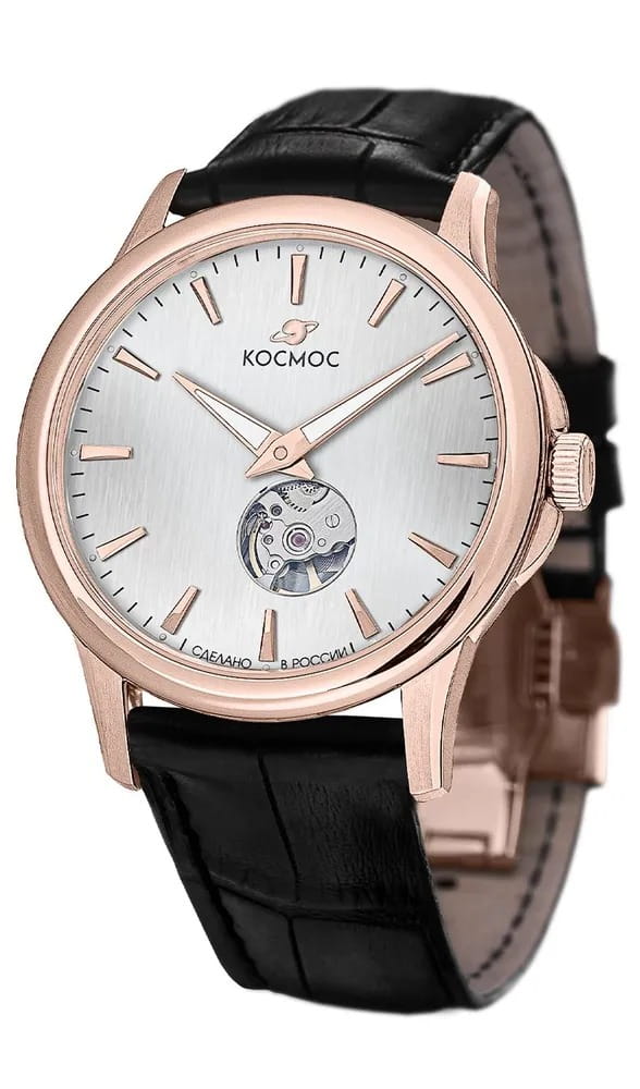 Мужские наручные часы Космос Телескоп K 304.41.33 — это уникальная лимитированная серия под названием Телескоп, посвящена аппарату приоткрывающего взгляду бескрайние дали космического пространства. Апертура открытого баланса модели по форме напоминает круглую линзу телескопа. Сквозь это окошко, расположенное на черном циферблате, также можно увидеть много интересного: ту самую систему «баланс-спираль» автоматического механизма, которая отвечает за точность хода. Корпус часов выполнен из нержавеющей стали с PVDPVDУльтратонкое покрытие наносится в технике вакуумного напыления, сочетает в себе нитрид титана особой прочности со слоем золота или оксида хрома. Несёт в себе декоративную или защитную функцию. покрытием, классической круглой формы и достаточно тонкий для механических моделей. Это стало возможным благодаря использованию механизма Miyota, калибр 9029, с высотой всего 3.9 мм. Циферблат декорирован вертикальной текстурой в ретро-стиле, по которой движутся крупные часовая и минутная стрелки, имеющие люминесцентное покрытиеЛюминесцентное покрытиеПозволяет считывать показания времени в темноте. Производители наносят на стрелки, часовые индексы, безель или поверхность циферблата светонакопительный состав, дающий холодное свечение., позволяющее определять время даже в темноте. Циферблат защищен прочным сапфировым стеклом с антибликовым покрытиемСапфировое стеклоПрочный и надёжный материал из кристалла сапфира синтетического происхождения, характеризующийся особой твёрдостью и устойчивостью к царапинам и повреждениям., обеспечивающим отличную читаемость показаний в любых условиях. Прозрачная задняя крышка, закрепленная на четырех винтах, демонстрирует механизм и содержит выгравированный индивидуальный номер экземпляра хх/50, отражающий лимитированный тираж всего в 50 штук. Ремешок часов сделан из натуральной кожи черного цвета и оснащен удобной застёжкой «бабочка» с кнопкамиЗастёжка "бабочка"Такой вид застёжки дополняется предохранителями, помогающими избежать случайного раскрытия браслета. Обладают изящным исполнением. , которая сводит к минимуму вероятность потери. Модель Телескоп сочетает классический дизайн и универсальность, прекрасно подходя как к деловому костюму, так и к более повседневным образам.