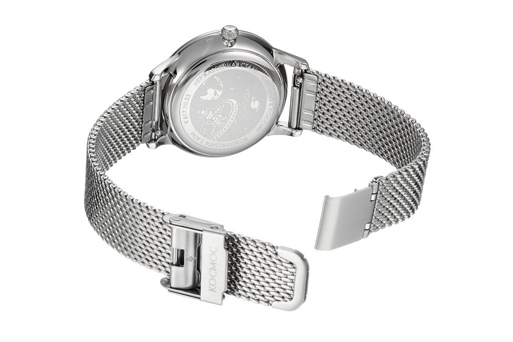 Женские наручные часы Космос Солнце и Луна K 617.10.31 — это сочетание традиций часового искусства 60-70-х годов и футуристического дизайна, вдохновленного космическими исследованиями. Они не только служат напоминанием о прошлом, но и побуждают задуматься о будущем, позволяя наслаждаться качеством и смыслом, вложенными в каждую деталь. Полированный корпус часов выполнен в виде силуэта летающей тарелки благодаря выпуклым формам стекла и нижней части корпуса. Стальные ушки, которые напоминают опоры летающей тарелки, завершает общий образ. На задней крышке часов выгравирован фантазийный сюжет – космическая станция будущего. Элегантные женские часы из серии Солнце и Луна выделяются функцией день/ночь. Циферблат выполнен в ретро-стиле с выгнутыми краями, что требует применения сложных технологий в производстве. Циферблаты такой формы были характерны для часов прошлых эпох. Кончик секундной стрелки изогнут в соответствии с формой циферблата. На градиентном выпуклом циферблате выполнена шлифовка в стиле солнечных лучей, а также размещены индексы, изготовленные вручную и закрепленные на двух штифтах. Часовая и минутная стрелки, а также круг по краю циферблата, напоминающий ореол Земли, с люминесцентным покрытиемЛюминесцентное покрытиеПозволяет считывать показания времени в темноте. Производители наносят на стрелки, часовые индексы, безель или поверхность циферблата светонакопительный состав, дающий холодное свечение., которое светится в темноте, создавая завораживающий эффект. Форма минерального стеклаМинеральное стеклоМинеральное стекло представляет собой искусственно выращенный минерал кварца. Такое стекло отличается особой устойчивостью к повреждениям и царапинам. Уступает по некоторым качествам сапфировому стеклу. тщательно продумана: оно выгнуто как снаружи, так и изнутри. Такое решение позволяет избежать искажения изображения на циферблате, в отличие от стекла с прямой внутренней частью, которое создает эффект линзы. Модель оснащена гибким и прочным браслетом миланского плетения. Заводная головка, застежка и ремешок украшены фирменным логотипом.