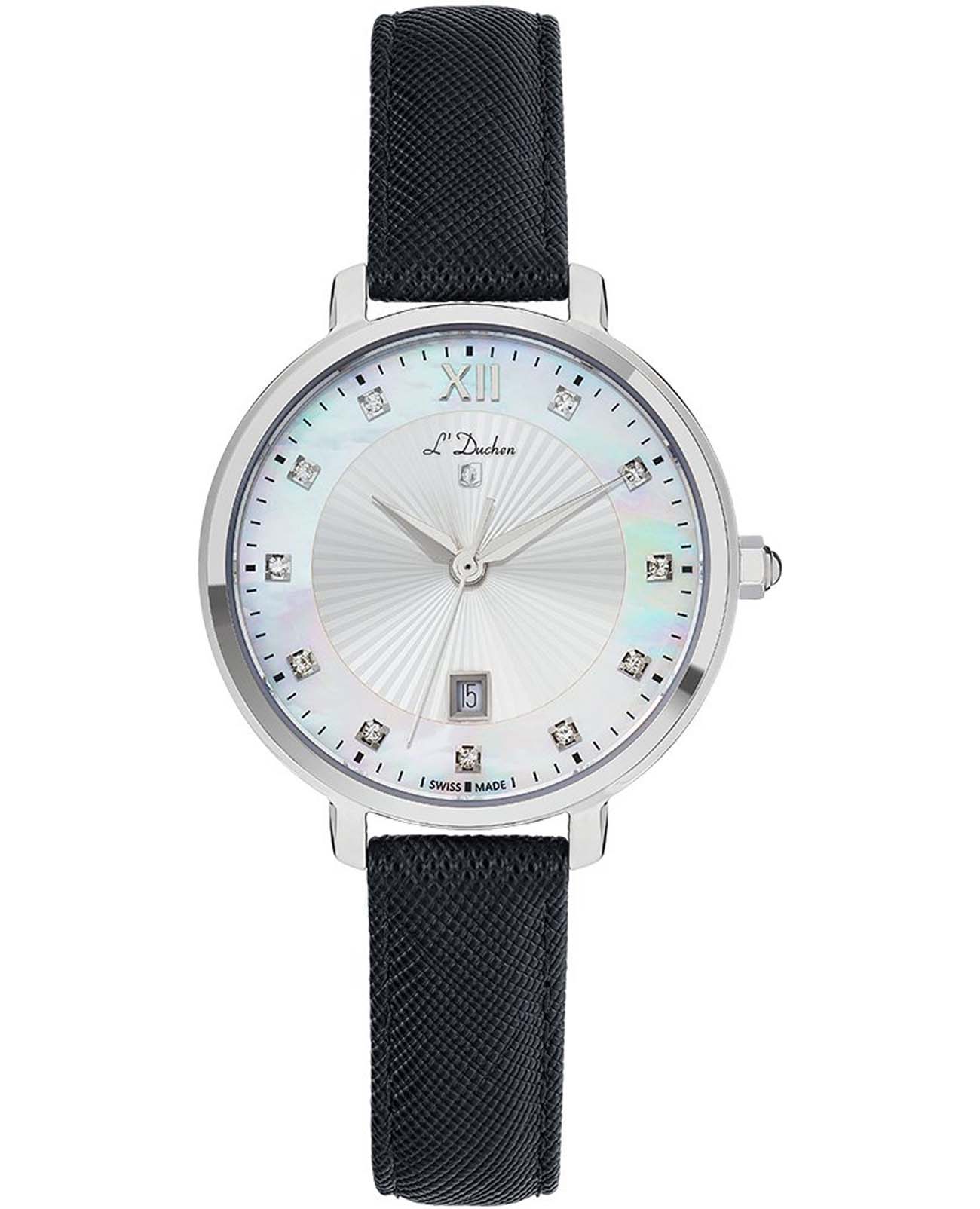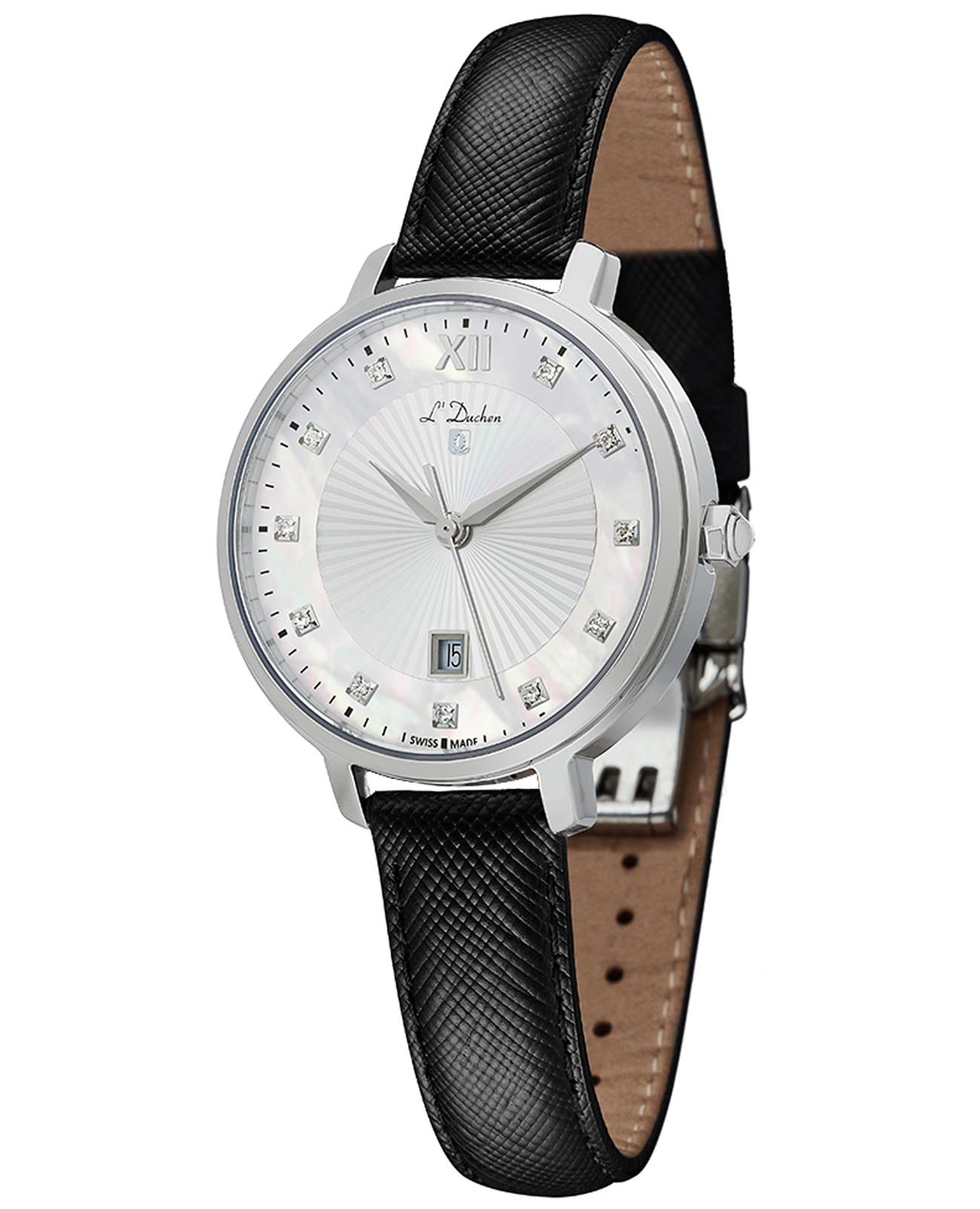 Женские швейцарские часы L'Duchen Eternity D 811.11.33, кварцевый механизм с высокой точностью. Сапфировое стеклоСапфировое стеклоПрочный и надёжный материал из кристалла сапфира синтетического происхождения, характеризующийся особой твёрдостью и устойчивостью к царапинам и повреждениям. устойчивое к появлению царапин, обладающее высокой прозрачностью. Корпус часов выполнен из нержавеющей стали. Окошко даты находится в положении 6 часов. Класс водозащиты: 50 метров, позволит защитить корпус от случайных брызг или капель дождя. Кожаный ремешок на застёжке «бабочка» с кнопкамиЗастёжка "бабочка"Такой вид застёжки дополняется предохранителями, помогающими избежать случайного раскрытия браслета. Обладают изящным исполнением. .
