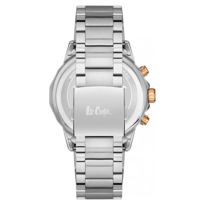 Мужские наручные часы Lee Cooper LC06983.550 — элегантная модель с функциональными возможностями для повседневного использования. Круглый корпус из нержавеющей стали диаметром 44 мм придаёт часам классический и современный вид. Стрелки и метки покрыты люминесцентным покрытиемЛюминесцентное покрытиеПозволяет считывать показания времени в темноте. Производители наносят на стрелки, часовые индексы, безель или поверхность циферблата светонакопительный состав, дающий холодное свечение., обеспечивая удобное считывание показаний в условиях недостаточного освещения. Циферблат защищён минеральным стекломМинеральное стеклоМинеральное стекло представляет собой искусственно выращенный минерал кварца. Такое стекло отличается особой устойчивостью к повреждениям и царапинам. Уступает по некоторым качествам сапфировому стеклу., устойчивым к царапинам. БезельБезельВнешний ободок, закрепляющий стекло. В спортивных часах так называется поворотное кольцо с делениями на циферблате, выполняет роль таймера – замеряет отрезки времени на шкале. Неподвижный безель – элемент декора. Однонаправленно вращающийся безель на дайверских часах позволяет фиксировать моменты погружения и выныривания на поверхность. с IP-покрытиемIP-покрытиеМетод ионного напыления. Демонстрирует повышенную устойчивость к истиранию, окислению и химическим веществам. Под воздействием высокого давления и температуры около 1500°C молекулы металла надёжно соединяются с частицами корпуса часов.. Часы работают на кварцевом механизме, обеспечивающем точность хода. Браслет из нержавеющей стали с раскладной застёжкойРаскладная застёжкаТакой тип застёжки используется только на браслетах из металла. Она никогда не раскрывается полностью, происходит разделение на 2 и более частей. Раскладывающая застёжка снизит вероятность потери часов к минимуму. гарантирует удобную посадку и надёжную фиксацию на запястье. Водозащита 50 метров защищает часы от брызг и дождя, делая их подходящими для повседневного использования.