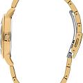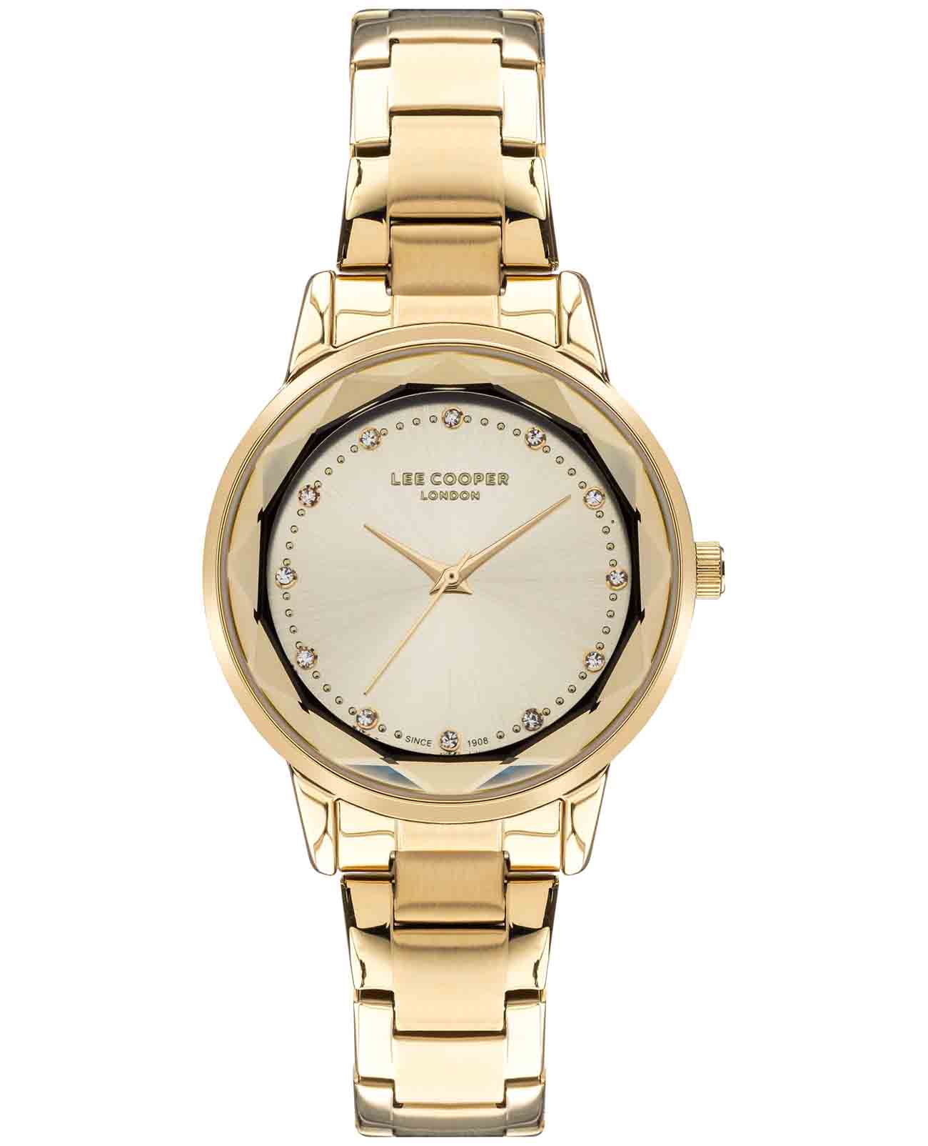 Женские наручные часы Lee Cooper LC07501.120 — это элегантная модель с утончённым дизайном. Корпус диаметром 34 мм выполнен из суперметалла с IP-покрытиемIP-покрытиеМетод ионного напыления. Демонстрирует повышенную устойчивость к истиранию, окислению и химическим веществам. Под воздействием высокого давления и температуры около 1500°C молекулы металла надёжно соединяются с частицами корпуса часов., что придаёт часам изысканный вид. Золотистый циферблат украшен изящными стрелками и вставками из циркония в виде меток, обеспечивая удобное считывание времени. Циферблат защищён минеральным стекломМинеральное стеклоМинеральное стекло представляет собой искусственно выращенный минерал кварца. Такое стекло отличается особой устойчивостью к повреждениям и царапинам. Уступает по некоторым качествам сапфировому стеклу., устойчивым к царапинам. Часы работают на кварцевом механизме, обеспечивая точность хода. Браслет из нержавеющей стали с раскладной застёжкойРаскладная застёжкаТакой тип застёжки используется только на браслетах из металла. Она никогда не раскрывается полностью, происходит разделение на 2 и более частей. Раскладывающая застёжка снизит вероятность потери часов к минимуму. гарантирует комфортное ношение и надёжную фиксацию на запястье. Водозащита 30 метров защищает часы от случайных брызг и дождя, делая их подходящими для повседневного использования.