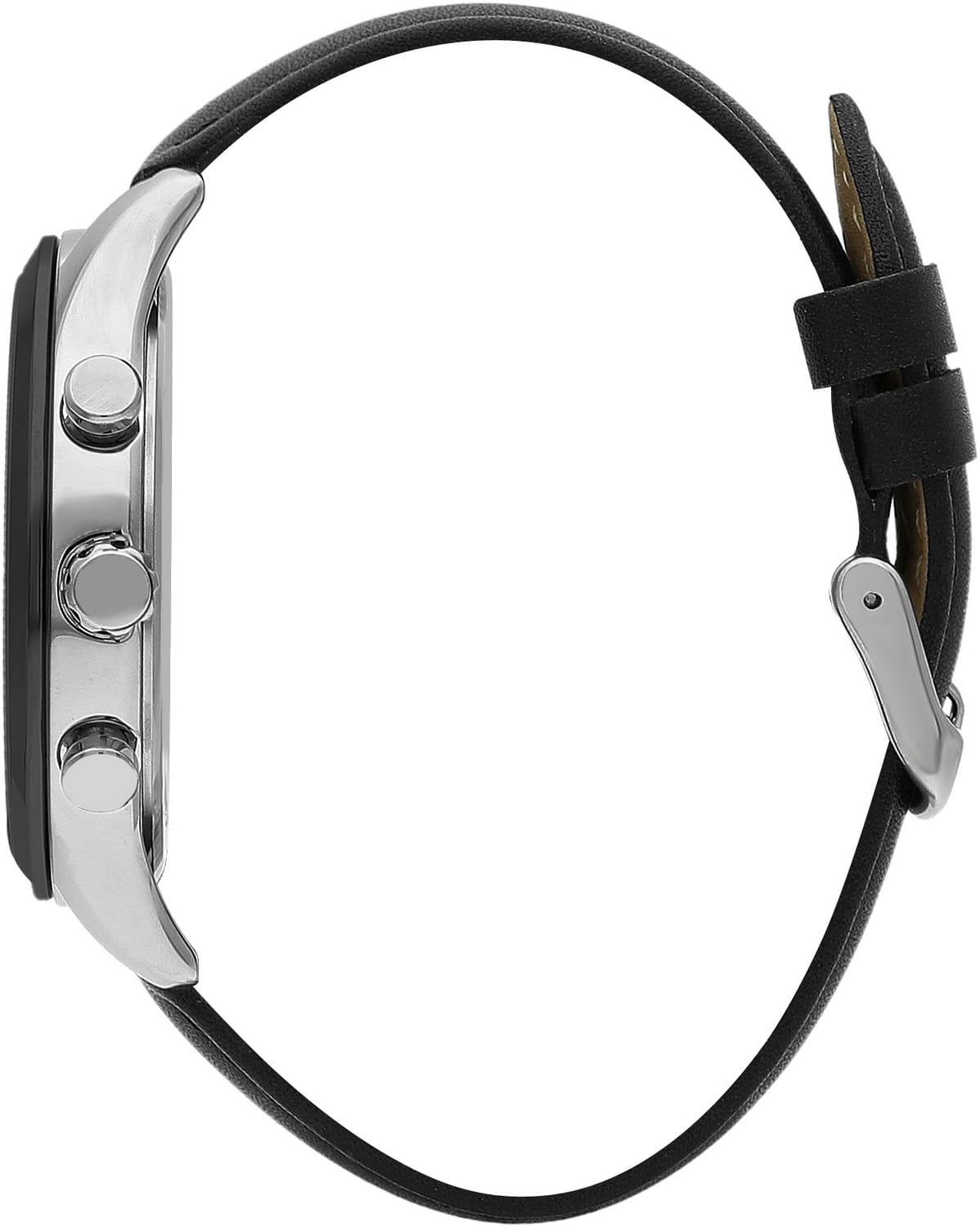 Мужские наручные часы Lee Cooper LC07713.351 оснащены кварцевым механизмом, обеспечивающий высокую точность хода и надежность. Элегантный корпус часов выполнен из суперметалла серебристого цвета, что делает их устойчивыми к внешним воздействиям и придает благородный вид. Неподвижный безельБезельВнешний ободок, закрепляющий стекло. В спортивных часах так называется поворотное кольцо с делениями на циферблате, выполняет роль таймера – замеряет отрезки времени на шкале. Неподвижный безель – элемент декора. Однонаправленно вращающийся безель на дайверских часах позволяет фиксировать моменты погружения и выныривания на поверхность. с IP-покрытиемIP-покрытиеМетод ионного напыления. Демонстрирует повышенную устойчивость к истиранию, окислению и химическим веществам. Под воздействием высокого давления и температуры около 1500°C молекулы металла надёжно соединяются с частицами корпуса часов. черного цвета придает модели особый блеск. Циферблат украшен классическими стрелками и метками с люминесцентным покрытиемЛюминесцентное покрытиеПозволяет считывать показания времени в темноте. Производители наносят на стрелки, часовые индексы, безель или поверхность циферблата светонакопительный состав, дающий холодное свечение., гармонично дополняющим общий дизайн модели. Для защиты циферблата используется минеральное стеклоМинеральное стеклоМинеральное стекло представляет собой искусственно выращенный минерал кварца. Такое стекло отличается особой устойчивостью к повреждениям и царапинам. Уступает по некоторым качествам сапфировому стеклу., устойчивое к царапинам и механическим повреждениям. Корпус диаметром 45 мм, что делает часы заметными и подходящими для любого образа. Кожаный ремешок на стандартной застёжке обеспечивает комфортное и безопасное ношение. Окошко даты находится в положении 4 часов. Часы обладают водонепроницаемостью до 50 метров (5 АТМ), что позволяет использовать их в повседневной жизни, включая контакт с водой при мытье рук или дожде. Эти часы станут идеальным выбором для мужчин, ценящих стиль, качество и функциональность.