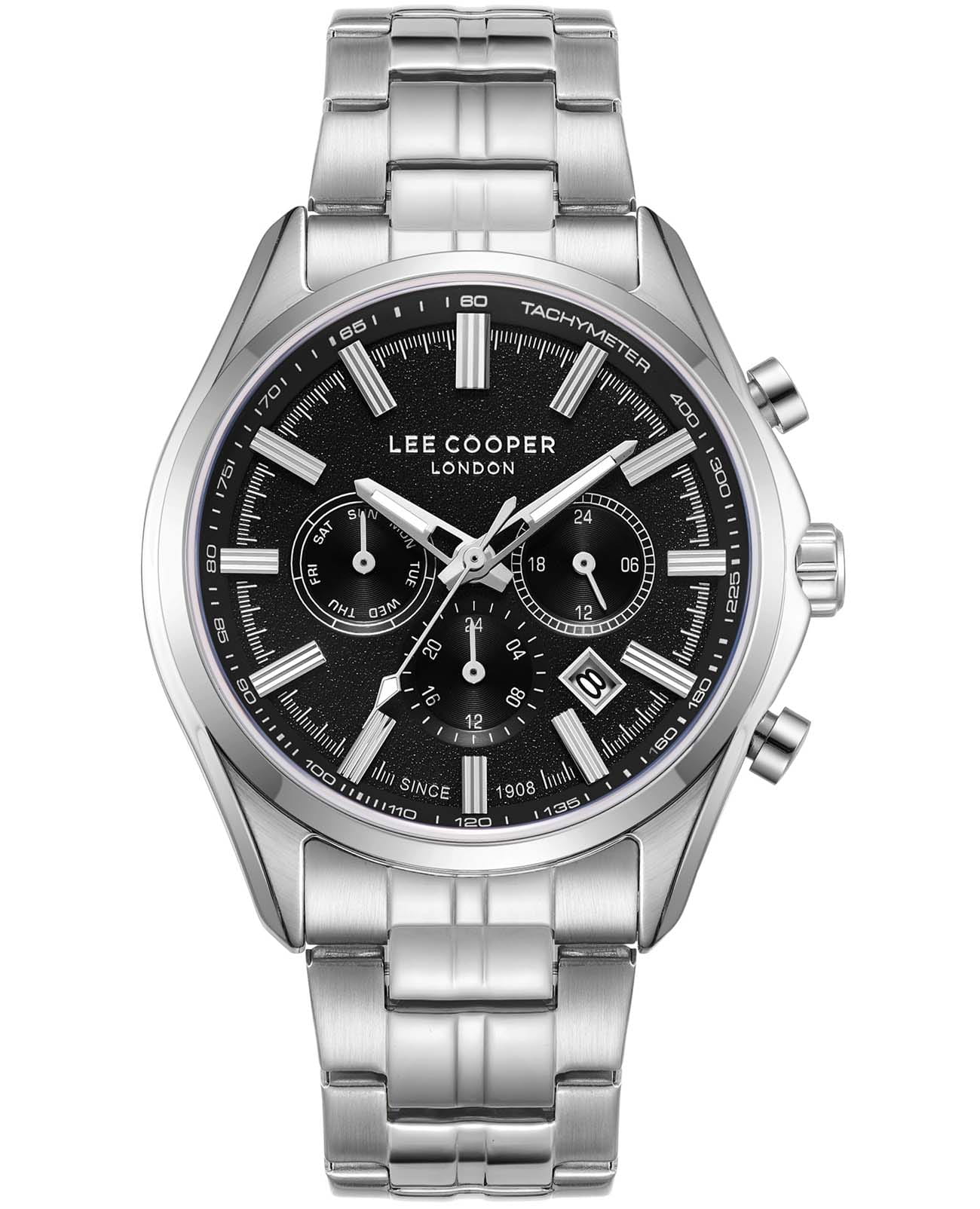 Мужские наручные часы Lee Cooper LC08199.350 оснащены кварцевым механизмом, обеспечивающий высокую точность хода и надежность. Элегантный корпус часов выполнен из суперметалла серебристого цвета, что делает их устойчивыми к внешним воздействиям и придает благородный вид. Циферблат украшен классическими стрелками с люминесцентным покрытиемЛюминесцентное покрытиеПозволяет считывать показания времени в темноте. Производители наносят на стрелки, часовые индексы, безель или поверхность циферблата светонакопительный состав, дающий холодное свечение., гармонично дополняющим общий дизайн модели. Для защиты циферблата используется минеральное стеклоМинеральное стеклоМинеральное стекло представляет собой искусственно выращенный минерал кварца. Такое стекло отличается особой устойчивостью к повреждениям и царапинам. Уступает по некоторым качествам сапфировому стеклу., устойчивое к царапинам и механическим повреждениям, тахиметрТахиметрРазмеченная шкала, располагается на ободке или безеле часов. Тахиметр позволяет рассчитать скорость на определённом участке пути, расстояние измеряется в километрах или милях. по внешнему краю. Корпус имеет круглую форму диаметром 44 мм, что делает часы заметными и подходящими. Браслет из стали оснащен раскладной застёжкойРаскладная застёжкаТакой тип застёжки используется только на браслетах из металла. Она никогда не раскрывается полностью, происходит разделение на 2 и более частей. Раскладывающая застёжка снизит вероятность потери часов к минимуму., обеспечивающим комфортное и безопасное ношение. Вынесенный циферблат с 24-х часовым указателем времени, индикацией даты и дня недели. Окошко даты находится в положении между 4 и 5 часов. Часы обладают водонепроницаемостью до 30 метров (3 АТМ), что позволяет использовать их в повседневной жизни, включая контакт с водой при мытье рук или дожде. Эти часы станут идеальным выбором для мужчин, ценящих стиль, качество и функциональность.