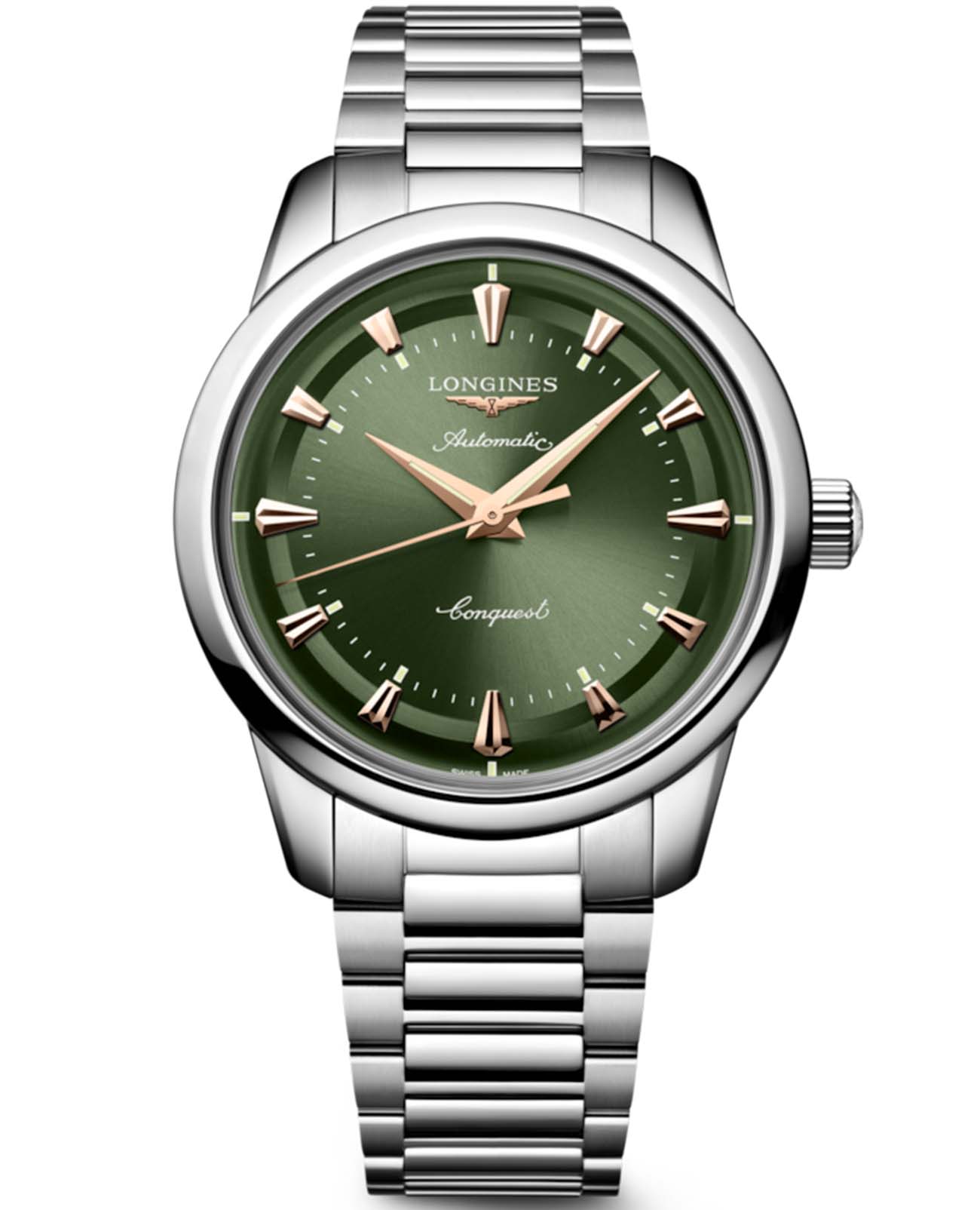 Longines Conquest Heritage L1.650.4.02.6 — это воплощение классической элегантности и швейцарского совершенства, объединяющее в себе богатое наследие марки и современные технологии. Корпус и браслет выполнены из высококачественной нержавеющей стали диаметром 40 мм и украшен оригинальным медальоном из золота 18 карат с изображением рыбы на задней крышке, что подчеркивает исключительность этой модели. Зеленый циферблат с полированной поверхностью, украшенный изящными накладными индексами в виде штрихов, создает благородный акцен. Браслет оснащён двойной раскладной застёжкойРаскладная застёжкаТакой тип застёжки используется только на браслетах из металла. Она никогда не раскрывается полностью, происходит разделение на 2 и более частей. Раскладывающая застёжка снизит вероятность потери часов к минимуму. с системой микрорегулировки, обеспечивая максимальный комфорт при носке. Также на циферблате располагаются полированные стрелки с люминесцентным покрытиемЛюминесцентное покрытиеПозволяет считывать показания времени в темноте. Производители наносят на стрелки, часовые индексы, безель или поверхность циферблата светонакопительный состав, дающий холодное свечение. Swiss Super-LumiNova для отличной читаемости в любое время суток. Механизм с автоподзаводом калибра L888 обеспечивает точность хода и запас хода до 72 часов, а устойчивость к магнитным полям гарантирует стабильную работу даже в насыщенных электромагнитных условиях. Сапфировое стеклоСапфировое стеклоПрочный и надёжный материал из кристалла сапфира синтетического происхождения, характеризующийся особой твёрдостью и устойчивостью к царапинам и повреждениям. с двусторонним многослойным антибликовым покрытием надежно защищает циферблат от царапин и бликов, сохраняя безупречный внешний вид на долгие годы. Часы выдерживают давление до 5 бар (50 метров), что позволяет не снимать их во время мытья рук или прогулок под дождем. Завинчивающаяся заводная головка и продуманная конструкция корпуса подчеркивают высокий уровень исполнения каждой детали.