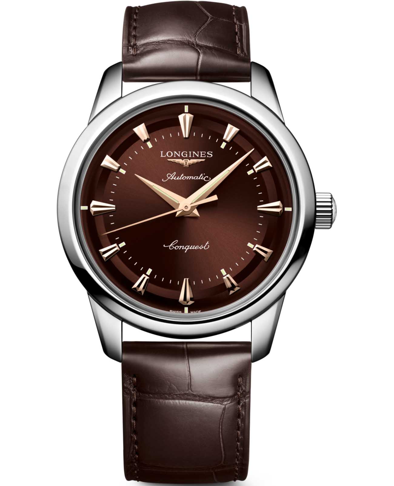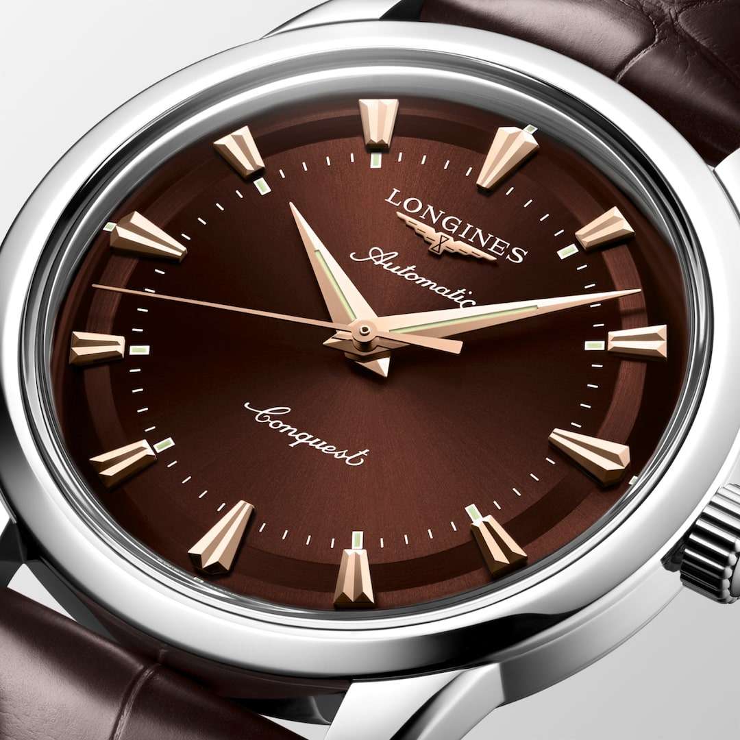 Longines Conquest Heritage L1.650.4.62.2 — это воплощение классической элегантности и швейцарского совершенства, объединяющее в себе богатое наследие марки и современные технологии. Корпус часов выполнен из высококачественной нержавеющей стали диаметром 40 мм и украшен оригинальным медальоном из золота 18 карат с изображением рыбы на задней крышке, что подчеркивает исключительность этой модели. Коричневый циферблат с полированной поверхностью, украшенный изящными накладными индексами в виде штрихов, создает благородный акцент и идеально сочетается с кожаным ремешком коричневого цвета, дополненным надежной стальной застежкой. Также на циферблате располагаются полированные стрелки с люминесцентным покрытиемЛюминесцентное покрытиеПозволяет считывать показания времени в темноте. Производители наносят на стрелки, часовые индексы, безель или поверхность циферблата светонакопительный состав, дающий холодное свечение. Swiss Super-LumiNova для отличной читаемости в любое время суток. Механизм с автоподзаводом калибра L888 обеспечивает точность хода и запас хода до 72 часов, а устойчивость к магнитным полям гарантирует стабильную работу даже в насыщенных электромагнитных условиях. Сапфировое стеклоСапфировое стеклоПрочный и надёжный материал из кристалла сапфира синтетического происхождения, характеризующийся особой твёрдостью и устойчивостью к царапинам и повреждениям. с двусторонним многослойным антибликовым покрытием надежно защищает циферблат от царапин и бликов, сохраняя безупречный внешний вид на долгие годы. Часы выдерживают давление до 5 бар (50 метров), что позволяет не снимать их во время мытья рук или прогулок под дождем. Завинчивающаяся заводная головка и продуманная конструкция корпуса подчеркивают высокий уровень исполнения каждой детали.