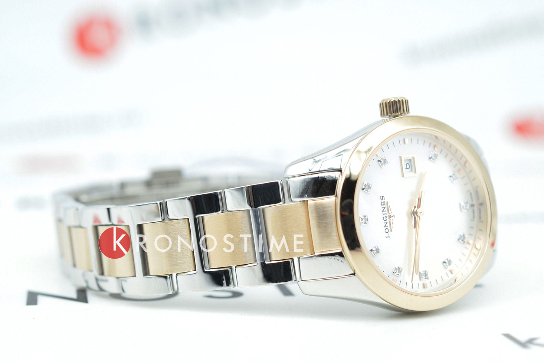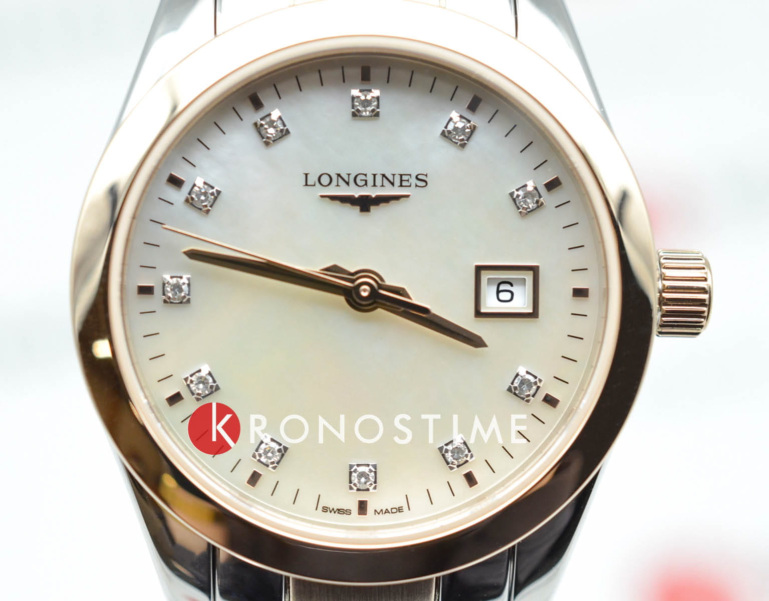 Женские швейцарские часы Longines Conquest Classic L2.286.3.87.7 — это изысканный аксессуар, способный подчеркнуть ваш безупречный вкус и деловой стиль. Модель с белым перламутровым циферблатом, выполненным из высококачественной нержавеющей стали 316L с элегантным безелемБезельВнешний ободок, закрепляющий стекло. В спортивных часах так называется поворотное кольцо с делениями на циферблате, выполняет роль таймера – замеряет отрезки времени на шкале. Неподвижный безель – элемент декора. Однонаправленно вращающийся безель на дайверских часах позволяет фиксировать моменты погружения и выныривания на поверхность. с розово-золотистым PVD-покрытиемPVDУльтратонкое покрытие наносится в технике вакуумного напыления, сочетает в себе нитрид титана особой прочности со слоем золота или оксида хрома. Несёт в себе декоративную или защитную функцию., обладает исключительной устойчивостью к деформации и повреждениям. Циферблат украшен 11 бриллиантами общей массой 0.055 карата, придающими часам особое очарование и блеск. Швейцарский кварцевый калибр L152 обеспечивает безупречную точность хода, а многослойное сапфировое стеклоСапфировое стеклоПрочный и надёжный материал из кристалла сапфира синтетического происхождения, характеризующийся особой твёрдостью и устойчивостью к царапинам и повреждениям. с антибликовым покрытиемАнтибликовое покрытиеСлой оксида металла в 0,13-0,3 микрон, благодаря которому стекло часов не бликует и не отражает свет. Антибликовое покрытие уменьшает отражение света в 10 раз, обеспечивая отличную читаемость показателей циферблата. защищает циферблат от царапин и повреждений, сохраняя его первозданный вид на долгие годы. Среди множества полезных функций этих часов вы найдете отображение даты и EOLEOLПредставляет собой систему, уведомляющую владельца часов о необходимости замены элемента питания. За 2 недели до полного разряда батарейки секундная стрелка перестаёт ходить чётко и начинает перепрыгивать на 3-4 деления., что делает их не только стильным украшением, но и практичным инструментом для повседневного использования. Стальной браслет с розово-золотистым IP-покрытиемIP-покрытиеМетод ионного напыления. Демонстрирует повышенную устойчивость к истиранию, окислению и химическим веществам. Под воздействием высокого давления и температуры около 1500°C молекулы металла надёжно соединяются с частицами корпуса часов. и с удобной застежкой «бабочка»Застёжка "бабочка"Такой вид застёжки дополняется предохранителями, помогающими избежать случайного раскрытия браслета. Обладают изящным исполнением. обеспечивает комфортную посадку на запястье.