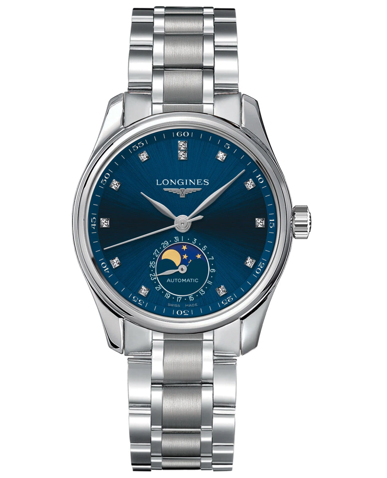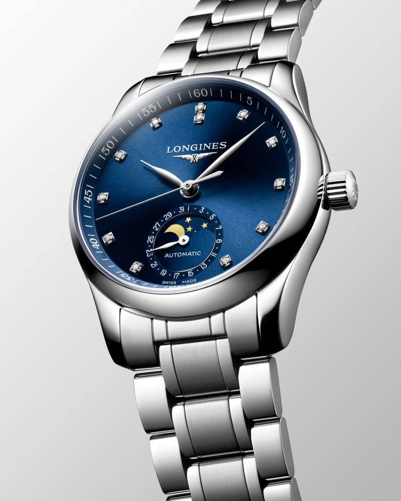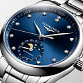 Женские швейцарские механические часы с автоподзаводом Longines Master Collection L2.409.4.97.6. Сапфировое стеклоСапфировое стеклоПрочный и надёжный материал из кристалла сапфира синтетического происхождения, характеризующийся особой твёрдостью и устойчивостью к царапинам и повреждениям. устойчивое к появлению царапин, обладающее высокой прозрачностью. Корпус часов изготовлен из нержавеющей стали. Циферблат с 12 бриллиантами группы Top Wesselton VS-SI общим весом 0.055 карата. Автоматический механизм с частотой баланса 25 200 полуколебаний в час и запасом хода, которого хватает примерно на 72 часа работы. Часы, минуты, секунды, маленький стрелочный указатель фаз Луны и даты в положении 6 часов. Прозрачная задняя крышка. Класс водозащиты: 30 метров, позволит защитить корпус от случайных брызг или капель дождя. Стальной браслет на застёжке «бабочка» с кнопкамиЗастёжка "бабочка"Такой вид застёжки дополняется предохранителями, помогающими избежать случайного раскрытия браслета. Обладают изящным исполнением. .