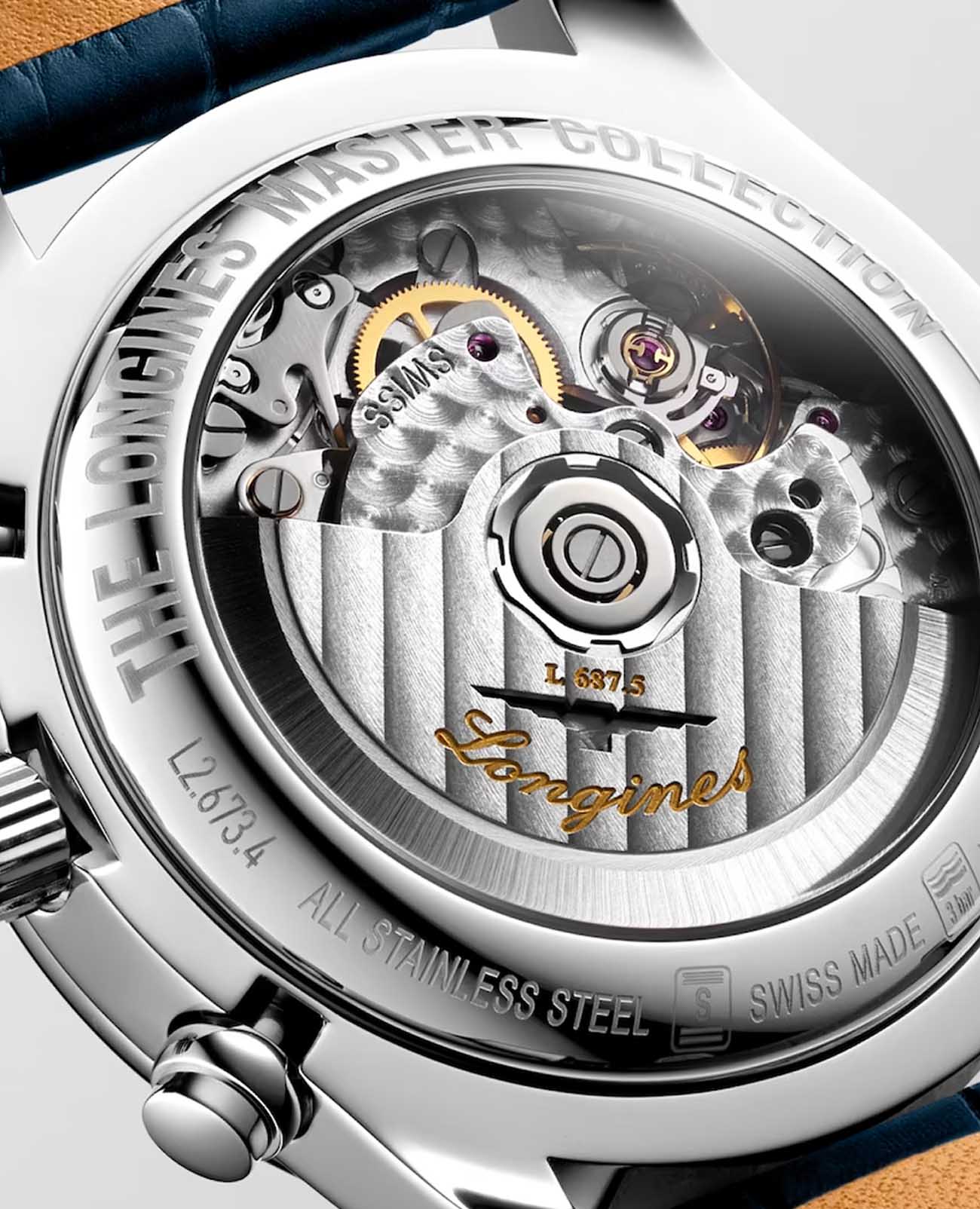 Мужсике швейцарские механические часы-хронографХронографФункция позволяет измерять отрезки времени с особой точностью: часы, минуты, секунды. Верным признаком хронографа является наличие на циферблате 3 дополнительных окошек-счётчиков. с автоподзаводом Longines Master Collection L2.673.4.71.2. Сапфировое стеклоСапфировое стеклоПрочный и надёжный материал из кристалла сапфира синтетического происхождения, характеризующийся особой твёрдостью и устойчивостью к царапинам и повреждениям. устойчивое к появлению царапин, обладающее высокой прозрачностью. Корпус часов изготовлен из нержавеющей стали. Функции: часы, минуты, малая секундная стрелка с 24-часовым индикатором в положении 9 часов. Дату показывает центральная стрелка с серповидным наконечником. Указатель фаз Луны в положении 6 часов. Прозрачная задняя крышка. Класс водозащиты: 30 метров, позволит защитить корпус от случайных брызг или капель дождя. Ремешок из кожи аллигатора на застёжке «бабочка» с кнопкамиЗастёжка "бабочка"Такой вид застёжки дополняется предохранителями, помогающими избежать случайного раскрытия браслета. Обладают изящным исполнением. .