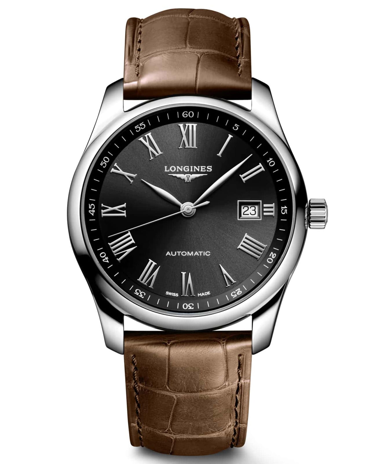 Швейцарские механические часы Longines Master Collection L2.793.4.59.2. Сапфировое стеклоСапфировое стеклоПрочный и надёжный материал из кристалла сапфира синтетического происхождения, характеризующийся особой твёрдостью и устойчивостью к царапинам и повреждениям. устойчивое к появлению царапин, обладающее высокой прозрачностью. Корпус часов изготовлен из нержавеющей стали. Окошко даты в положении 3 часа. Автоматический механизм с частотой баланса 25 200 полуколебаний в час и запасом хода, которого хватает примерно на 72 часа работы. Класс водозащиты: 30 метров, позволит защитить корпус от случайных брызг или капель дождя. Ремешок из кожи аллигатора на застёжке «бабочка» с кнопкамиЗастёжка "бабочка"Такой вид застёжки дополняется предохранителями, помогающими избежать случайного раскрытия браслета. Обладают изящным исполнением. .