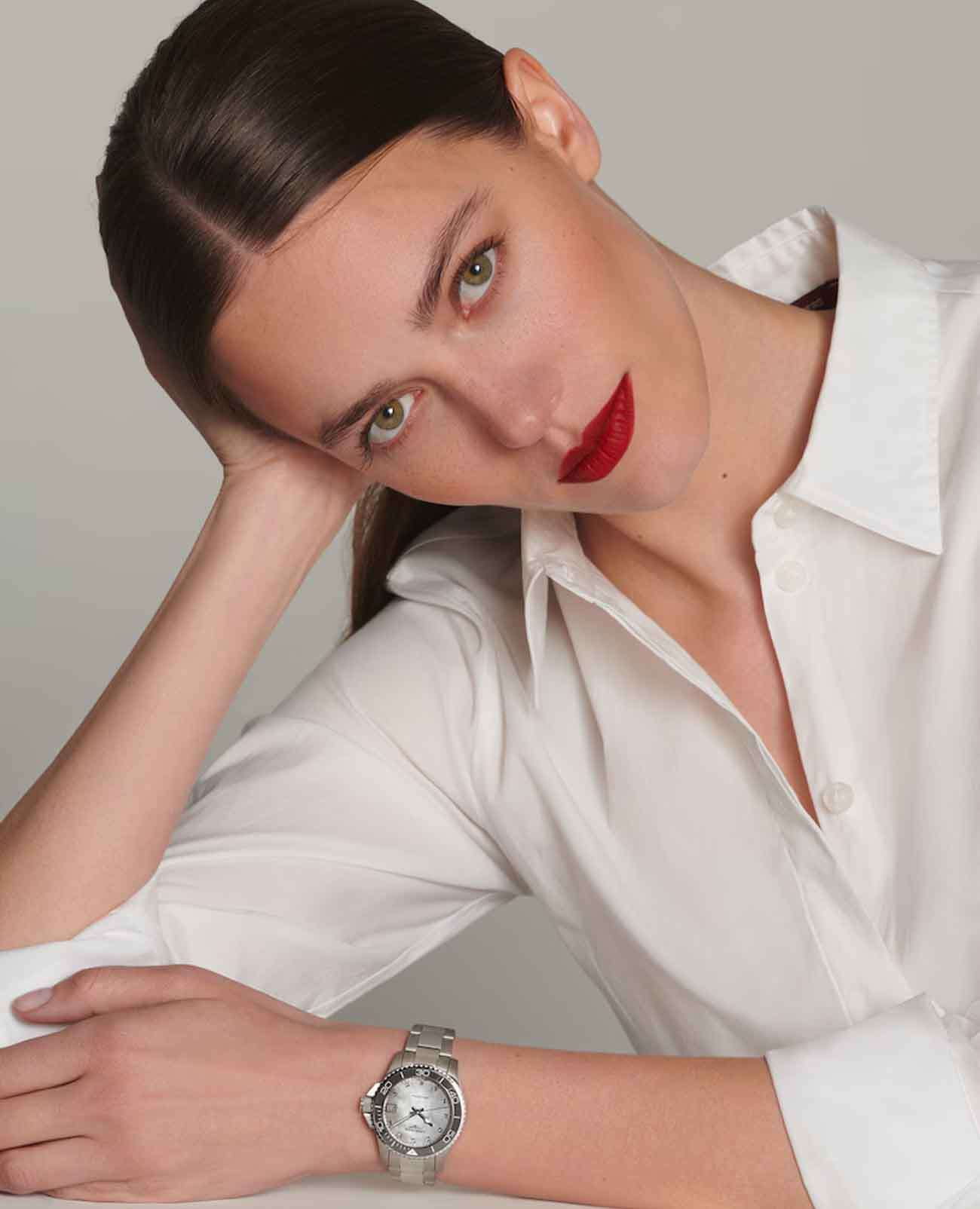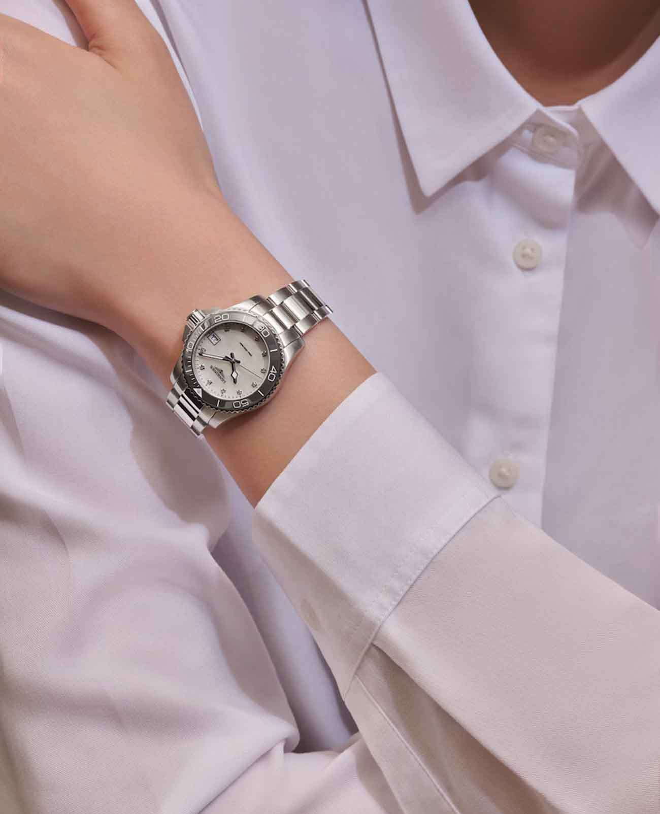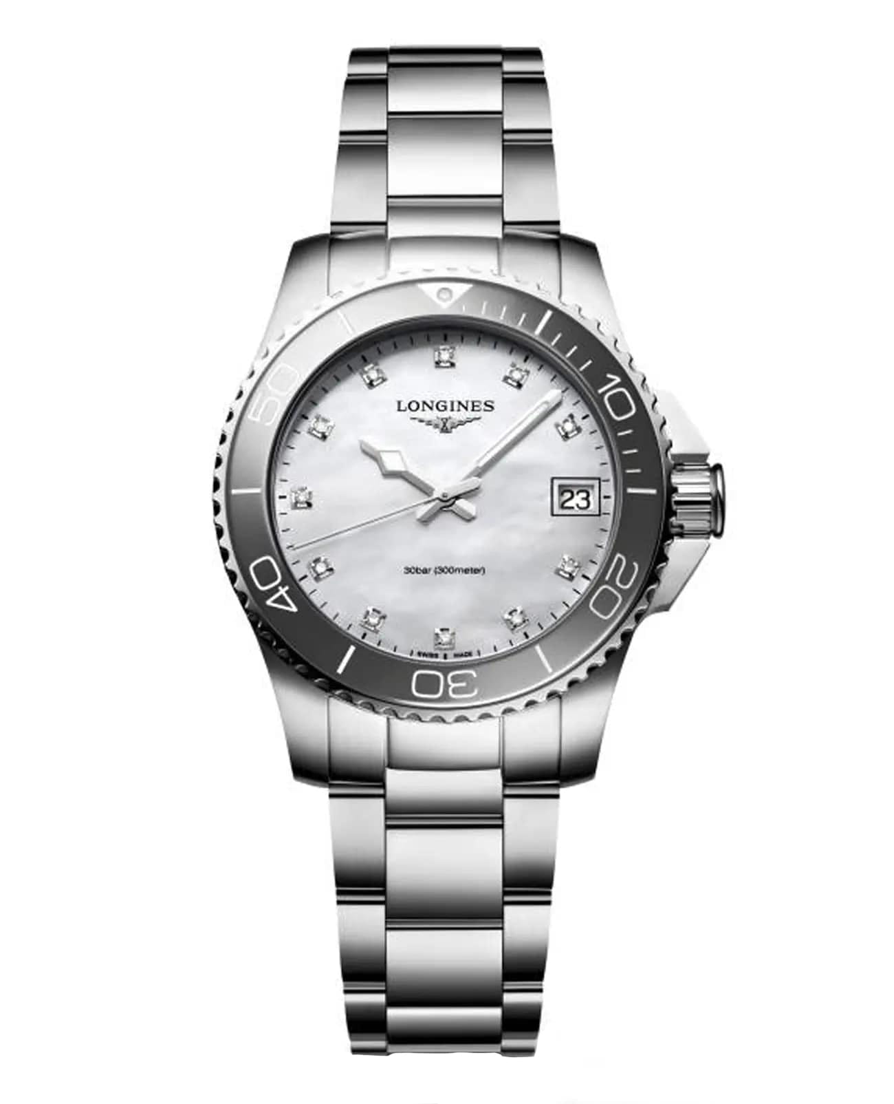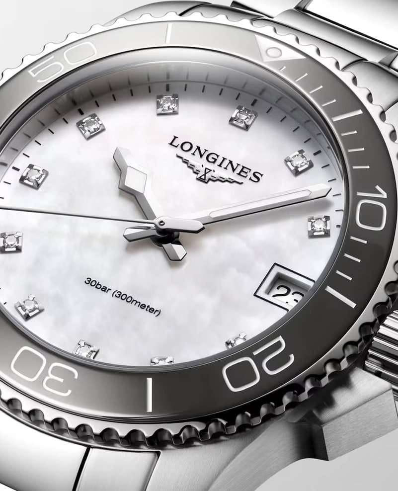 Швейцарские часы для дайвинга Longines HydroConquest L3.370.4.87.6, кварцевый механизм с высокой точностью. Сапфировое стеклоСапфировое стеклоПрочный и надёжный материал из кристалла сапфира синтетического происхождения, характеризующийся особой твёрдостью и устойчивостью к царапинам и повреждениям. с многослойным антибликовым покрытием с обеих сторон, устойчивое к появлению царапин, обладающее высокой прозрачностью. Корпус часов изготовлен из стали. Вращающийся безельБезельВнешний ободок, закрепляющий стекло. В спортивных часах так называется поворотное кольцо с делениями на циферблате, выполняет роль таймера – замеряет отрезки времени на шкале. Неподвижный безель – элемент декора. Однонаправленно вращающийся безель на дайверских часах позволяет фиксировать моменты погружения и выныривания на поверхность. из стали и керамики, защищенный от царапин, никогда не изнашивается и не выцветает. Циферблат с 11 бриллиантами группы Top Wesselton VS-SI общим весом 0.044 карата. Стрелки и метки с люминесцентным покрытиемЛюминесцентное покрытиеПозволяет считывать показания времени в темноте. Производители наносят на стрелки, часовые индексы, безель или поверхность циферблата светонакопительный состав, дающий холодное свечение.. Окошко даты находится в положении 3 часов. Класс водозащиты: 300 метров, позволит плавать, нырять и заниматься другими водными видами спорта. Стальной на раскладной застёжкеРаскладная застёжкаТакой тип застёжки используется только на браслетах из металла. Она никогда не раскрывается полностью, происходит разделение на 2 и более частей. Раскладывающая застёжка снизит вероятность потери часов к минимуму..