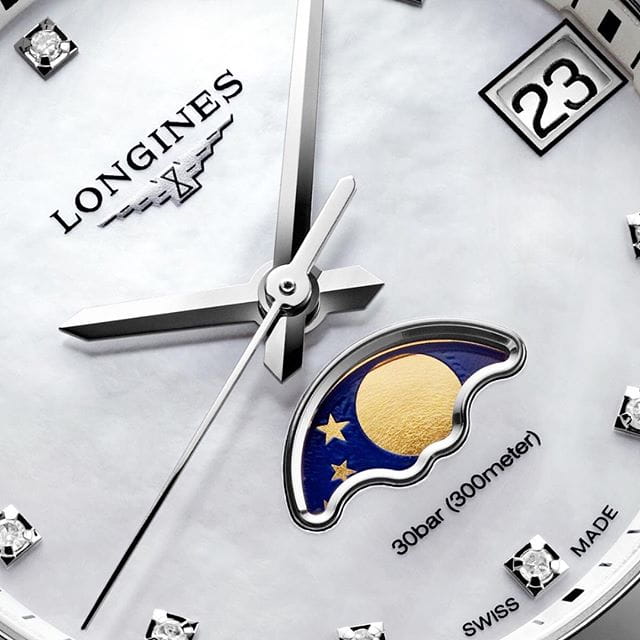 Минималистичный перламутровый циферблат декорирован драгоценными камнями, использовано 11 бриллиантов весом в 0,036 карата. Швейцарский кварцевый калибр L296 измеряет время с высокой точностью. Стекло из сапфира имеет многослойное антибликовое покрытиеАнтибликовое покрытиеСлой оксида металла в 0,13-0,3 микрон, благодаря которому стекло часов не бликует и не отражает свет. Антибликовое покрытие уменьшает отражение света в 10 раз, обеспечивая отличную читаемость показателей циферблата.. Корпус и браслет выполнены из нержавеющей стали 316L. Функции: отображение даты, индикатор EOLEOLПредставляет собой систему, уведомляющую владельца часов о необходимости замены элемента питания. За 2 недели до полного разряда батарейки секундная стрелка перестаёт ходить чётко и начинает перепрыгивать на 3-4 деления., индикация фаз луны.
