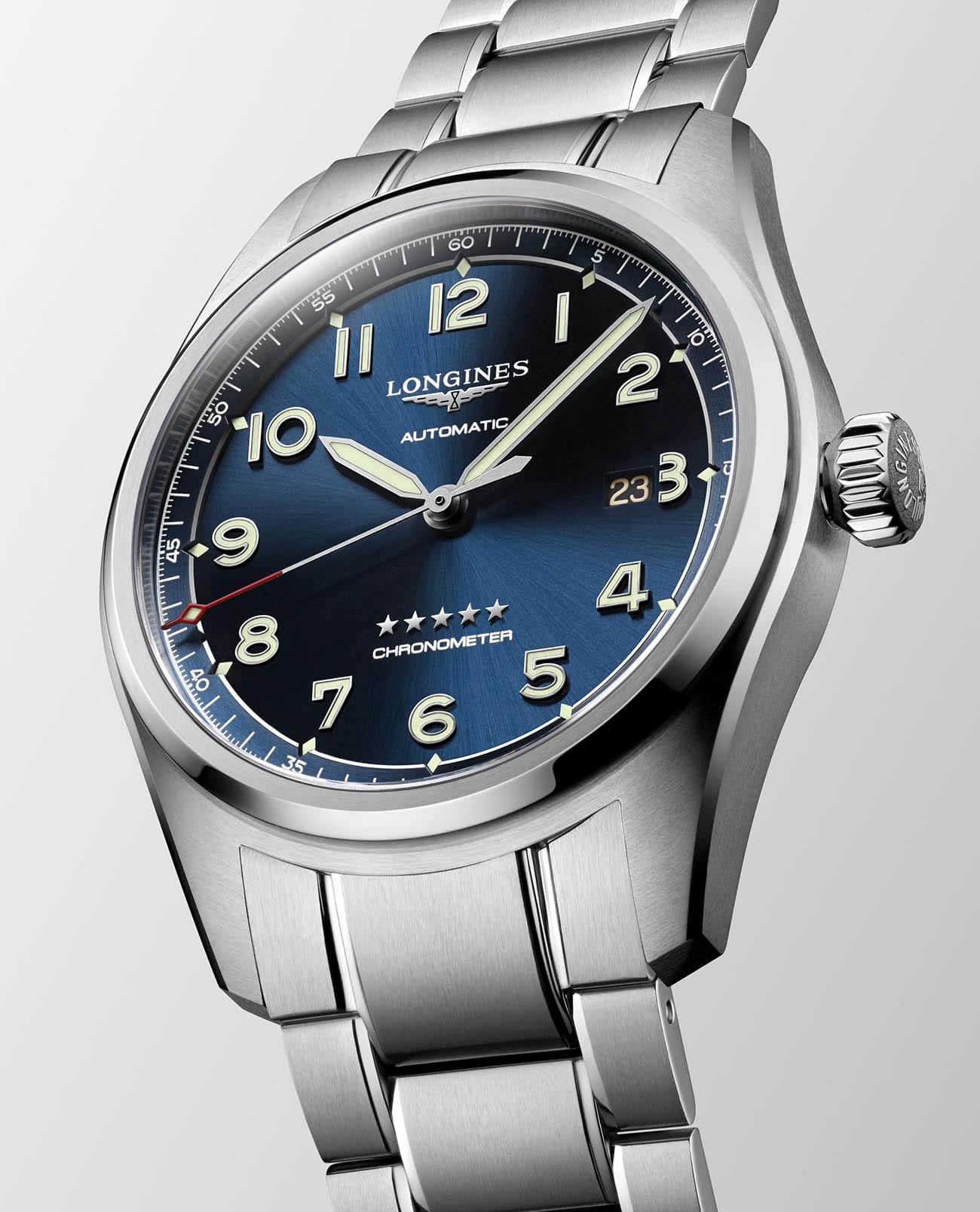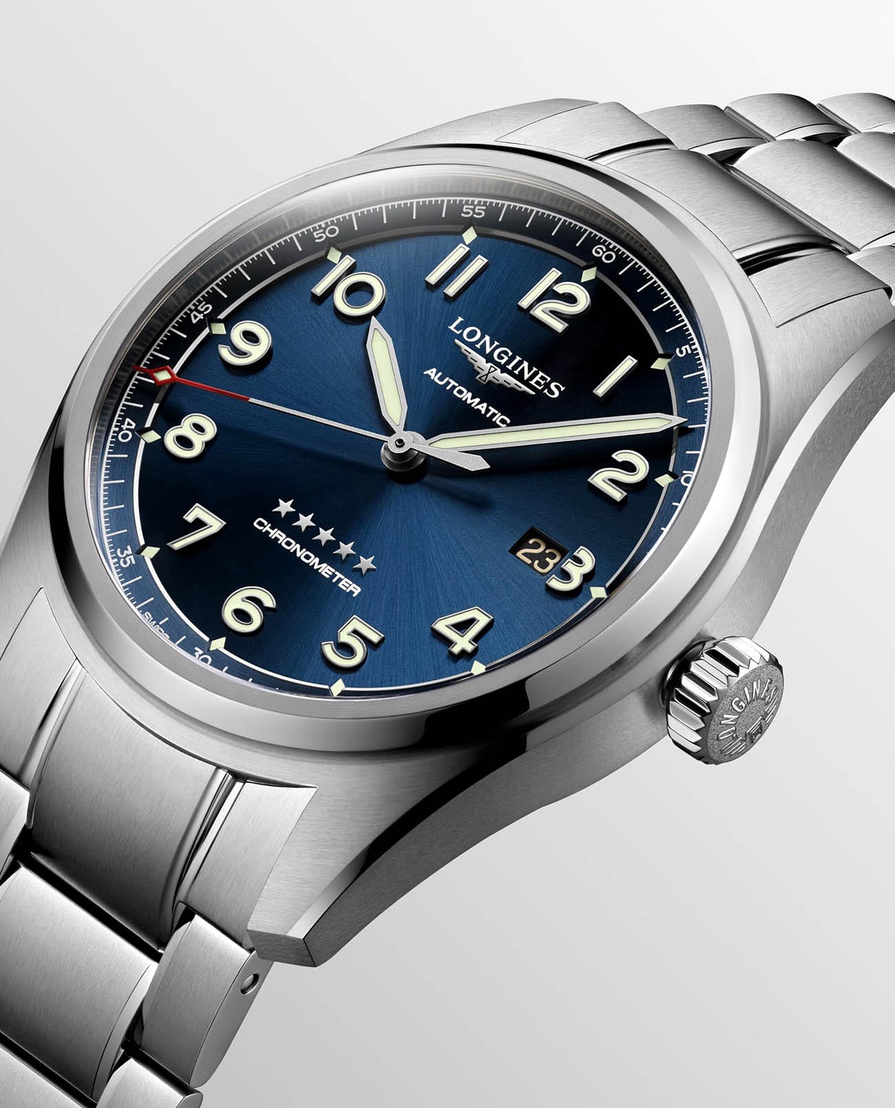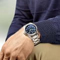 Особенностью является сапфировое стеклоСапфировое стеклоПрочный и надёжный материал из кристалла сапфира синтетического происхождения, характеризующийся особой твёрдостью и устойчивостью к царапинам и повреждениям. с двухсторонним антибликовым покрытиемАнтибликовое покрытиеСлой оксида металла в 0,13-0,3 микрон, благодаря которому стекло часов не бликует и не отражает свет. Антибликовое покрытие уменьшает отражение света в 10 раз, обеспечивая отличную читаемость показателей циферблата., что гарантирует отличную видимость циферблата в различных условиях. Стрелки и метки с люминесцентнымЛюминесцентное покрытиеПозволяет считывать показания времени в темноте. Производители наносят на стрелки, часовые индексы, безель или поверхность циферблата светонакопительный состав, дающий холодное свечение. покрытием помогают легко считывать время даже в сумеречных условиях. Часы обладают классом водозащиты 100 метров, что позволяет использовать их для плавания и активного отдыха на воде. Стальной браслет с застёжкой «бабочка» с кнопкамиЗастёжка "бабочка"Такой вид застёжки дополняется предохранителями, помогающими избежать случайного раскрытия браслета. Обладают изящным исполнением. добавляет элементу дополнительную прочность и удобство в эксплуатации.