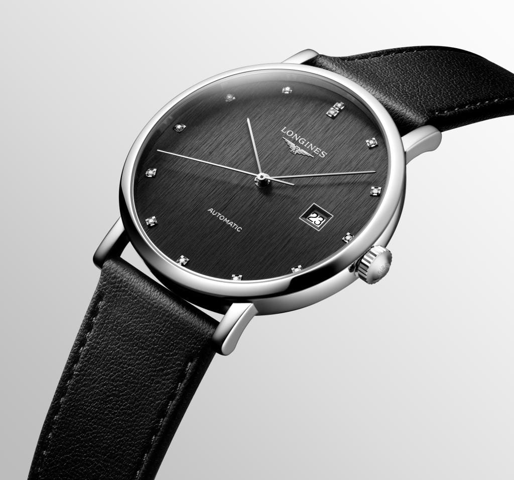 Мужские швейцарские механические часы с автоподзаводом Longines Elegant Collection L4.911.4.78.2. Сапфировое стеклоСапфировое стеклоПрочный и надёжный материал из кристалла сапфира синтетического происхождения, характеризующийся особой твёрдостью и устойчивостью к царапинам и повреждениям. устойчивое к появлению царапин, обладающее высокой прозрачностью. Корпус изготовлен из нержавещей стали. Циферблат украшен 13 бриллиантами группы Top Wesselton VS-SI общим весом 0.037 карата. Окошко даты находится в положении 3 часа. Класс водозащиты: 30 метров, позволит защитить корпус от случайных брызг или капель дождя. Кожаный ремешок на стандартной застежке.