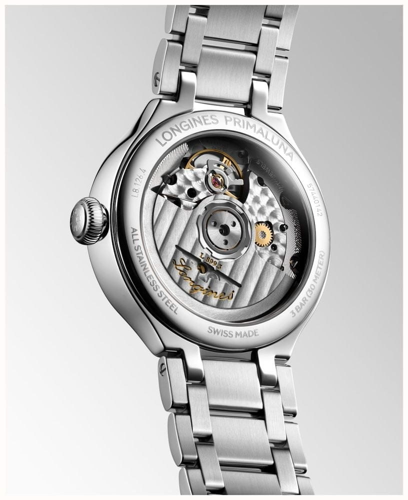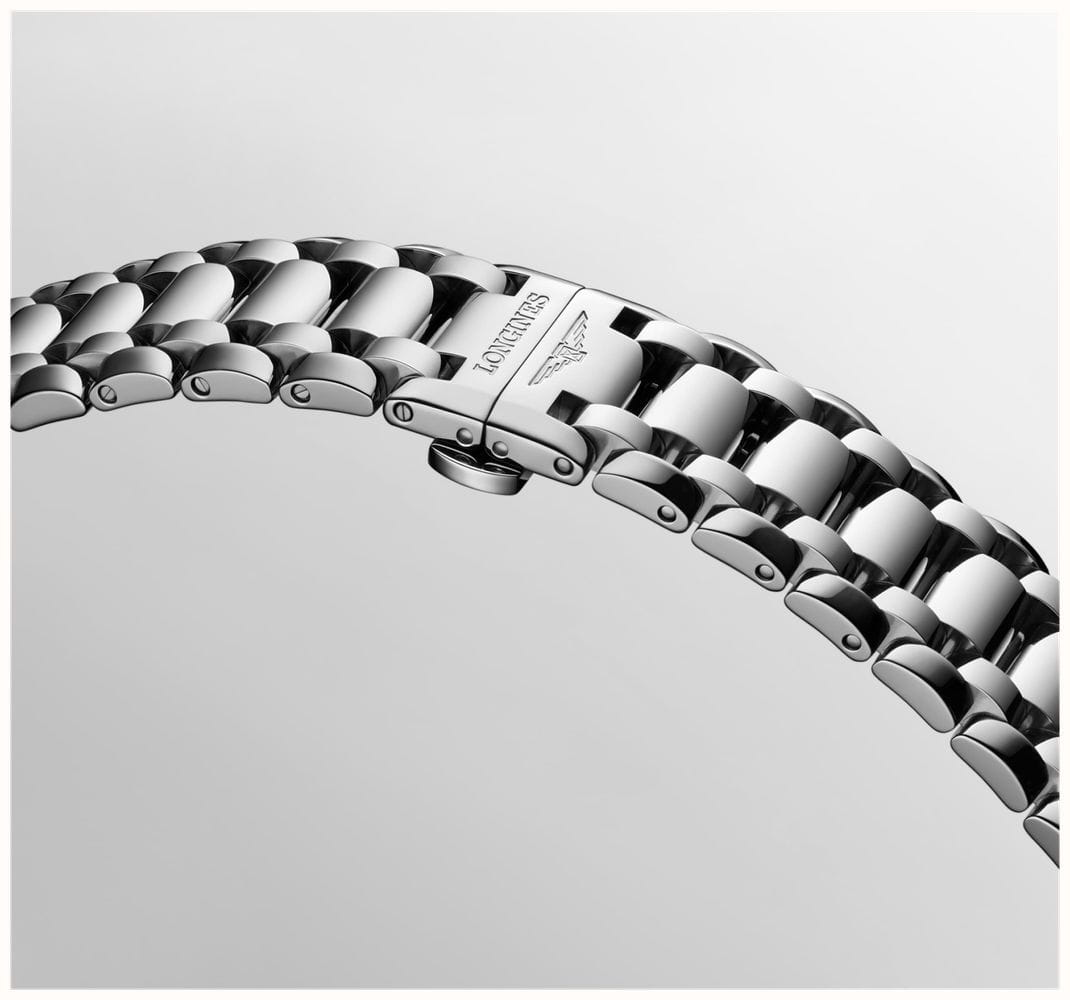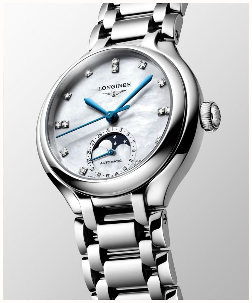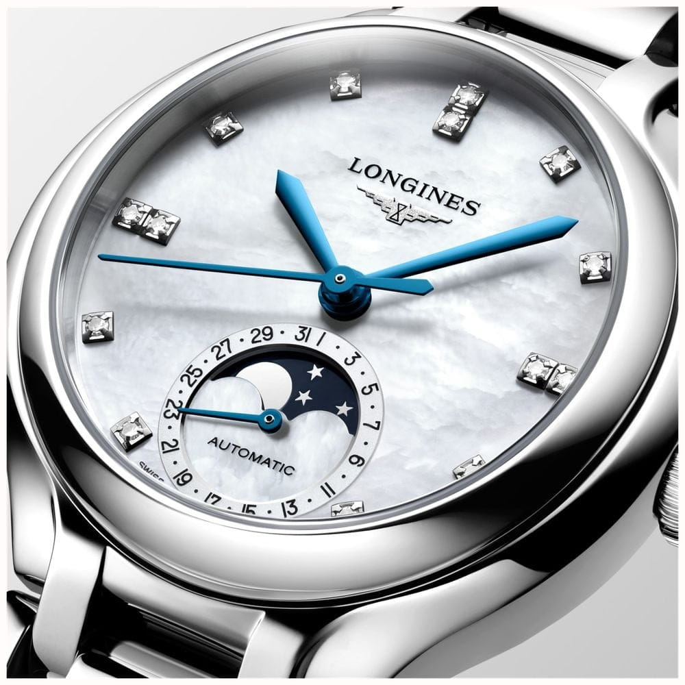 Женские швейцарские часы Longines PrimaLuna L8.126.4.87.6 - воплощает элегантность и женственность. Исключительно женственная коллекция, созданная с тщательным вниманием к деталям, она отражает изящность. Сапфировое стеклоСапфировое стеклоПрочный и надёжный материал из кристалла сапфира синтетического происхождения, характеризующийся особой твёрдостью и устойчивостью к царапинам и повреждениям. с антибликовым покрытиемАнтибликовое покрытиеСлой оксида металла в 0,13-0,3 микрон, благодаря которому стекло часов не бликует и не отражает свет. Антибликовое покрытие уменьшает отражение света в 10 раз, обеспечивая отличную читаемость показателей циферблата. устойчивое к появлению царапин, обладающее высокой прозрачностью. Корпус часов изготовлен из нержавеющей стали, диаметром 34 мм и толщиной 11,60 мм идеально подходит для изящного запястья. Указатель фазы луны в положении 6 часов.  На циферблате также расположены 14 бриллиантов высшего качества Wesselton VS-SI, которые служат часовыми метками. Класс водозащиты: 30 метров позволит защитить корпус от случайных брызг или капель дождя. Стальной браслет на застёжке «бабочка» с кнопкамиЗастёжка "бабочка"Такой вид застёжки дополняется предохранителями, помогающими избежать случайного раскрытия браслета. Обладают изящным исполнением. обеспечивает комфортную посадку на запястье. Внутри корпуса скрывается надежный автоматический механизм, гарантирующий точность хода и долгий срок службы. Каждая модель Longines PrimaLuna излучает красоту, которая неподвластна мимолетным тенденциям.
