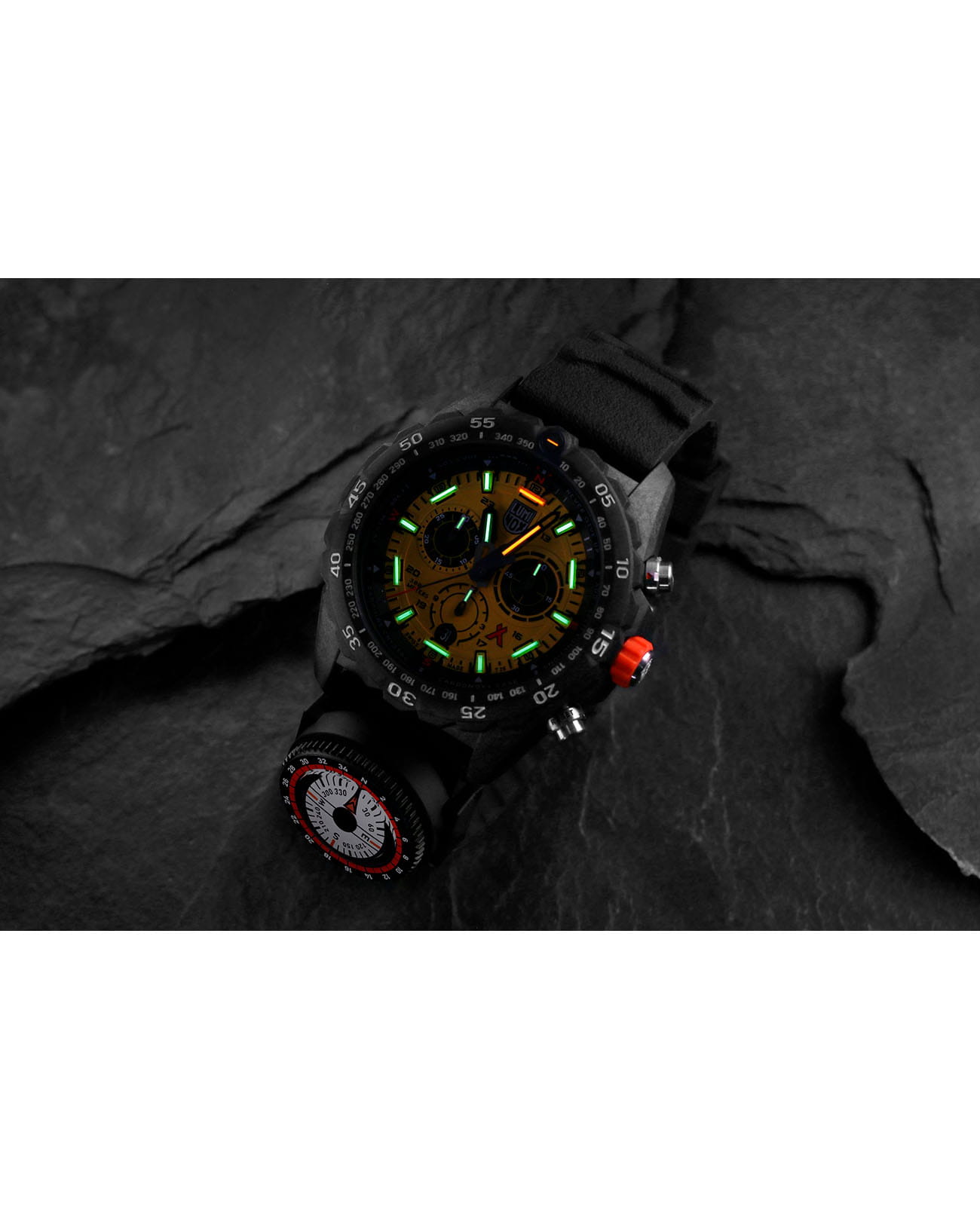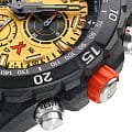 Мужские наручные часы-хронографХронографФункция позволяет измерять отрезки времени с особой точностью: часы, минуты, секунды. Верным признаком хронографа является наличие на циферблате 3 дополнительных окошек-счётчиков. Luminox Bear Grylls Survival Series XB.3745 разработаны для любителей активного образа жизни и экстремальных условий. Модель обладает круглым корпусом диаметром 45 мм, изготовленным из черного пластика, что обеспечивает исключительную прочность и легкость конструкции. Браслет выполнен из полиуретана черного цвета с текстурированной поверхностью, оснащен классической застежкой, гарантирующей комфортное ношение и безопасность. Циферблат украшен крупными индексами и стрелками с люминесцентным покрытиемЛюминесцентное покрытиеПозволяет считывать показания времени в темноте. Производители наносят на стрелки, часовые индексы, безель или поверхность циферблата светонакопительный состав, дающий холодное свечение., обеспечивающим отличную видимость в условиях недостаточной освещенности. Для защиты используется сапфировое стеклоСапфировое стеклоПрочный и надёжный материал из кристалла сапфира синтетического происхождения, характеризующийся особой твёрдостью и устойчивостью к царапинам и повреждениям. с антибликовым покрытиемАнтибликовое покрытиеСлой оксида металла в 0,13-0,3 микрон, благодаря которому стекло часов не бликует и не отражает свет. Антибликовое покрытие уменьшает отражение света в 10 раз, обеспечивая отличную читаемость показателей циферблата., которое не только защищает от царапин, но и обеспечивает четкое чтение времени при ярком свете. Часы работают на кварцевом механизме, который гарантирует точное время без необходимости подзаводки и имеет длительный срок службы батареи — около 3-4 лет. Модель также оснащена односторонним безелемБезельВнешний ободок, закрепляющий стекло. В спортивных часах так называется поворотное кольцо с делениями на циферблате, выполняет роль таймера – замеряет отрезки времени на шкале. Неподвижный безель – элемент декора. Однонаправленно вращающийся безель на дайверских часах позволяет фиксировать моменты погружения и выныривания на поверхность. с делениями для расчета времени погружения или выполнения других задач, а также функцией второго часового поясаВторой часовой поясФункция, позволяющая отображать время двух часовых поясов одновременно., что делает ее удобной для путешествий и международных перелетов. Водонепроницаемость часов достигает 300 метров (30 атмосфер), что позволяет использовать их во время плавания, дайвинга и других водных видов спорта. Luminox XB.3745 создан в сотрудничестве с Bear Grylls, сочетая в себе функциональность, надежность и стиль, необходимые для выживания в самых сложных условиях.