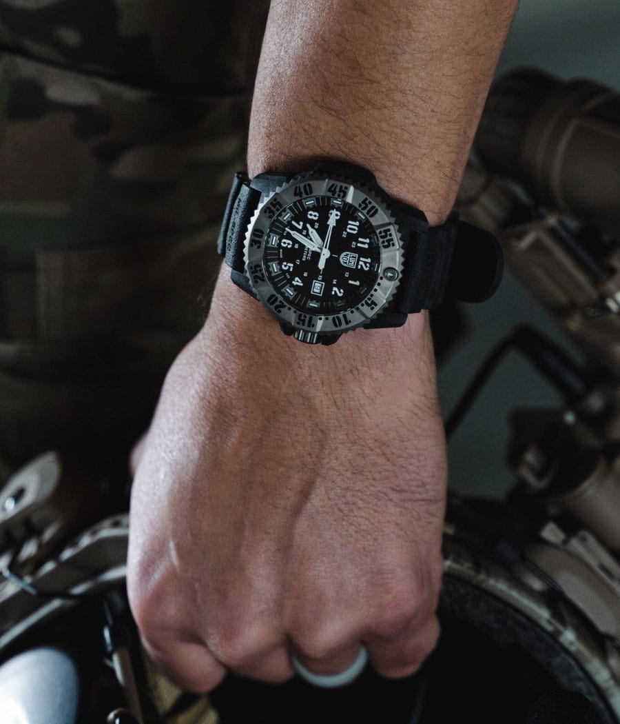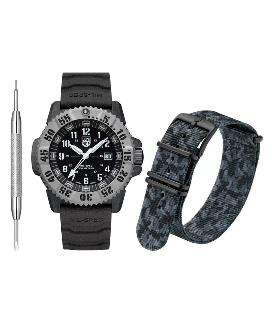 Luminox XL.3513.S.SET — мужская модель из коллекции Navy SEAL с мощным и функциональным дизайном, ориентированным на экстремальные условия. Корпус диаметром 46 мм выполнен из лёгкого и прочного углеродного композита Carbon Core GuardCarbon Core Guard Новейшая структура корпуса, разработанная Casio. Полиуретановая пластина дополнительно усилена карбоновыми вставками, что придаёт специальную защиту от механических повреждений. Карбон отличается лёгкостью и прочностью., а массивный односторонний вращающийся безельБезельВнешний ободок, закрепляющий стекло. В спортивных часах так называется поворотное кольцо с делениями на циферблате, выполняет роль таймера – замеряет отрезки времени на шкале. Неподвижный безель – элемент декора. Однонаправленно вращающийся безель на дайверских часах позволяет фиксировать моменты погружения и выныривания на поверхность. изготовлен из нержавеющей стали и дополнен крупной минутной разметкой для удобства под водой. Защитную функцию выполняет сапфировое стеклоСапфировое стеклоПрочный и надёжный материал из кристалла сапфира синтетического происхождения, характеризующийся особой твёрдостью и устойчивостью к царапинам и повреждениям. с антибликовым покрытиемАнтибликовое покрытиеСлой оксида металла в 0,13-0,3 микрон, благодаря которому стекло часов не бликует и не отражает свет. Антибликовое покрытие уменьшает отражение света в 10 раз, обеспечивая отличную читаемость показателей циферблата., обеспечивающим читаемость в любых условиях. В основе лежит швейцарский кварцевый механизм с индикацией часов, минут, секунд, даты и центральной секундной стрелкой. Водозащита 300 м (30 бар) соответствует профессиональным стандартам дайвинга. Метки и стрелки оснащены системой постоянной подсветки Luminox Light Technology, гарантирующей видимость до 25 лет без подзарядки. Модель укомплектована каучуковым ремешком с классической застёжкой, который обеспечивает комфорт и долговечность в носке. Так же в комплекте идет тканевый ремешок.