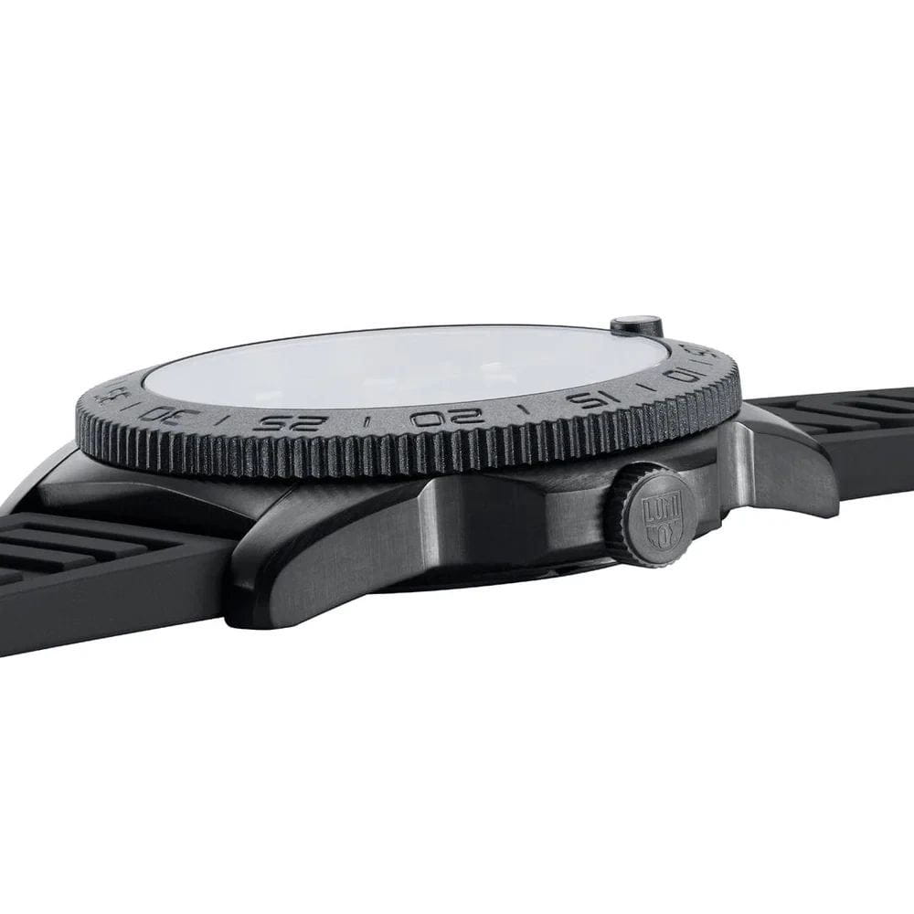 Luminox XS.3135.B — мужская модель серии Pacific Diver, сочетающая надёжность дайверских часов и современный стиль. Корпус диаметром 44 мм выполнен из нержавеющей стали с чёрным PVDPVDУльтратонкое покрытие наносится в технике вакуумного напыления, сочетает в себе нитрид титана особой прочности со слоем золота или оксида хрома. Несёт в себе декоративную или защитную функцию.-покрытием, а односторонний вращающийся безельБезельВнешний ободок, закрепляющий стекло. В спортивных часах так называется поворотное кольцо с делениями на циферблате, выполняет роль таймера – замеряет отрезки времени на шкале. Неподвижный безель – элемент декора. Однонаправленно вращающийся безель на дайверских часах позволяет фиксировать моменты погружения и выныривания на поверхность. из углеродного композита отличается прочностью и лёгкостью. Защитную функцию выполняет сапфировое стеклоСапфировое стеклоПрочный и надёжный материал из кристалла сапфира синтетического происхождения, характеризующийся особой твёрдостью и устойчивостью к царапинам и повреждениям. с антибликовым покрытиемАнтибликовое покрытиеСлой оксида металла в 0,13-0,3 микрон, благодаря которому стекло часов не бликует и не отражает свет. Антибликовое покрытие уменьшает отражение света в 10 раз, обеспечивая отличную читаемость показателей циферблата., обеспечивающим чёткую читаемость в любых условиях. Механизм — швейцарский кварцевый, с индикацией часов, минут, секунд и даты. Водозащита 200 м (20 бар) соответствует профессиональным стандартам для дайвинга. Метки и стрелки покрыты люминесцентным покрытиемЛюминесцентное покрытиеПозволяет считывать показания времени в темноте. Производители наносят на стрелки, часовые индексы, безель или поверхность циферблата светонакопительный состав, дающий холодное свечение. и дополнены системой Luminox Light Technology, которая обеспечивает постоянную подсветку до 25 лет без подзарядки. Модель укомплектована каучуковым ремешком с классической застёжкой, который подчёркивает спортивный характер и удобство при активном использовании.