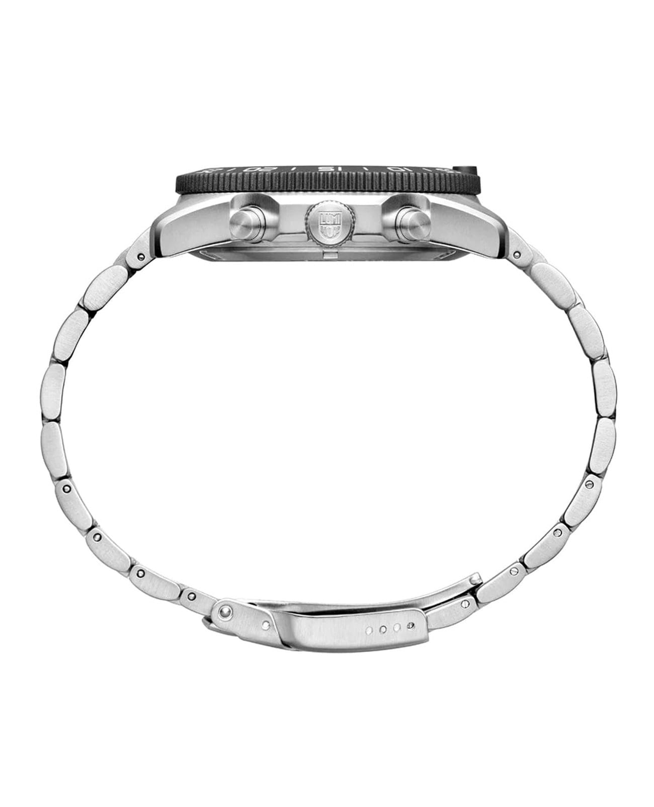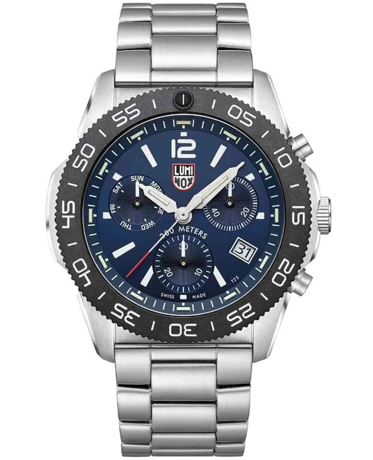 Мужские наручные часы-хронографХронографФункция позволяет измерять отрезки времени с особой точностью: часы, минуты, секунды. Верным признаком хронографа является наличие на циферблате 3 дополнительных окошек-счётчиков. Luminox XS.3144 из коллекции Pacific Diver сочетают в себе спортивный дизайн и надежность швейцарского качества . Модель обладает круглым корпусом диаметром 44 мм, изготовленным из нержавеющей стали с PVD-покрытиемPVDУльтратонкое покрытие наносится в технике вакуумного напыления, сочетает в себе нитрид титана особой прочности со слоем золота или оксида хрома. Несёт в себе декоративную или защитную функцию., что обеспечивает высокую устойчивость к внешним воздействиям и долговечность . Циферблат черного цвета украшен контрастными метками и стрелками с люминесцентным покрытиемЛюминесцентное покрытиеПозволяет считывать показания времени в темноте. Производители наносят на стрелки, часовые индексы, безель или поверхность циферблата светонакопительный состав, дающий холодное свечение., гарантирующим постоянную видимость времени даже в условиях низкой освещенности благодаря системе LLTLLTLLT — это автономный механизм подсветки, основанный на использовании микроскопических газонаполненных элементов. Специальные герметичные капсулы из боросиликатного стекла, интегрированные в циферблат, генерируют свечение без необходимости подключения к внешним источникам энергии. Для их работы не требуется ни дополнительный свет, ни механическое воздействие (например, нажатие кнопки). Свечение возникает благодаря химическому процессу: реакция между тритием, заключенным в капсулах, и люминофорным покрытием создает стабильное автономное освещение. Технология обеспечивает энергетическую независимость и долговечность подсветки. (микрогазовые огни) . Часы оснащены кварцевым механизмом швейцарского производства Ronda 515, обеспечивающим точность хода ±15 секунд в месяц . Защиту циферблата обеспечивает прочное сапфировое стеклоСапфировое стеклоПрочный и надёжный материал из кристалла сапфира синтетического происхождения, характеризующийся особой твёрдостью и устойчивостью к царапинам и повреждениям. с антибликовым покрытиемАнтибликовое покрытиеСлой оксида металла в 0,13-0,3 микрон, благодаря которому стекло часов не бликует и не отражает свет. Антибликовое покрытие уменьшает отражение света в 10 раз, обеспечивая отличную читаемость показателей циферблата., устойчивое к царапинам и механическим повреждениям . Водонепроницаемость модели достигает 20 атмосфер (200 метров), что делает их подходящими для плавания и активного отдыха на воде, включая дайвинг . Модель также оснащена безелемБезельВнешний ободок, закрепляющий стекло. В спортивных часах так называется поворотное кольцо с делениями на циферблате, выполняет роль таймера – замеряет отрезки времени на шкале. Неподвижный безель – элемент декора. Однонаправленно вращающийся безель на дайверских часах позволяет фиксировать моменты погружения и выныривания на поверхность. с односторонним вращением, что добавляет функциональности при использовании в водных условиях . Стальной браслет на раскладной застёжкеРаскладная застёжкаТакой тип застёжки используется только на браслетах из металла. Она никогда не раскрывается полностью, происходит разделение на 2 и более частей.