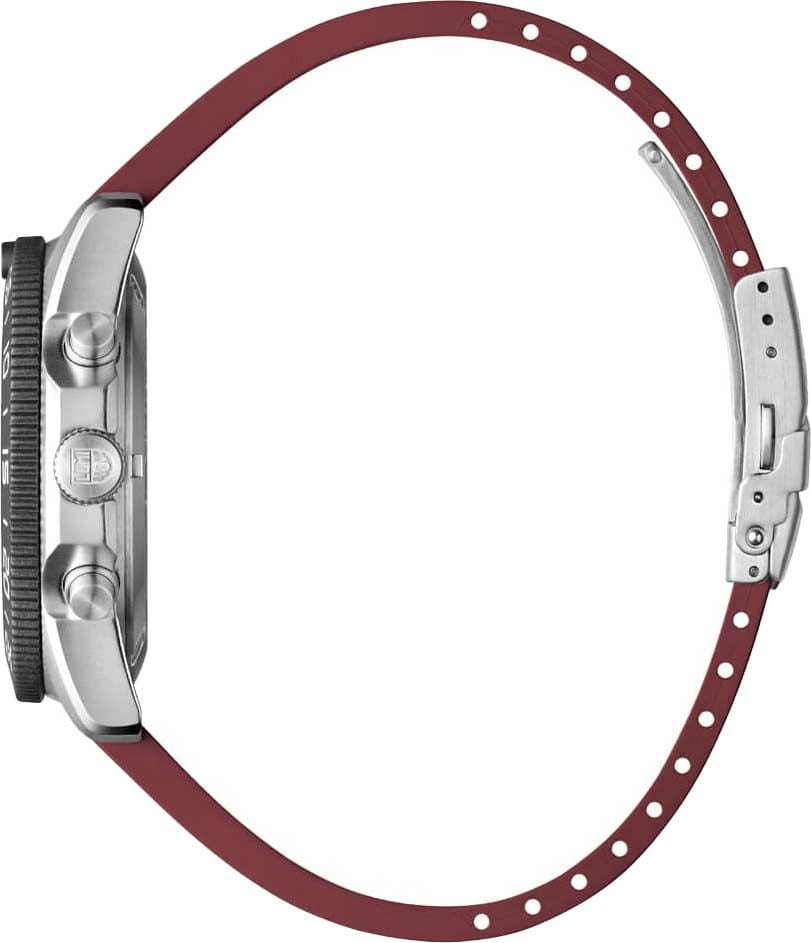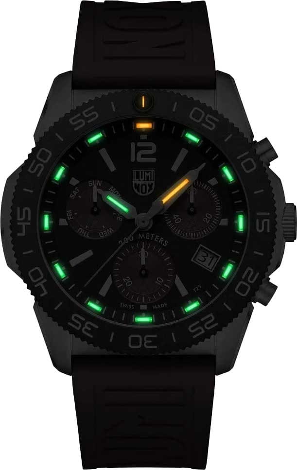 Швейцарские наручные часы Luminox Pacific Diver Chronograph XS.3155.1 – это идеальный симбиоз стиля и высокой функциональности. Оснащенные высокоточным кварцевым механизмом, они гарантируют безупречное времяизмерение и надежность в любом случае. Часы-хронографХронографФункция позволяет измерять отрезки времени с особой точностью: часы, минуты, секунды. Верным признаком хронографа является наличие на циферблате 3 дополнительных окошек-счётчиков. обладают функцией секундомераСекундомерСекундоме́р — прибор, способный измерять интервалы времени с точностью до долей секунды., что делает их практичными в использовании. Циферблат этих часов защищен сапфировым стекломСапфировое стеклоПрочный и надёжный материал из кристалла сапфира синтетического происхождения, характеризующийся особой твёрдостью и устойчивостью к царапинам и повреждениям. с антибликовым покрытиемАнтибликовое покрытиеСлой оксида металла в 0,13-0,3 микрон, благодаря которому стекло часов не бликует и не отражает свет. Антибликовое покрытие уменьшает отражение света в 10 раз, обеспечивая отличную читаемость показателей циферблата., которое славится своей прочностью и устойчивостью к царапинам, обеспечивая кристально чистый обзор. Корпус часов выполнен из качественной стали, что свидетельствует о долговечности и прочности изделия. Стрелки с LLTLLTLLT — это автономный механизм подсветки, основанный на использовании микроскопических газонаполненных элементов. Специальные герметичные капсулы из боросиликатного стекла, интегрированные в циферблат, генерируют свечение без необходимости подключения к внешним источникам энергии. Для их работы не требуется ни дополнительный свет, ни механическое воздействие (например, нажатие кнопки). Свечение возникает благодаря химическому процессу: реакция между тритием, заключенным в капсулах, и люминофорным покрытием создает стабильное автономное освещение. Технология обеспечивает энергетическую независимость и долговечность подсветки.-подсветкой, обеспечивают отличную видимость даже в условиях недостаточной освещенности, что делает их удобными для использования в любых условиях. Дополнительно часы располагают окошком даты в положении 4 часа, позволяющим быстро и удобно отслеживать текущую дату. Их внушительный класс водозащиты в 200 метров делает их идеальными для любителей водных видов спорта, таких как плавание и ныряние, не беспокоясь о повреждении механизма. Каучуковый ремешок, надёжно фиксирующий часы на запястье с помощью раскладной застёжкиРаскладная застёжкаТакой тип застёжки используется только на браслетах из металла. Она никогда не раскрывается полностью, происходит разделение на 2 и более частей. Раскладывающая застёжка снизит вероятность потери часов к минимуму., обеспечивает комфортное ношение в течение всего дня. Стильный вращающийся безельБезельВнешний ободок, закрепляющий стекло. В спортивных часах так называется поворотное кольцо с делениями на циферблате, выполняет роль таймера – замеряет отрезки времени на шкале. Неподвижный безель – элемент декора. Однонаправленно вращающийся безель на дайверских часах позволяет фиксировать моменты погружения и выныривания на поверхность., изготовленный из карбонаКарбонОт «carbon», «carbone» - углерод, углепластик - полимерный композиционный материал из переплет