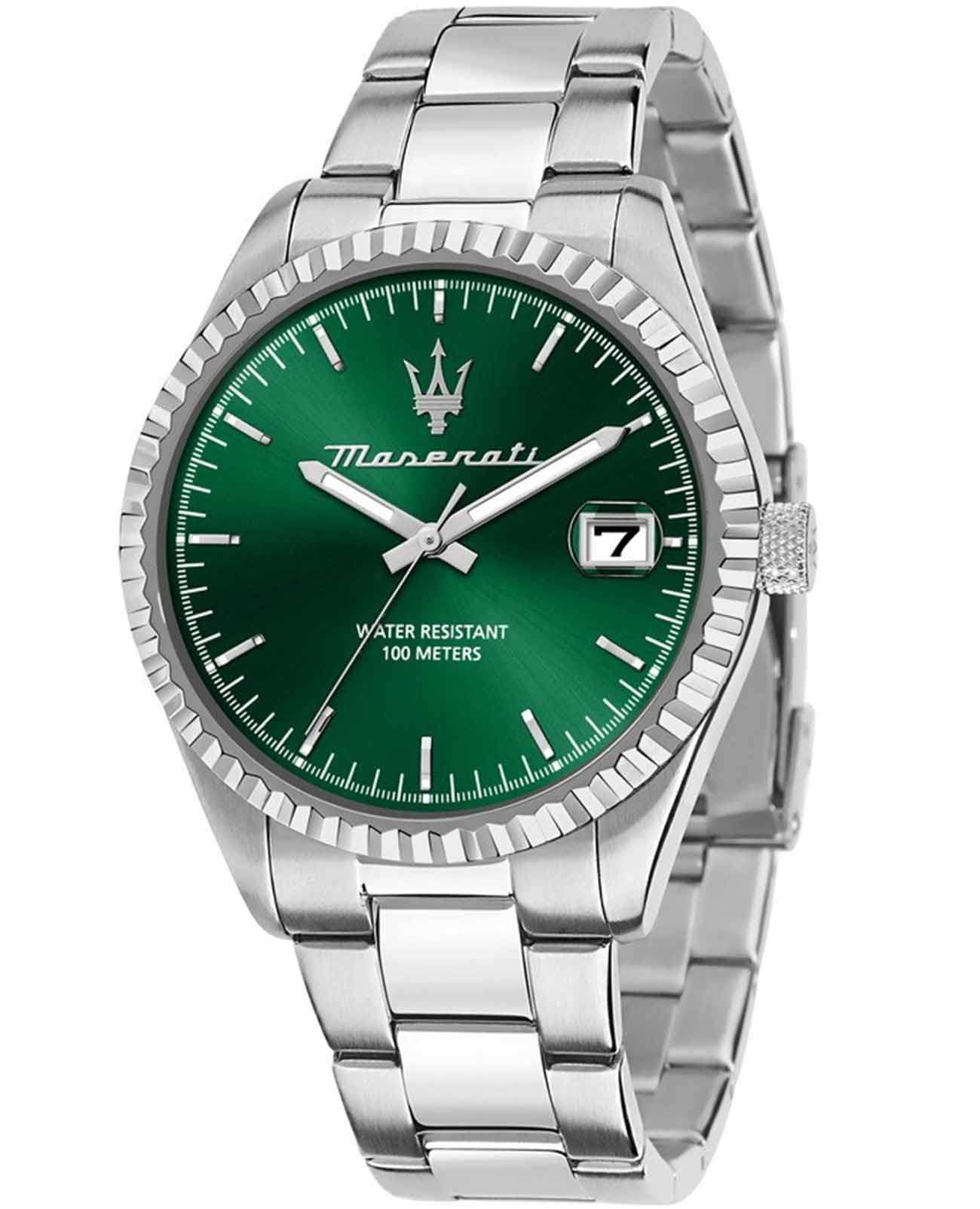 Часы Maserati Competizione R8853100043 отличаются стильным и современным дизайном, идеально подходящим для деловых и повседневных образов. Эти наручные часы оснащены надёжным кварцевым механизмом, который обеспечивает высокую точность показаний времени. Корпус часов диаметром 43 мм выполнен из прочной стали, что гарантирует долговечность и устойчивость к внешним воздействиям. Минеральное стеклоМинеральное стеклоМинеральное стекло представляет собой искусственно выращенный минерал кварца. Такое стекло отличается особой устойчивостью к повреждениям и царапинам. Уступает по некоторым качествам сапфировому стеклу. защищает зелёный циферблат, на котором расположены изящные риски, создавая элегантный и утончённый вид. Часы обладают водостойкостью до 100 метров (10 АТМ), что позволяет не беспокоиться о попадании влаги при плавании или занятиях водными видами спорта. Стальной браслет с раскладной застёжкойРаскладная застёжкаТакой тип застёжки используется только на браслетах из металла. Она никогда не раскрывается полностью, происходит разделение на 2 и более частей. Раскладывающая застёжка снизит вероятность потери часов к минимуму. не только обеспечивает комфортное ношение, но и придаёт аксессуару дополнительную элегантность, подчёркивая его современный стиль. Люминесцентное покрытиеЛюминесцентное покрытиеПозволяет считывать показания времени в темноте. Производители наносят на стрелки, часовые индексы, безель или поверхность циферблата светонакопительный состав, дающий холодное свечение. на стрелках обеспечивает отличную видимость в темноте, а окошко даты с днем недели, расположенное в позиции 3 часа, добавляет практичности. Эти часы станут отличным дополнением к вашему гардеробу, сочетая в себе функциональность и изысканный дизайн.