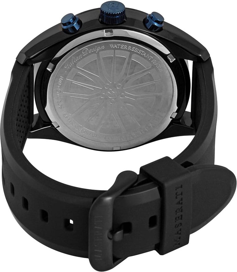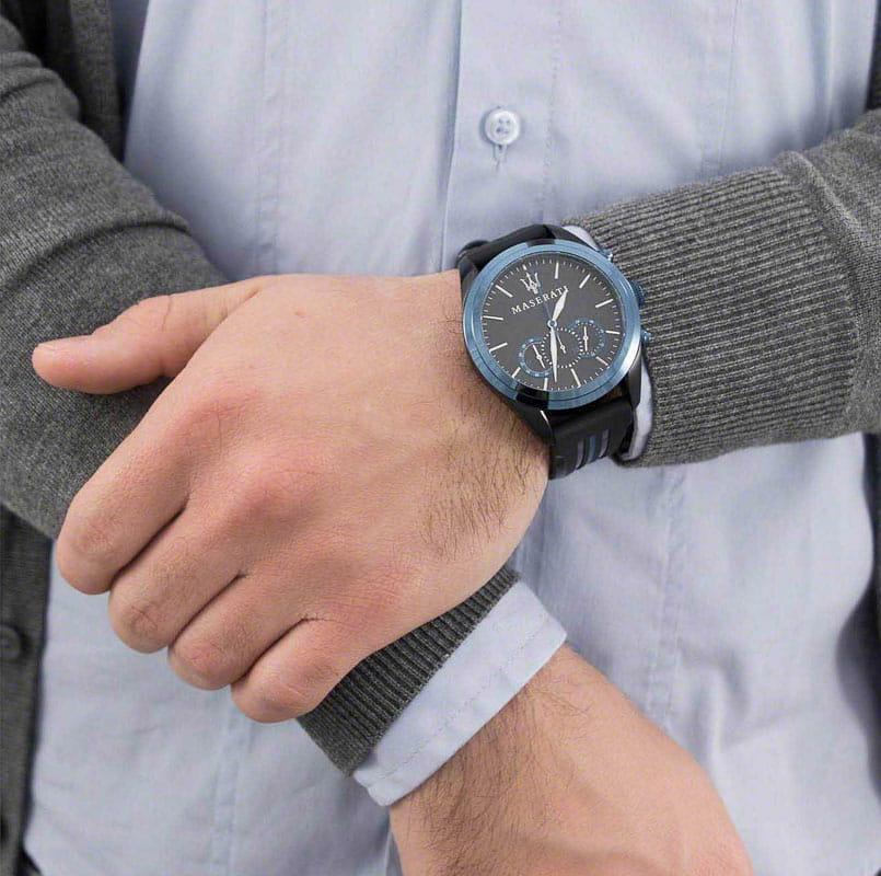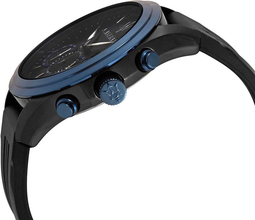 Мужские наручные часы-хронографХронографФункция позволяет измерять отрезки времени с особой точностью: часы, минуты, секунды. Верным признаком хронографа является наличие на циферблате 3 дополнительных окошек-счётчиков. Maserati R8871612006, кварцевый механизм (автоматический калибр) с высокой точностью. Минеральное стеклоМинеральное стеклоМинеральное стекло представляет собой искусственно выращенный минерал кварца. Такое стекло отличается особой устойчивостью к повреждениям и царапинам. Уступает по некоторым качествам сапфировому стеклу. устойчивое к появлению царапин, обладающее высокой прозрачностью. Стрелки с люминесцентным покрытиемЛюминесцентное покрытиеПозволяет считывать показания времени в темноте. Производители наносят на стрелки, часовые индексы, безель или поверхность циферблата светонакопительный состав, дающий холодное свечение.. Класс водозащиты: 100 метров, позволит плавать, нырять и заниматься другими водными видами спорта. Корпус часов изготовлен из нержавеющей стали с PVD-покрытиемPVDУльтратонкое покрытие наносится в технике вакуумного напыления, сочетает в себе нитрид титана особой прочности со слоем золота или оксида хрома. Несёт в себе декоративную или защитную функцию.. Каучуковый ремешок с классической застежкой.