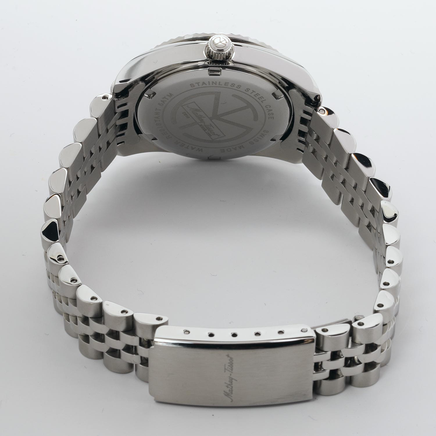 Женские кварцевые часы Mathey-Tissot Rolly D810AN — это стильное сочетание элегантности и современного дизайна. Изящный корпус выполнен из нержавеющей стали, диаметром 30 мм, что придаст образу женственности и романтизма. Изысканный циферблат с метками в виде точек придает модели особый блеск. Циферблат защищен минеральным стекломМинеральное стеклоМинеральное стекло представляет собой искусственно выращенный минерал кварца. Такое стекло отличается особой устойчивостью к повреждениям и царапинам. Уступает по некоторым качествам сапфировому стеклу., обеспечивающий устойчивость к царапинам. Стрелки с люминесцентным покрытиемЛюминесцентное покрытиеПозволяет считывать показания времени в темноте. Производители наносят на стрелки, часовые индексы, безель или поверхность циферблата светонакопительный состав, дающий холодное свечение.. Рифленый безельБезельВнешний ободок, закрепляющий стекло. В спортивных часах так называется поворотное кольцо с делениями на циферблате, выполняет роль таймера – замеряет отрезки времени на шкале. Неподвижный безель – элемент декора. Однонаправленно вращающийся безель на дайверских часах позволяет фиксировать моменты погружения и выныривания на поверхность. серебристого цвета. Циферблат украшен кристаллами. Окошко даты находится в положении 3 часа. Часы оснащены надежным кварцевым механизмом. Стальной браслет на раскладной застёжкеРаскладная застёжкаТакой тип застёжки используется только на браслетах из металла. Она никогда не раскрывается полностью, происходит разделение на 2 и более частей. Раскладывающая застёжка снизит вероятность потери часов к минимуму., гарантирует комфортное и безопасное ношение. Класс водозащиты: 50 метров позволит защитить корпус от случайных брызг или капель дождя. Mathey-Tissot — отличный выбор для тех, кто ценит утонченность и качество.