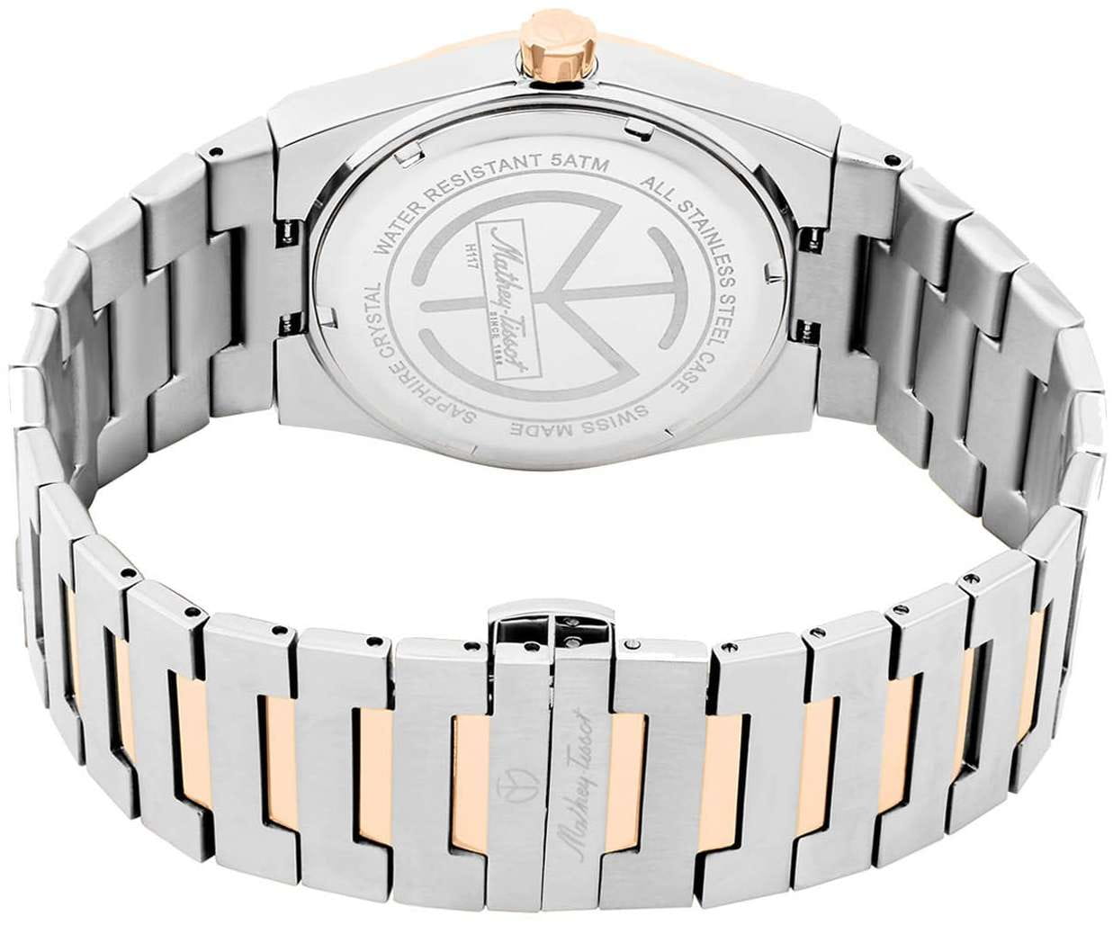 Мужские кварцевые часы Mathey-Tissot Zoltan H117RS — это стильное сочетание элегантности и современного дизайна. Изящный корпус выполнен из нержавеющей стали, диаметром 42 мм, что придаст образу элегантности и надежности. Изысканный циферблат с метками в виде штрихов придает модели особый блеск. Циферблат защищен сапфировым стекломСапфировое стеклоПрочный и надёжный материал из кристалла сапфира синтетического происхождения, характеризующийся особой твёрдостью и устойчивостью к царапинам и повреждениям., обеспечивающий устойчивость к царапинам. Неподвижный безельБезельВнешний ободок, закрепляющий стекло. В спортивных часах так называется поворотное кольцо с делениями на циферблате, выполняет роль таймера – замеряет отрезки времени на шкале. Неподвижный безель – элемент декора. Однонаправленно вращающийся безель на дайверских часах позволяет фиксировать моменты погружения и выныривания на поверхность. с PVD-покрытиемPVDУльтратонкое покрытие наносится в технике вакуумного напыления, сочетает в себе нитрид титана особой прочности со слоем золота или оксида хрома. Несёт в себе декоративную или защитную функцию. цвета розового золота. Стрелки и метки с люминесцентным покрытиемЛюминесцентное покрытиеПозволяет считывать показания времени в темноте. Производители наносят на стрелки, часовые индексы, безель или поверхность циферблата светонакопительный состав, дающий холодное свечение.. Окошко даты находится в положении 3 часа. Часы оснащены надежным кварцевым механизмом. Стальной браслет с частичным PVD-покрытиемPVDУльтратонкое покрытие наносится в технике вакуумного напыления, сочетает в себе нитрид титана особой прочности со слоем золота или оксида хрома. Несёт в себе декоративную или защитную функцию. на застёжке-бабочке с кнопкамиЗастёжка "бабочка"Такой вид застёжки дополняется предохранителями, помогающими избежать случайного раскрытия браслета. Обладают изящным исполнением. , гарантирует комфортное и безопасное ношение. Класс водозащиты: 50 метров позволит защитить корпус от случайных брызг или капель дождя. Mathey-Tissot  — отличный выбор для тех, кто ценит утонченность и качество.