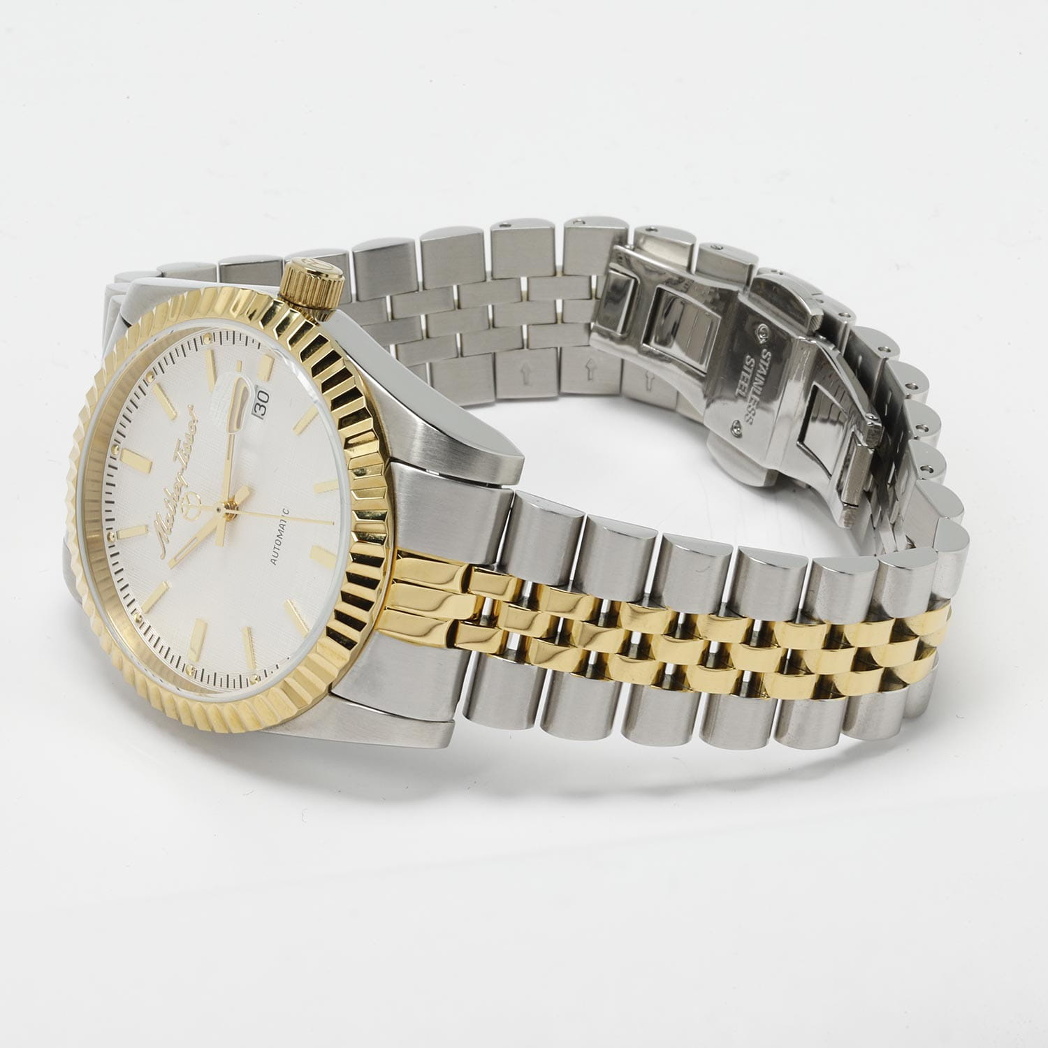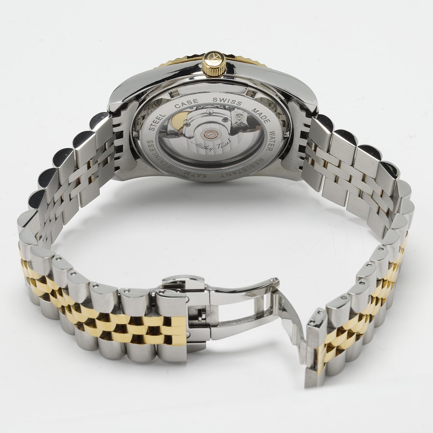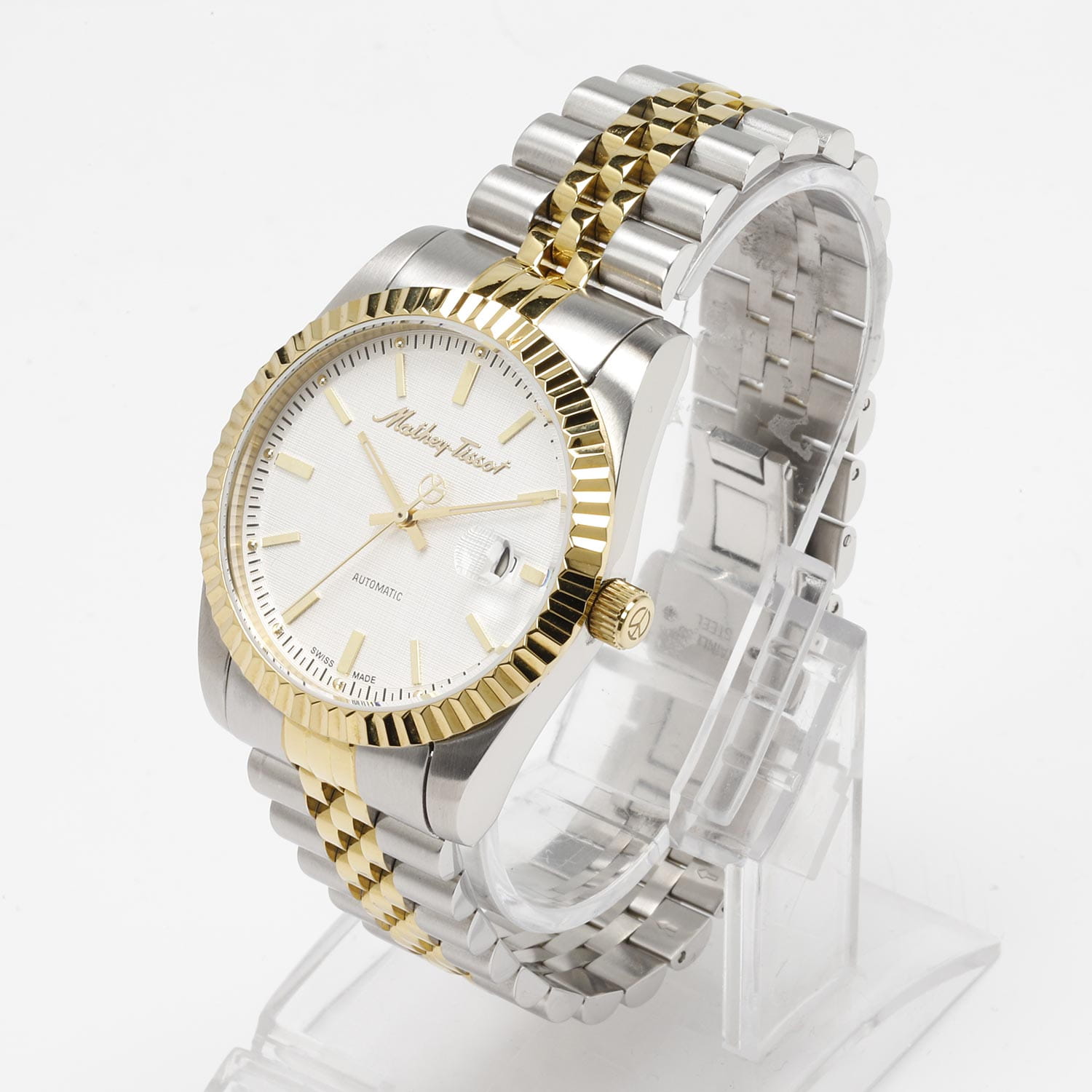 Мужские механические часы с автоподзаводом Mathey-Tissot Mathy H1810ATBI — это стильное сочетание элегантности и современного дизайна. Изящный корпус выполнен из нержавеющей стали, диаметром 42 мм, что придаст образу элегантности и надежности. Изысканный циферблат с метками в виде штрихов придает модели особый блеск. Циферблат защищен минеральным стекломМинеральное стеклоМинеральное стекло представляет собой искусственно выращенный минерал кварца. Такое стекло отличается особой устойчивостью к повреждениям и царапинам. Уступает по некоторым качествам сапфировому стеклу. с сапфировым покрытием, обеспечивает устойчивость к царапинам. БезельБезельВнешний ободок, закрепляющий стекло. В спортивных часах так называется поворотное кольцо с делениями на циферблате, выполняет роль таймера – замеряет отрезки времени на шкале. Неподвижный безель – элемент декора. Однонаправленно вращающийся безель на дайверских часах позволяет фиксировать моменты погружения и выныривания на поверхность. с PVD-покрытиемPVDУльтратонкое покрытие наносится в технике вакуумного напыления, сочетает в себе нитрид титана особой прочности со слоем золота или оксида хрома. Несёт в себе декоративную или защитную функцию. золотистого цвета. Стрелки с люминесцентным покрытиемЛюминесцентное покрытиеПозволяет считывать показания времени в темноте. Производители наносят на стрелки, часовые индексы, безель или поверхность циферблата светонакопительный состав, дающий холодное свечение.. Окошко даты находится в положении 3 часа. Стальной браслет с частичным PVD-покрытиемPVDУльтратонкое покрытие наносится в технике вакуумного напыления, сочетает в себе нитрид титана особой прочности со слоем золота или оксида хрома. Несёт в себе декоративную или защитную функцию. на застёжке-бабочке с кнопкамиЗастёжка "бабочка"Такой вид застёжки дополняется предохранителями, помогающими избежать случайного раскрытия браслета. Обладают изящным исполнением. , гарантирует комфортное и безопасное ношение. Рифленая заводная головка. Класс водозащиты: 50 метров позволит защитить корпус от случайных брызг или капель дождя. Mathey-Tissot  — отличный выбор для тех, кто ценит утонченность и качество.